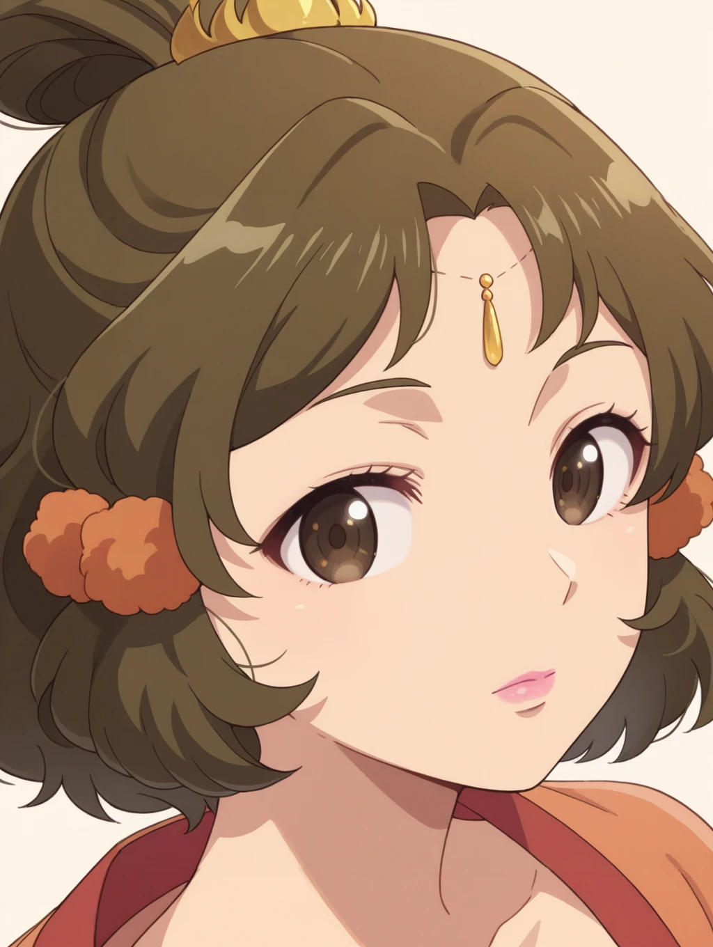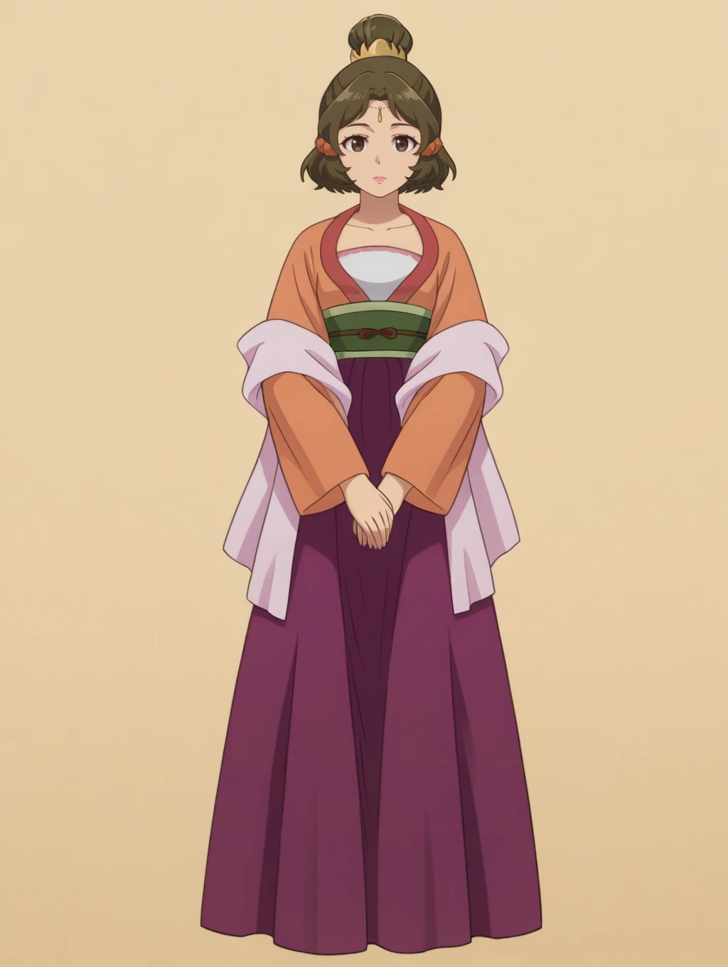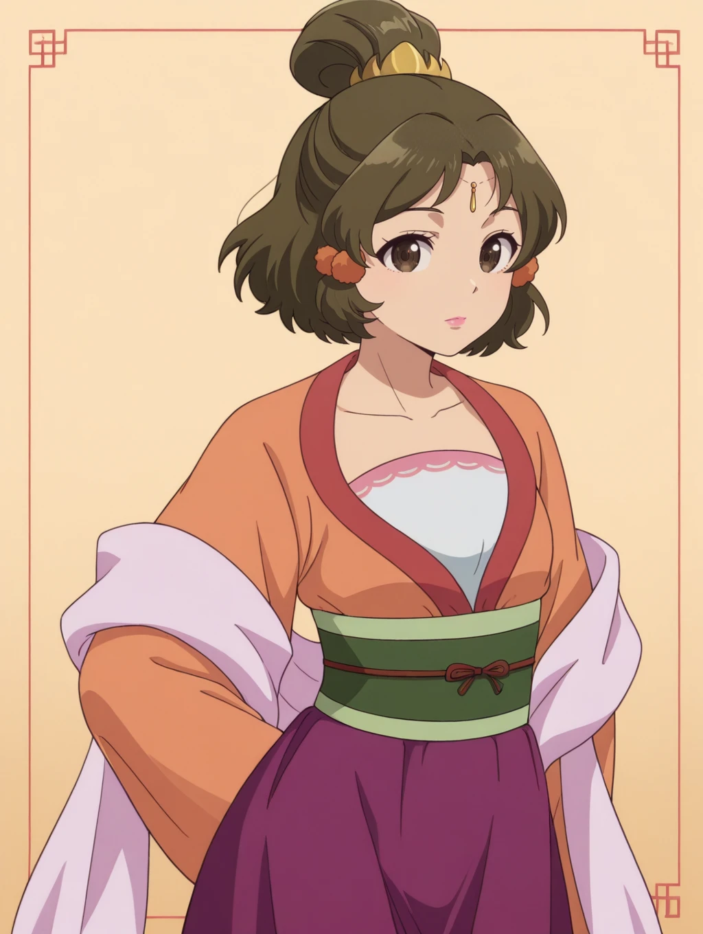 ywgy,brown hair,short hair,brown eyes,updo,hair scrunchie,hair ornament,forehead jewel,pink lips,orange hanfu,pink shawl,green sash,purple skirt,