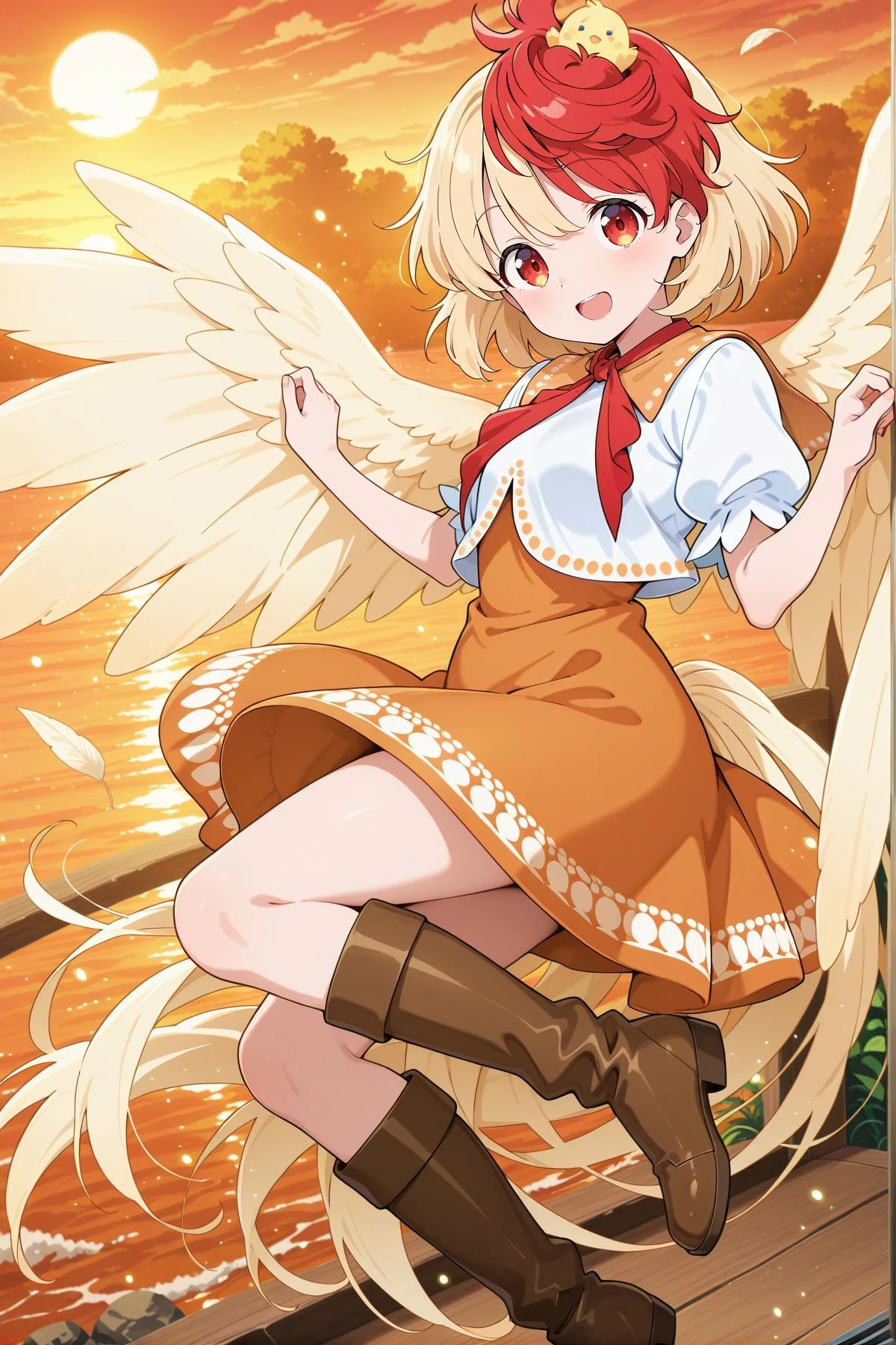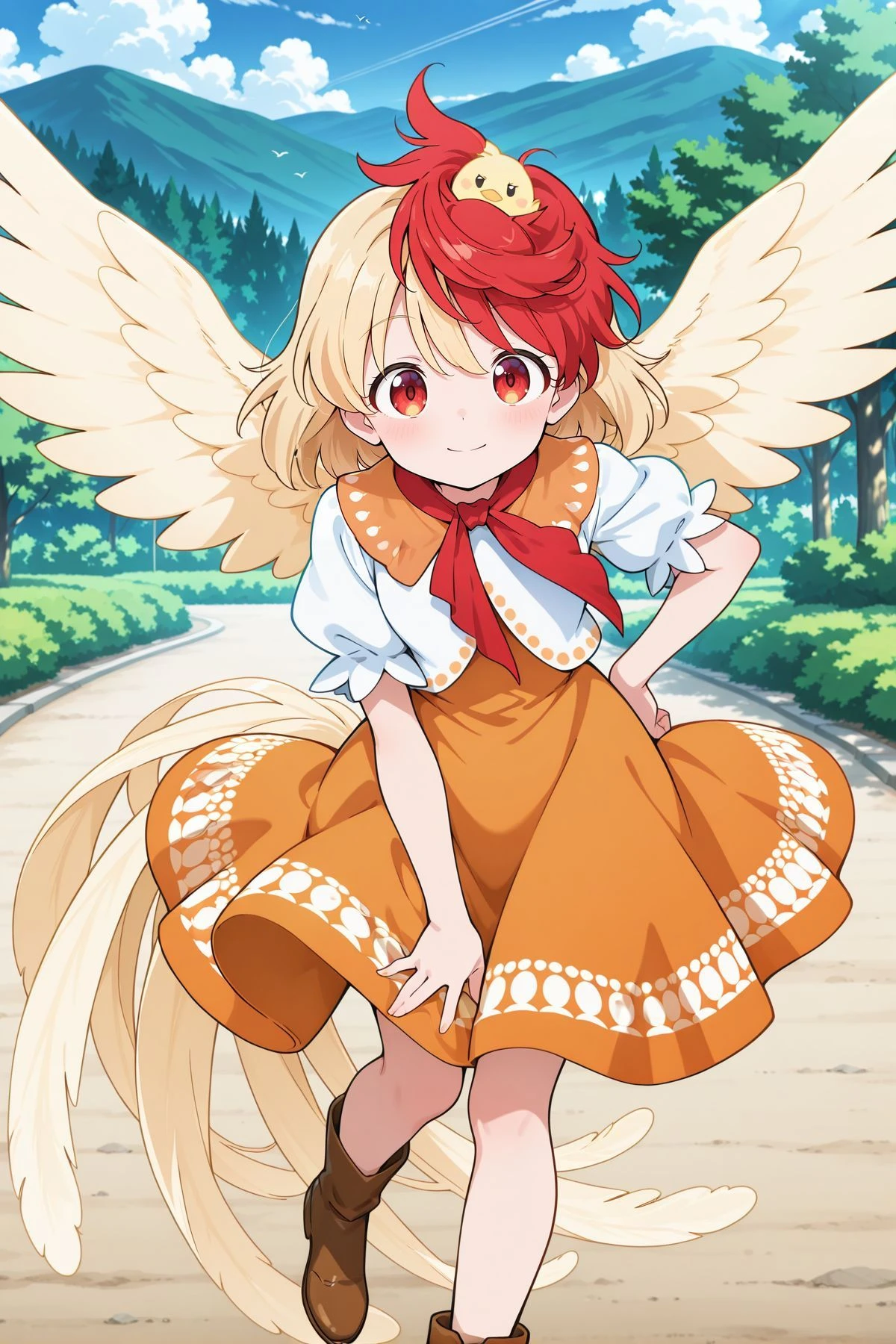 niwatari kutaka, 1girl, solo, red eyes, two-tone hair, blonde hair, red hair, short hair, bird tail, bird wings, yellow wings, bird on head, chick,red neckerchief, white shirt, puffy short sleeves, orange dress, brown boots,Alternative :