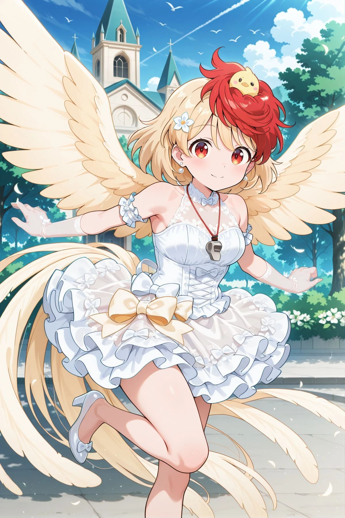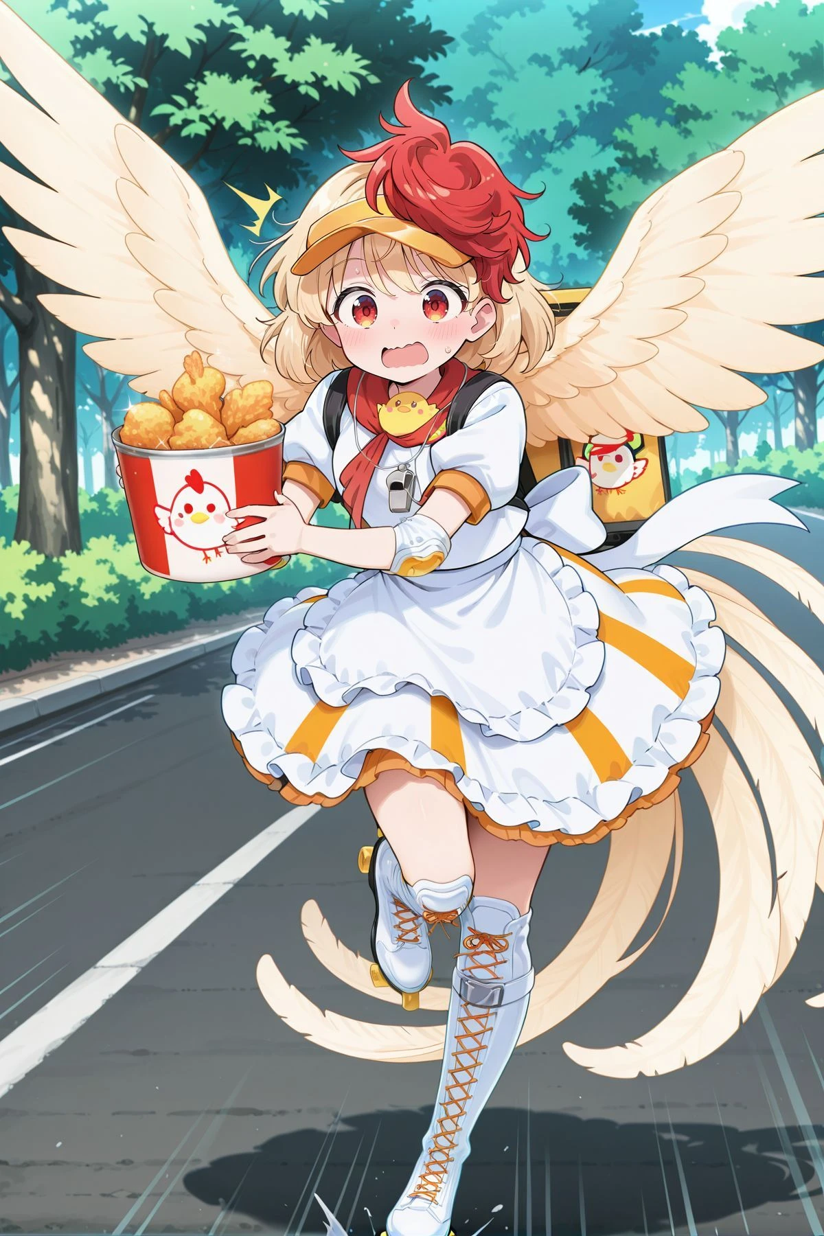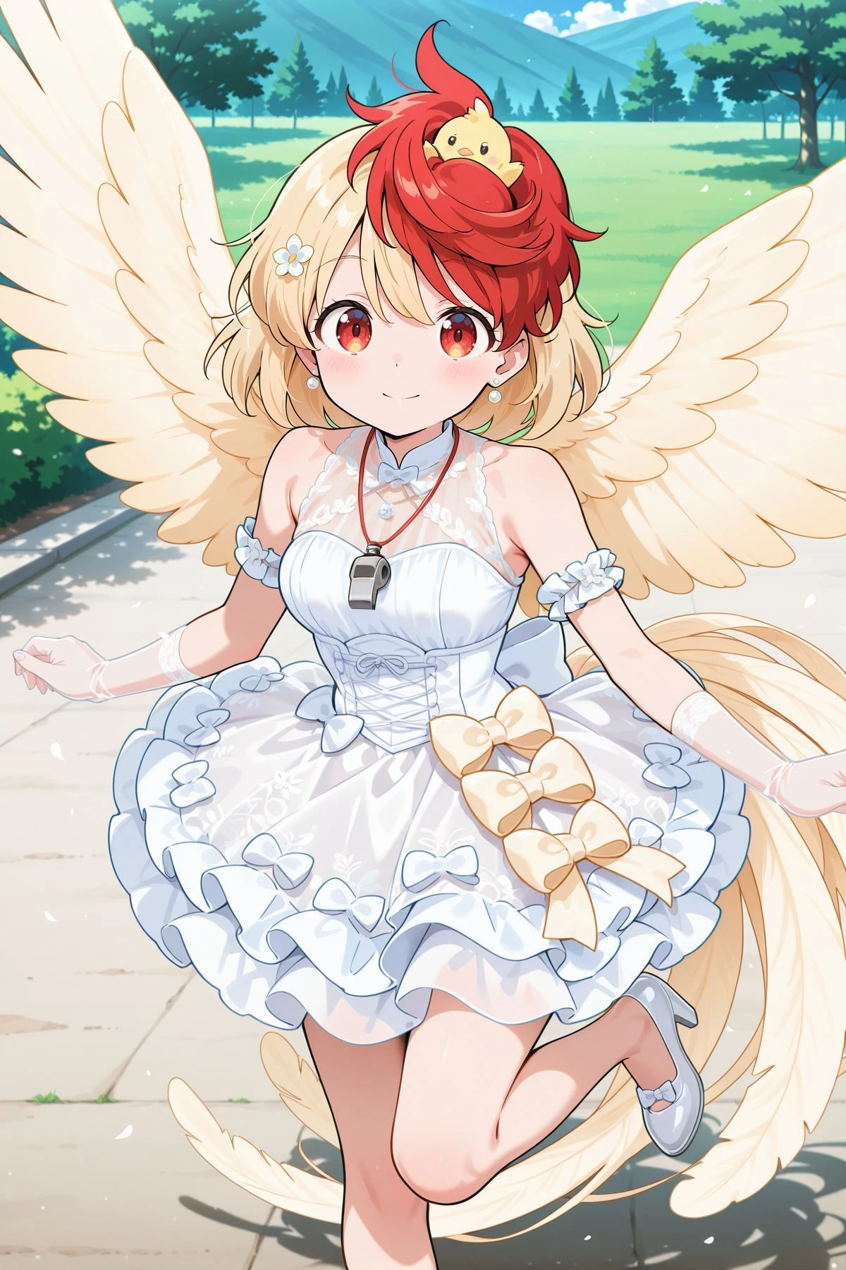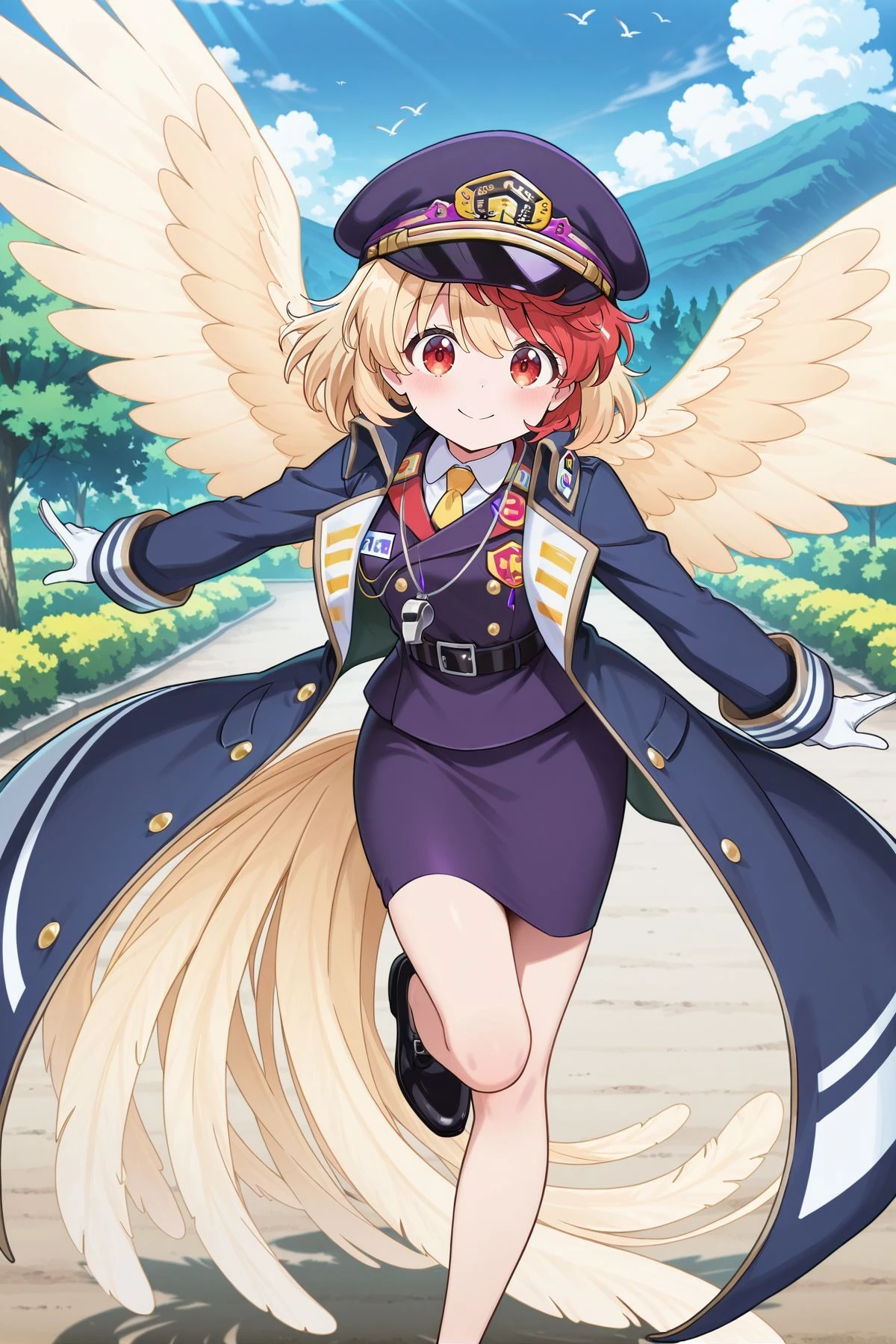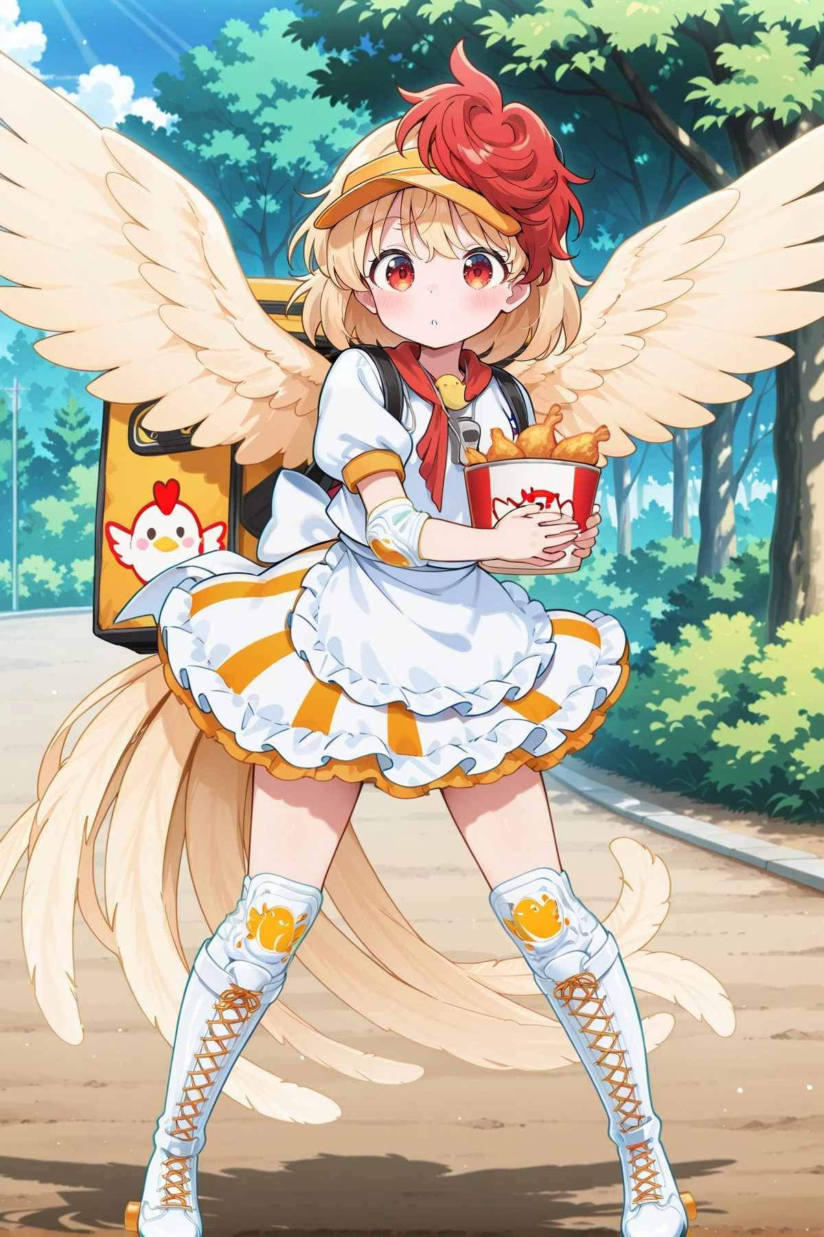 niwatari kutaka, 1girl, solo, red eyes, two-tone hair, blonde hair, red hair, short hair, bird tail, bird wings, yellow wings, niwatari kutaka \(underground waste ward aligner\), alternate costume, black hat, peaked cap, bird on head, chick, blue coat, long coat, long sleeves, open coat, black shirt, white gloves, pencil skirt, black skirt, black belt, ???? legs, black shoes, holding whistle, blowing whistle,niwatari kutaka, 1girl, solo, red eyes, two-tone hair, blonde hair, red hair, short hair, bird tail, bird wings, yellow wings, niwatari kutaka \(come get your christmas chicken\), alternate costume, red hat, santa hat, green jacket, long sleeves, open jacket, two-tone shirt, white shirt, orange shirt, vertical-striped shirt, two-tone skirt, blue skirt, checkered skirt, green skirt, red pantyhose, white shoes, sneakers, name tag,niwatari kutaka, 1girl, solo, red eyes, two-tone hair, blonde hair, red hair, short hair, bird tail, bird wings, yellow wings, niwatari kutaka \(crispy chicken delivery\), alternate costume, two-tone dress, white dress, vertical stripes, orange dress, puffy short sleeves, frilled dress, frilled apron, waist apron, white apron, back bow, white bow, white footwear, cross-laced footwear, backpack, delivery, holding bucket, roller skates, whistle around neck,niwatari kutaka, 1girl, solo, red eyes, two-tone hair, blonde hair, red hair, short hair, bird tail, bird wings, yellow wings, alternate costume, bird on head, chick, hair flower, hair ornament, earrings, white dress, wedding dress, sleeveless dress, frilled dress, whistle around neck, white bow, bow on wing, corset, see-through gloves, white gloves, high heels, Optional :