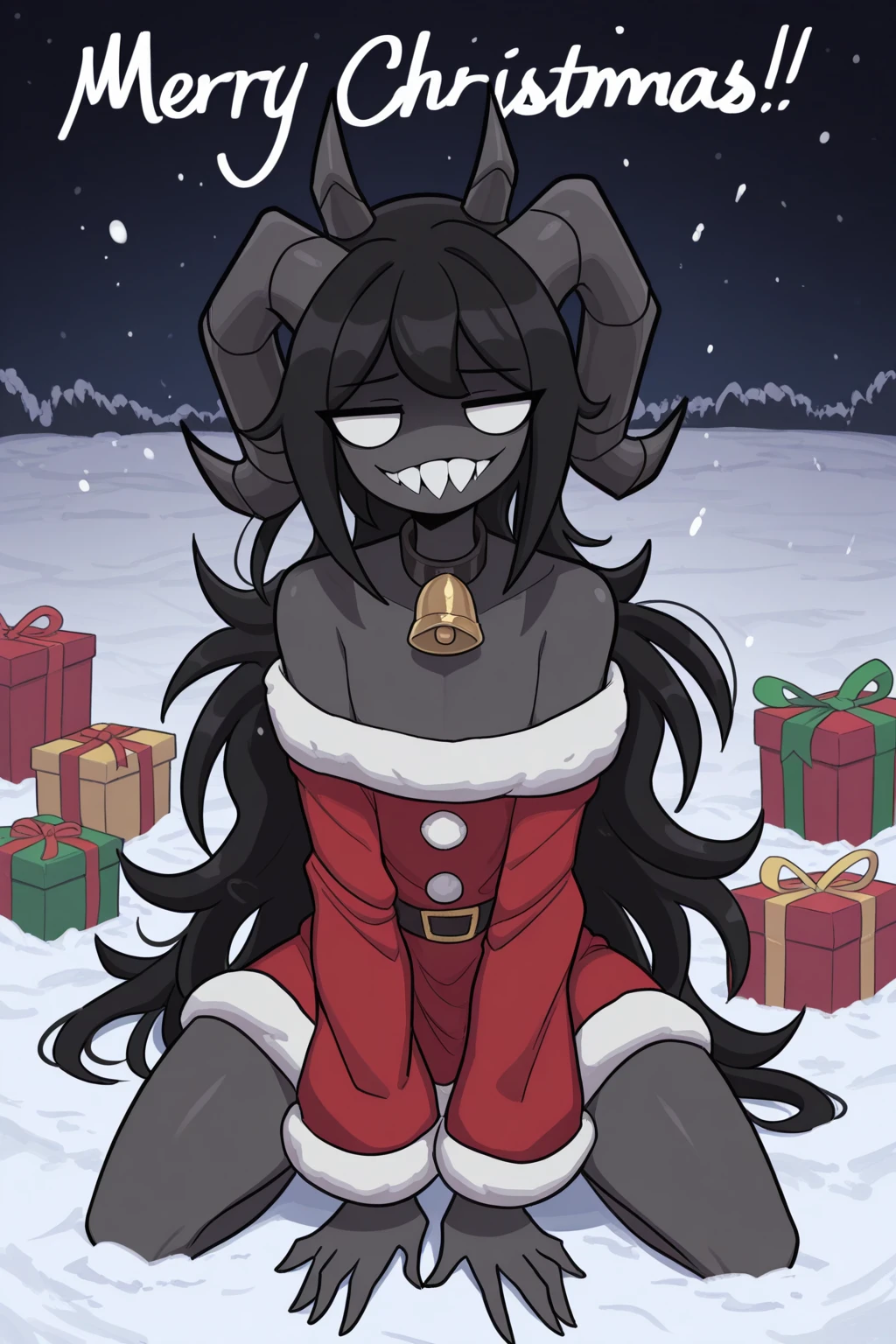 thesirentboi, 1girl, blank eyes, no pupils, jitome, black hair, very long hair, colored skin, demon horns, grey horns, sharp teeth