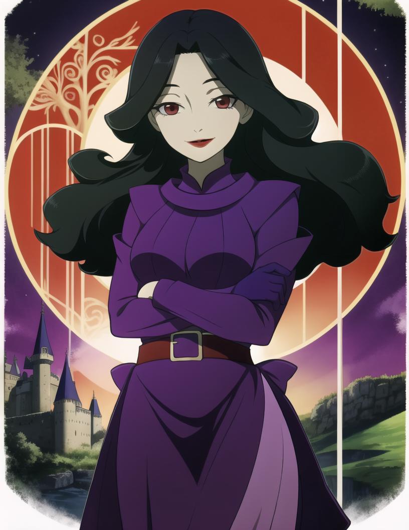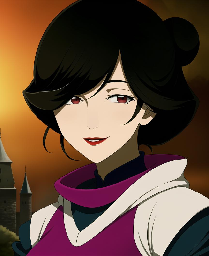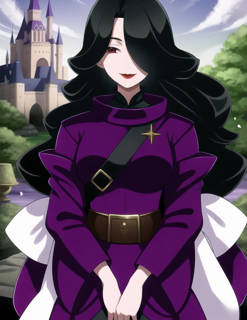 DoreneEzelcant,red eyes, black hair, wavy hair, red lips, hair over one eye