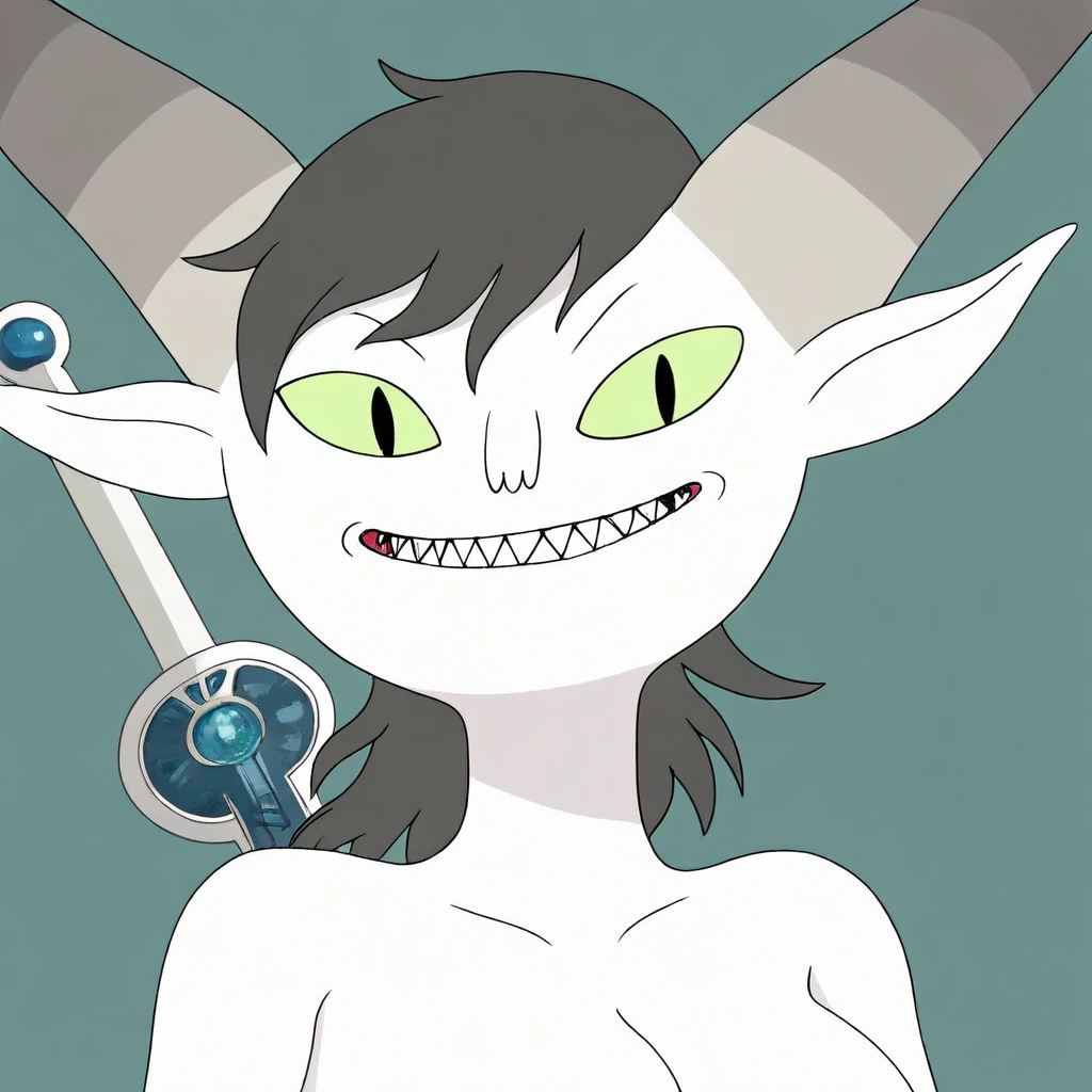 monster female, solo, white skin, green sclera, black slit pupil, black eye, dark gray hair, large gradient horns, large gray striped horns, sharp teeth, four fingers, long dark gray toed socks, light blue dress/robe with dark blue accents,