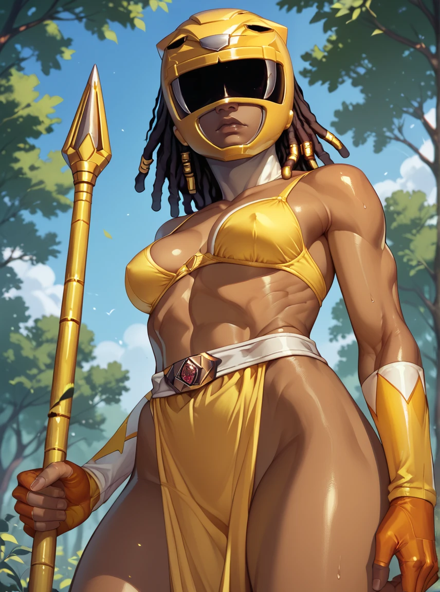 Aisha, yellow bodysuit, female dreadlock, white gloves, yellow power ranger, 1dark skinned girl, solo, medium breasts, tokusatsu, mighty morphin power rangers