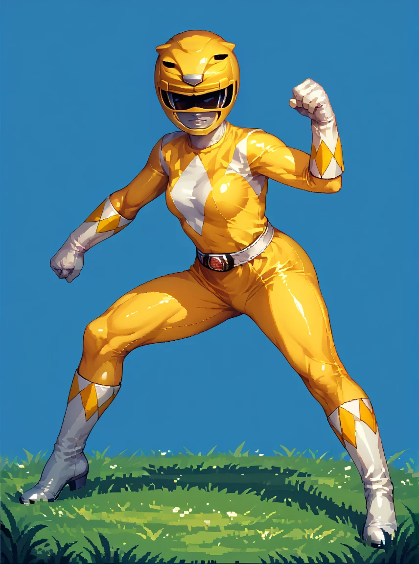 yellow bodysuit, white gloves, yellow power ranger, yellow ranger helmet, 1boy, muscular, solo, tokusatsu, mighty morphin power rangers