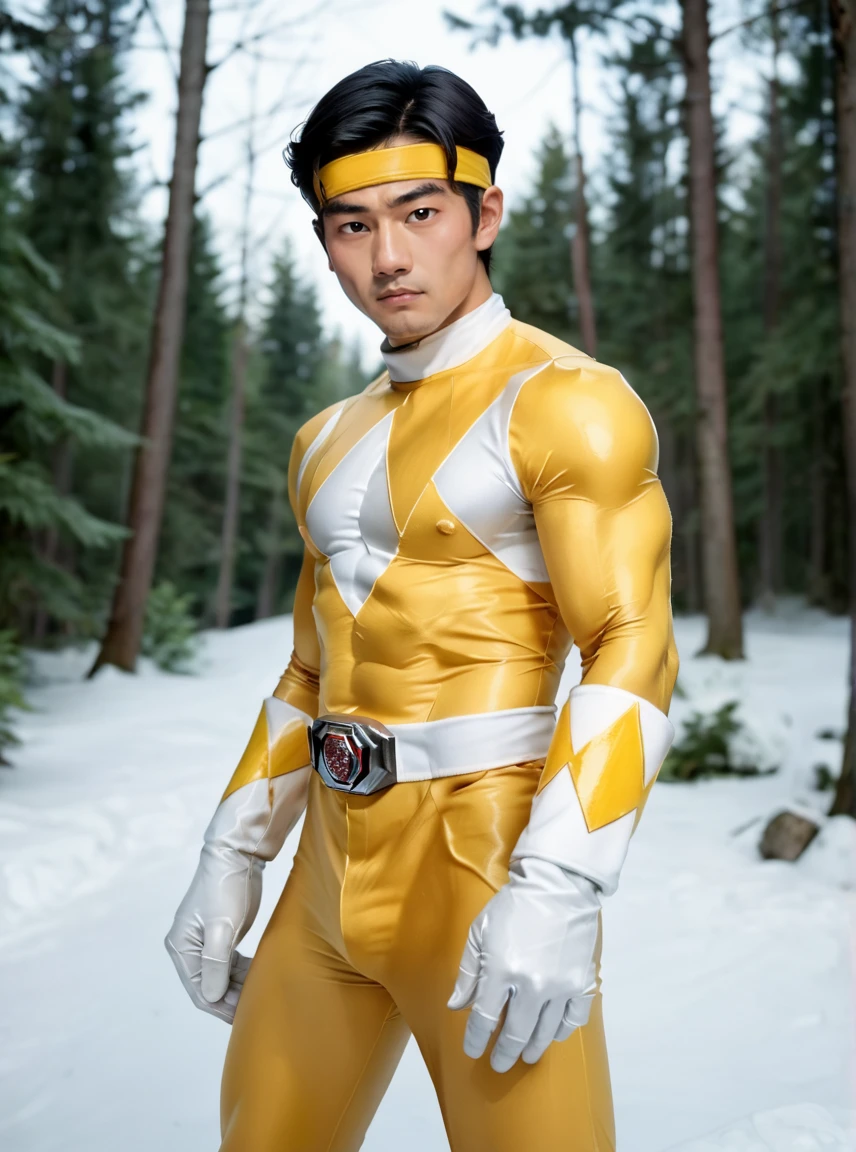 Boi, yellow bodysuit, black hair, white gloves, yellow power ranger, 1boy, solo, Asian boy, yellow headband, muscular, tokusatsu, mighty morphin power rangers