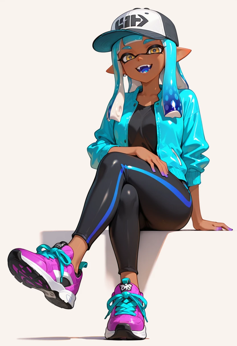 inkling, 1girl, solo, hood, pointy ears, purple hair, hat, purple eyes, hoodie, fangs, smile, long hair, colored tongue, open mouth, bangs, looking at viewer, long sleeves, v, upper body, purple headwear, simple background, blunt bangs, hood down, beanie, black hoodieNegative