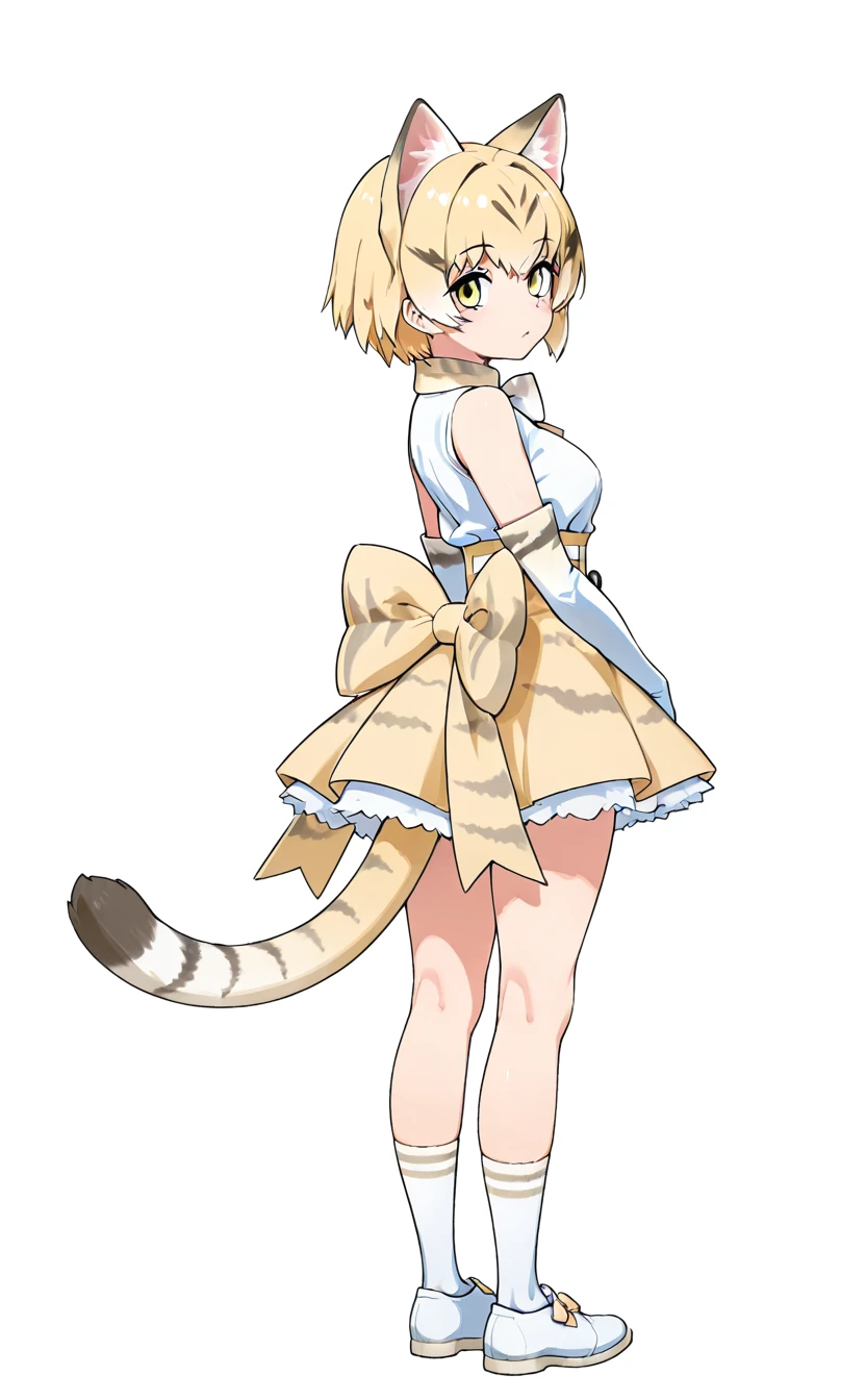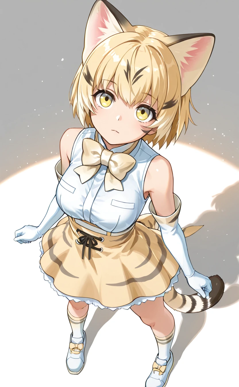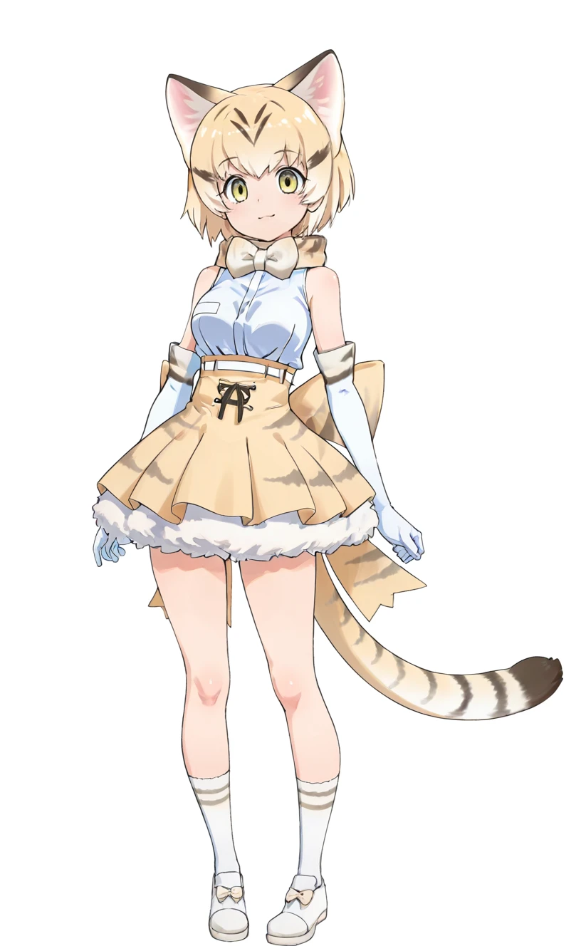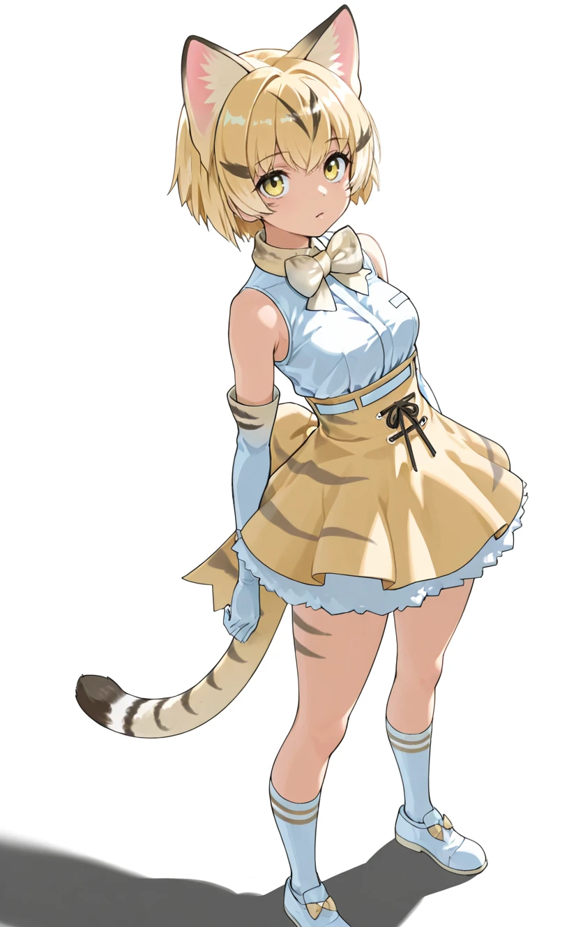 cat ears, hair markings, blonde hair, short hair, yellow eyes, cat tail, tail markings, white sleeveless shirt, bowtie, elbow gloves, high-waist skirt, socks, white shoes