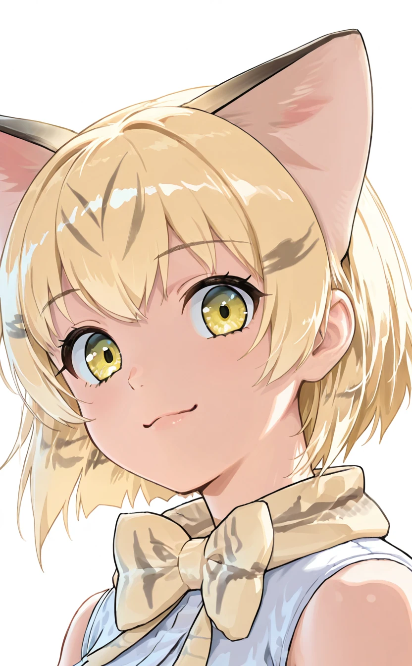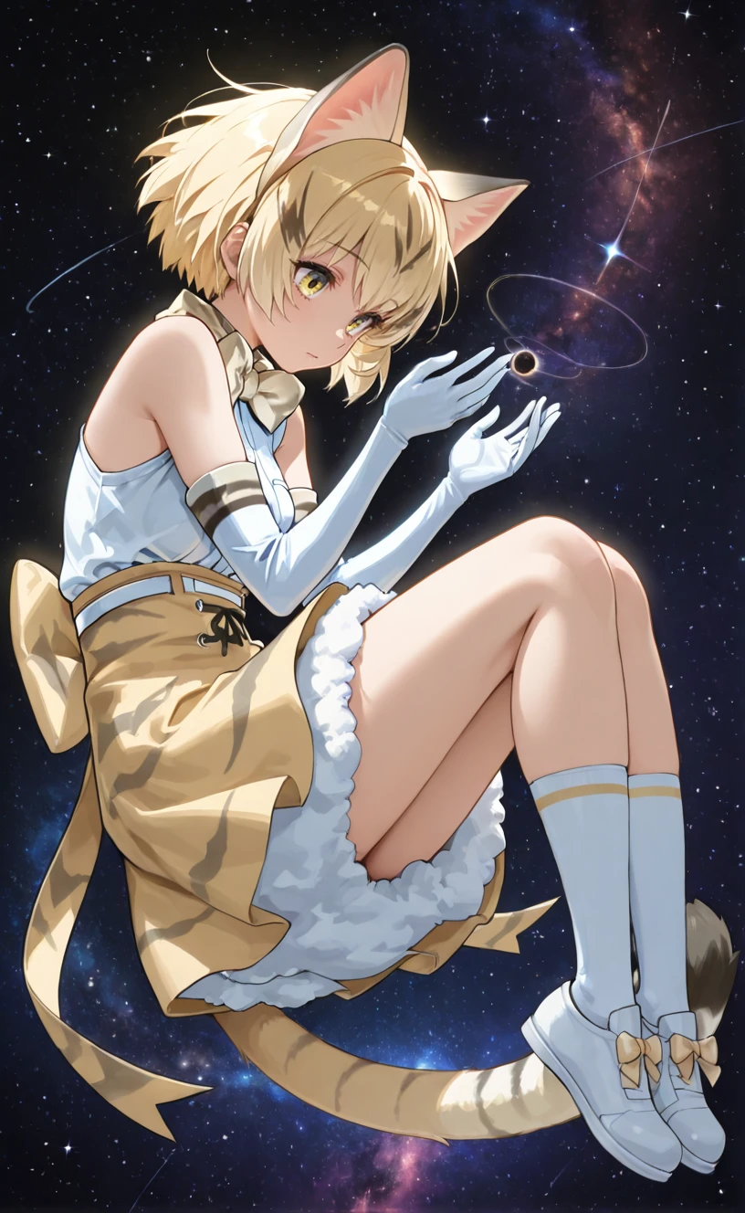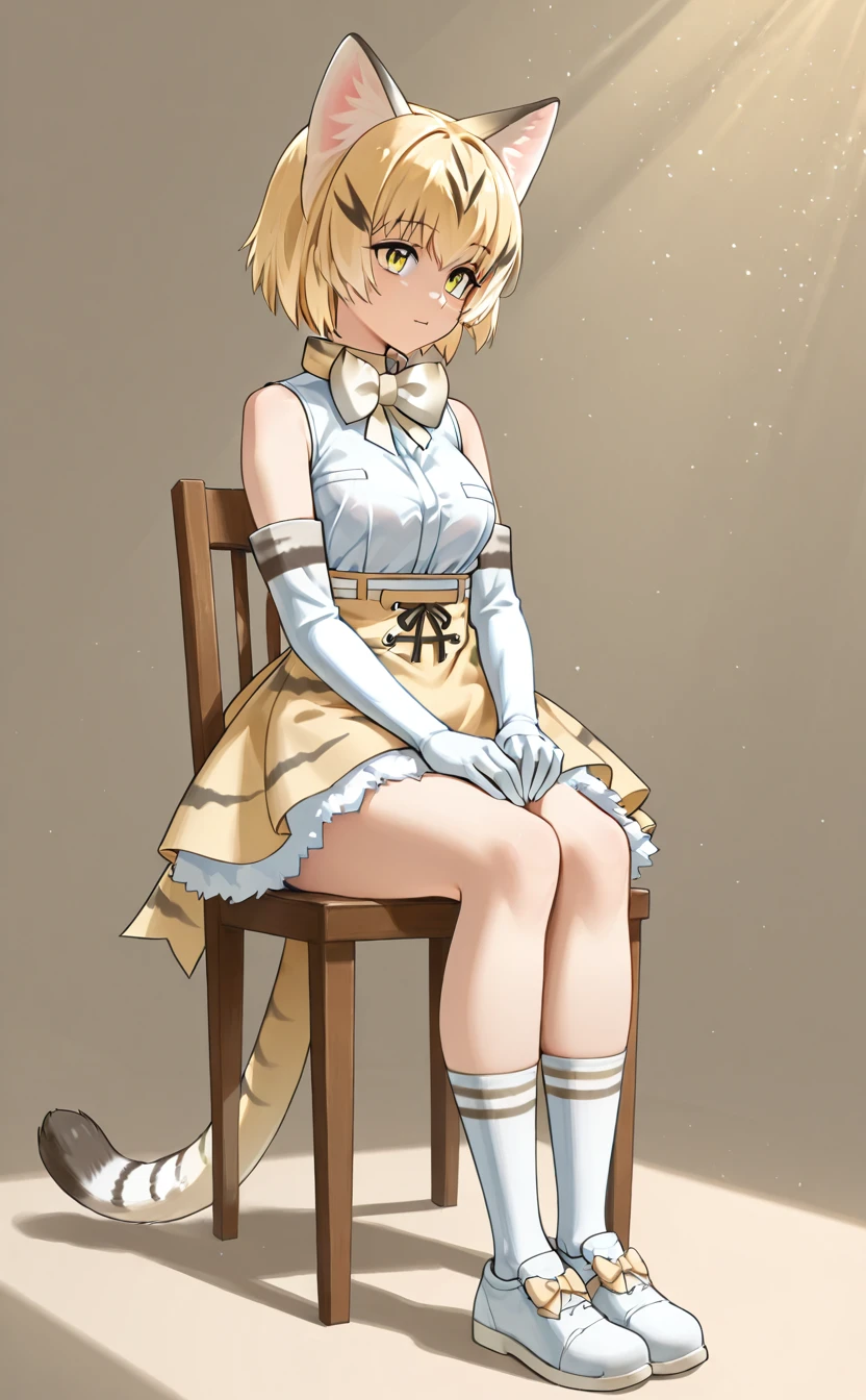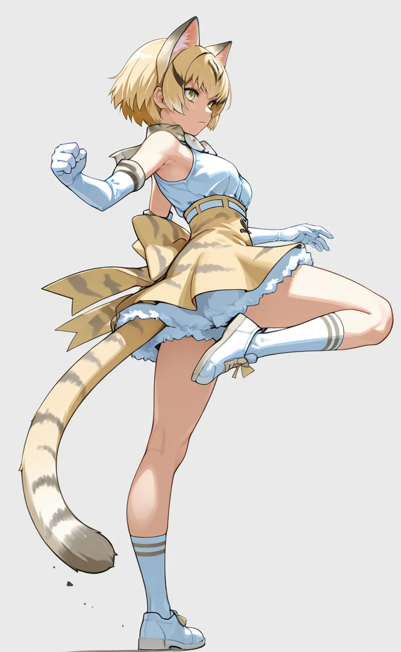 cat ears, hair markings, blonde hair, short hair, yellow eyes, cat tail, tail markings, white sleeveless shirt, bowtie, elbow gloves, high-waist skirt, socks, white shoes