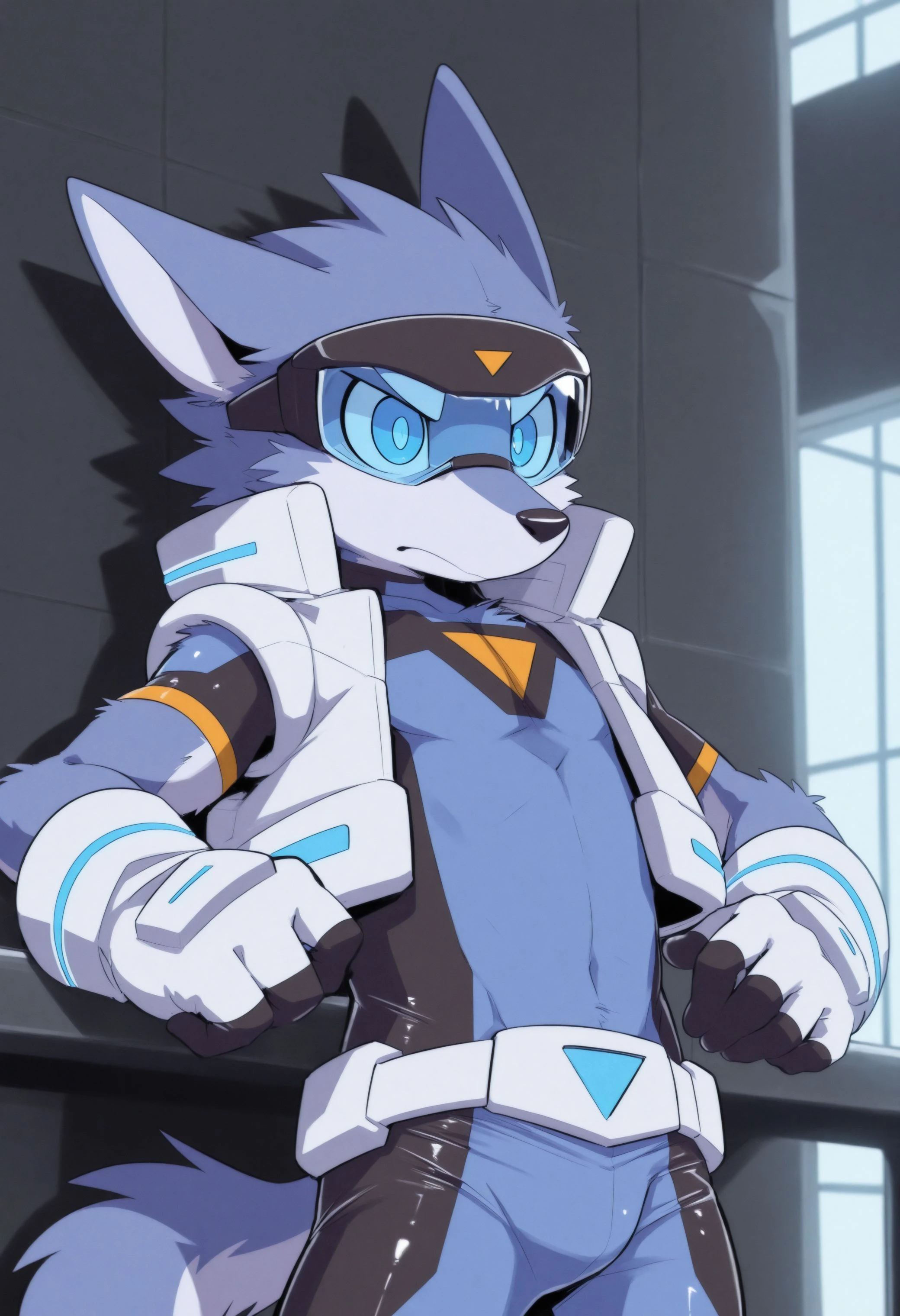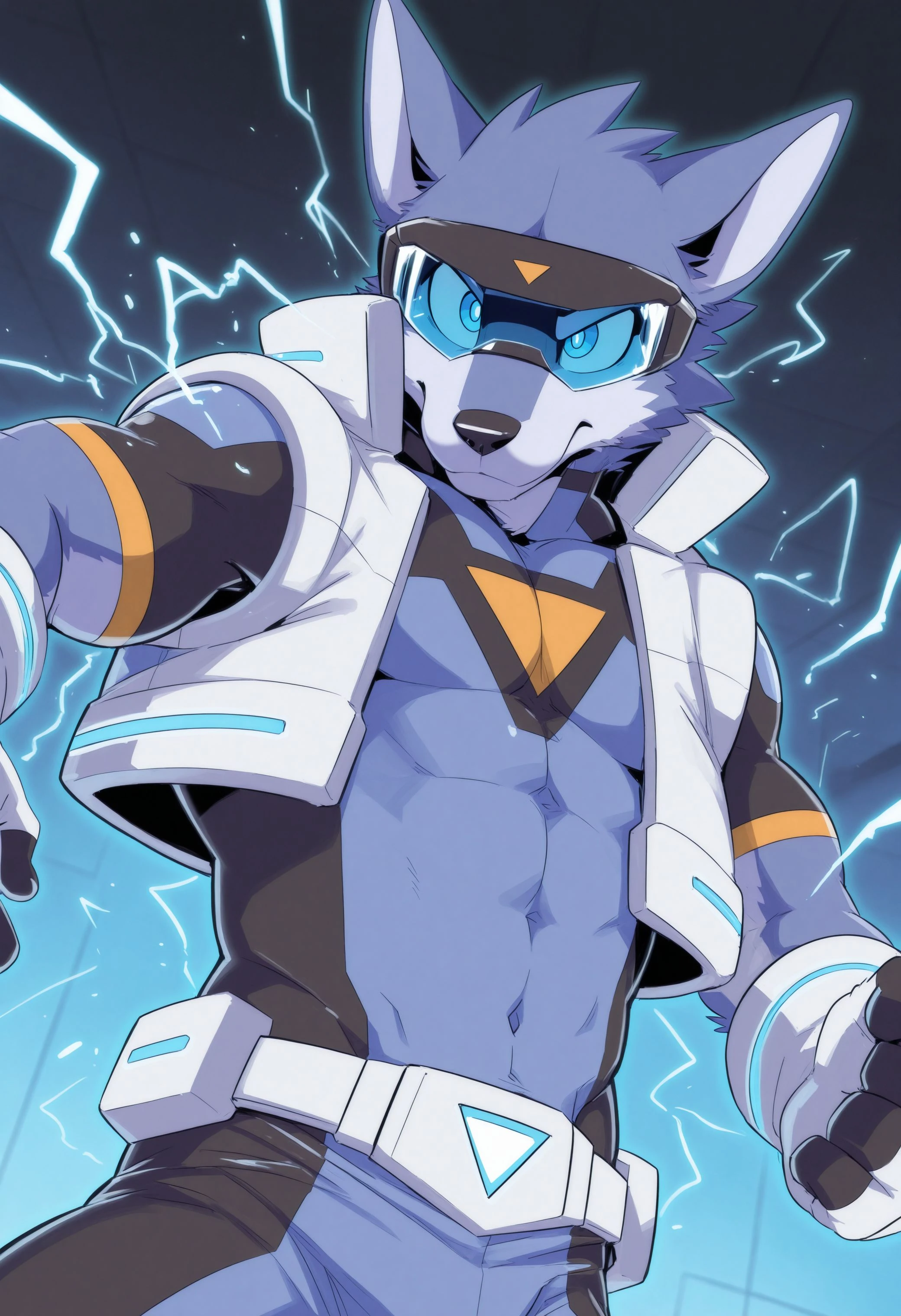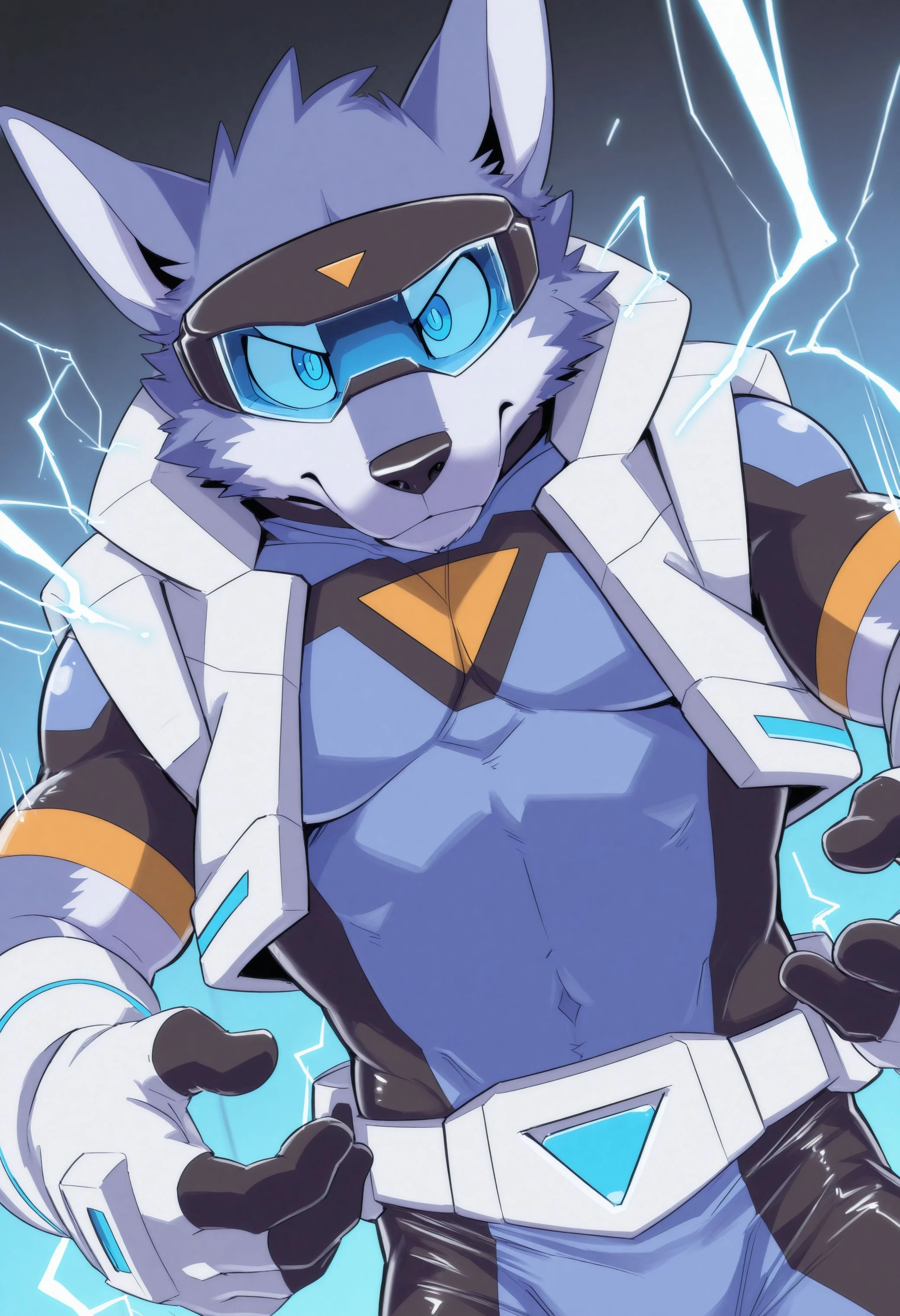 Illustrious: masterpiece, hires, 4k, best quality, high quality, amazing quality, high resolution, b1u3sp4rk, furry male, furry, solo, 1boy, blue eyes, clothes, bodysuit, tight clothing, open white vest, clothing, gloves, visor, goggles, tail, ...your tags...Illustrious: bad quality, bad anatomy, crossed arms, malformed limbs, signature, watermarkDescription