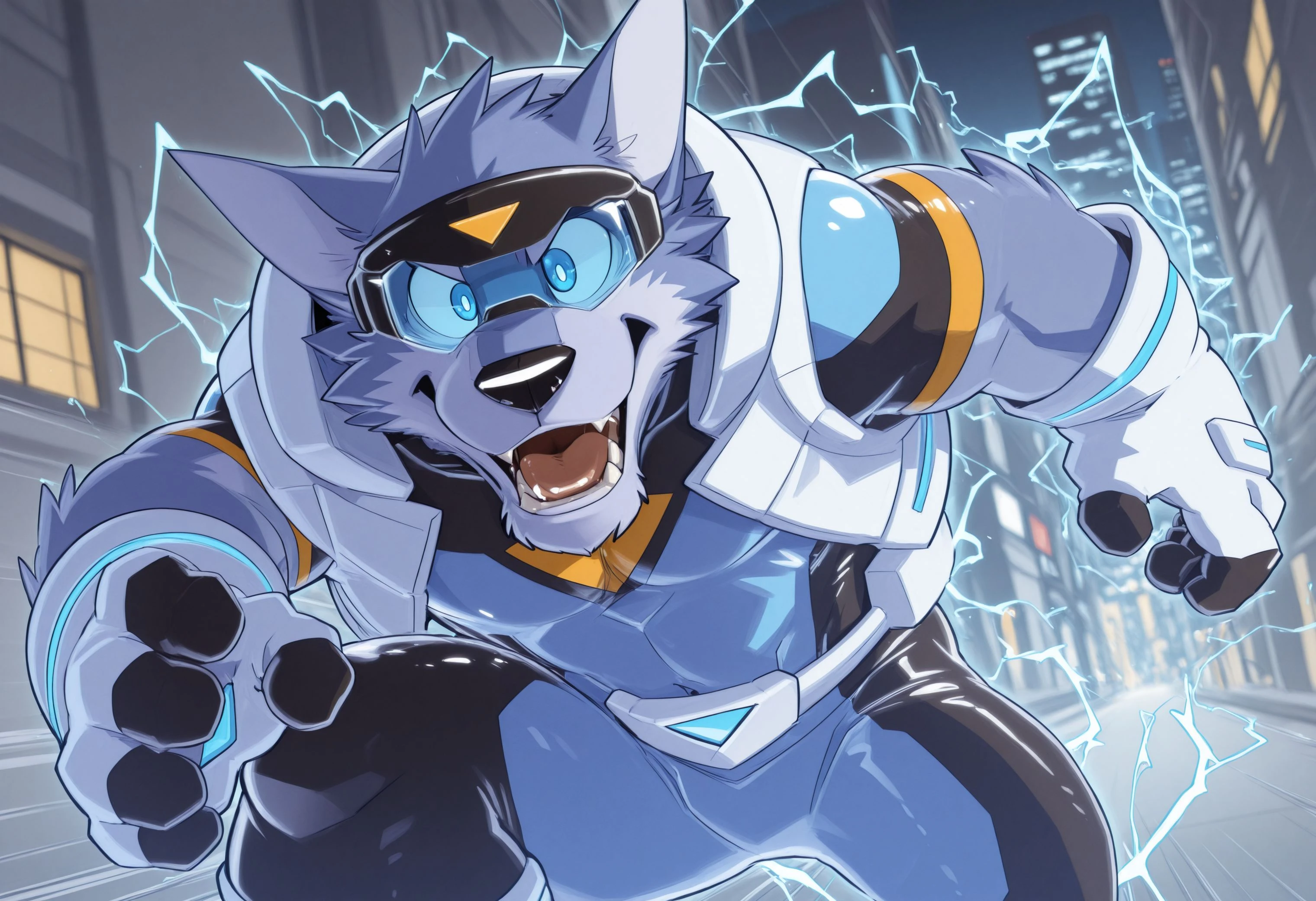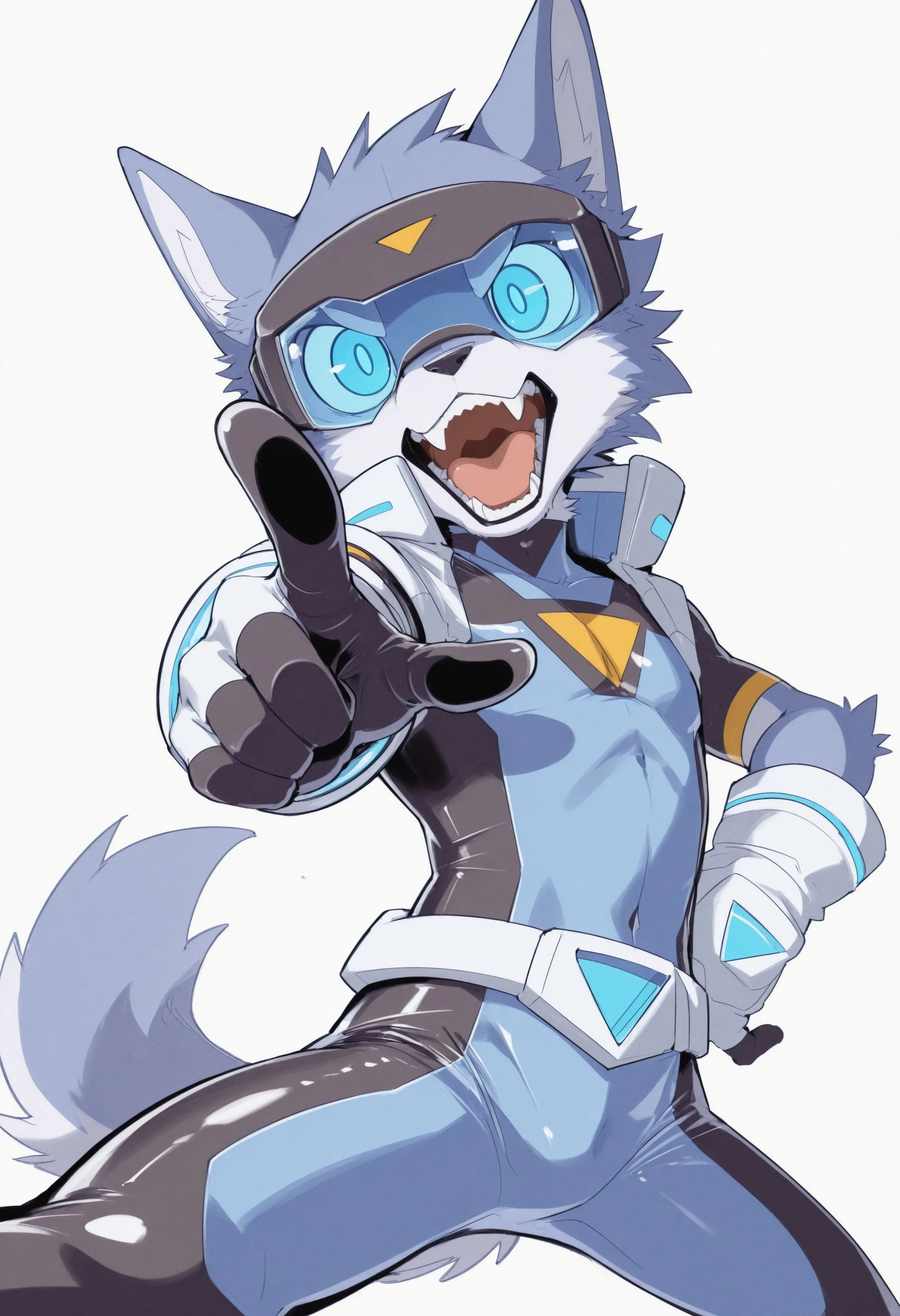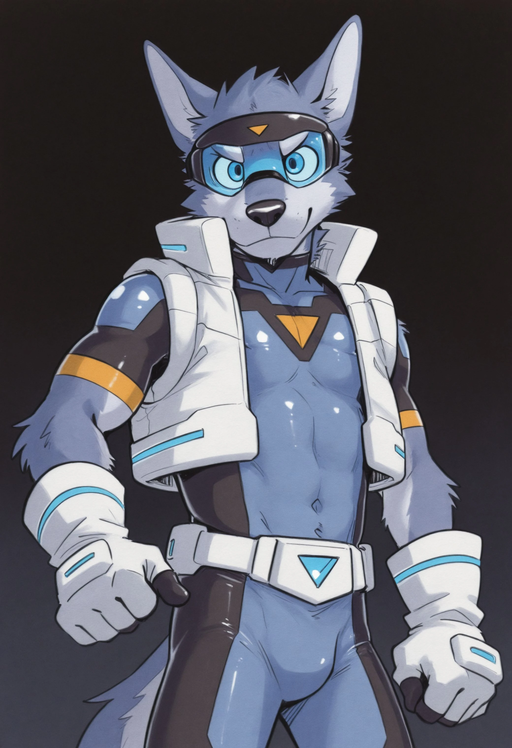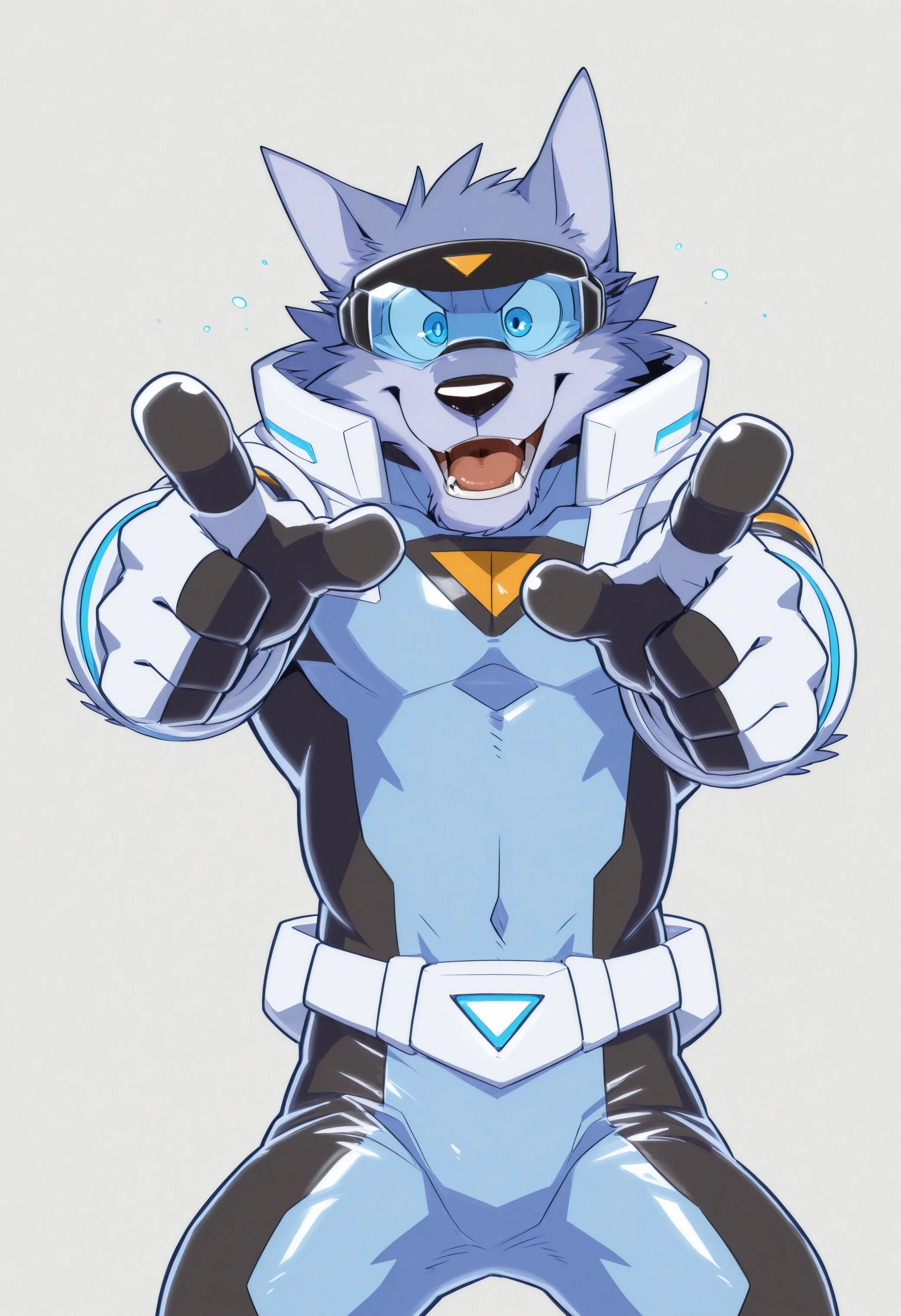 Illustrious: masterpiece, hires, 4k, best quality, high quality, amazing quality, high resolution, b1u3sp4rk, furry male, furry, solo, 1boy, blue eyes, clothes, bodysuit, tight clothing, open white vest, clothing, gloves, visor, goggles, tail, ...your tags...Illustrious: bad quality, bad anatomy, crossed arms, malformed limbs, signature, watermarkDescription