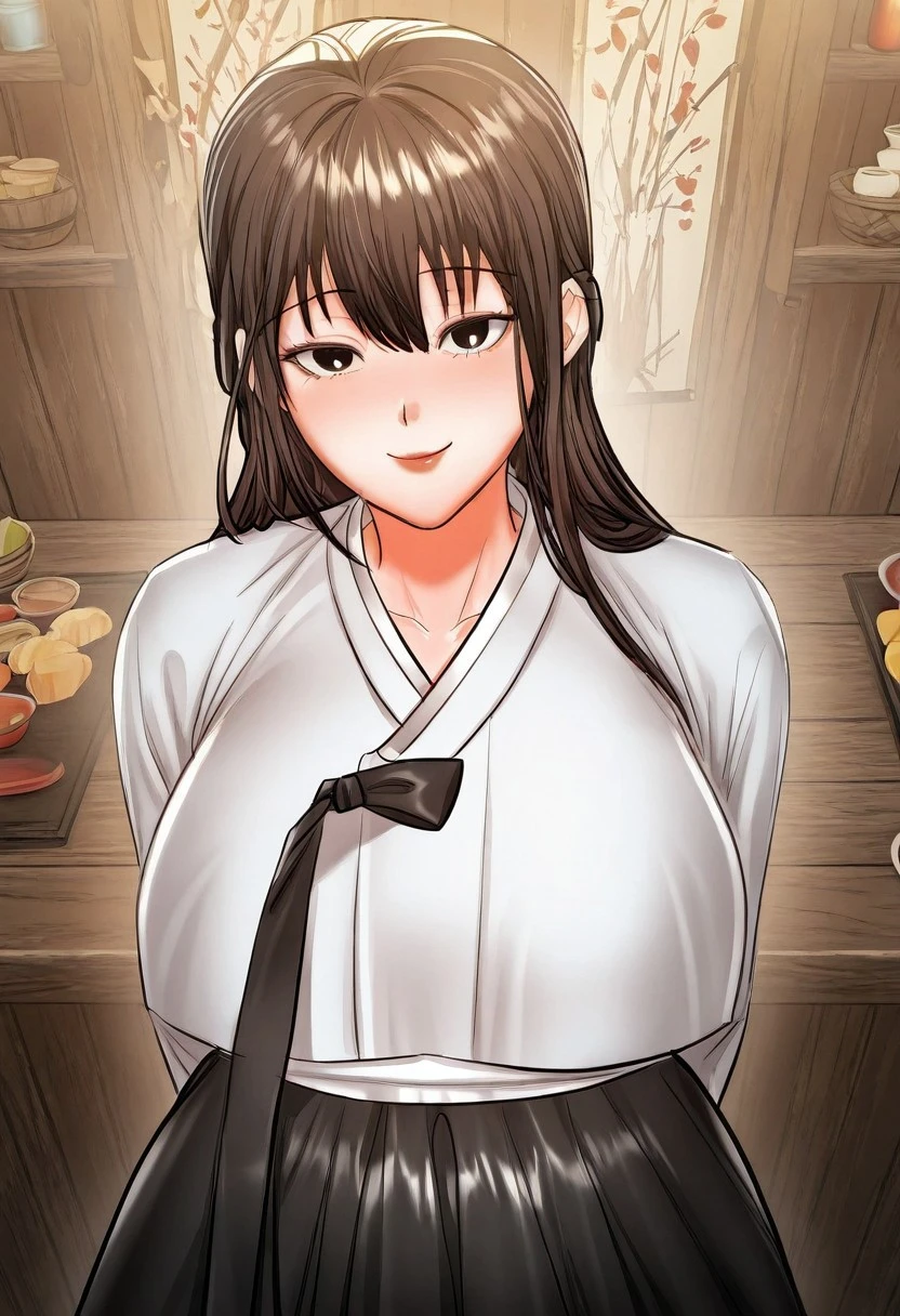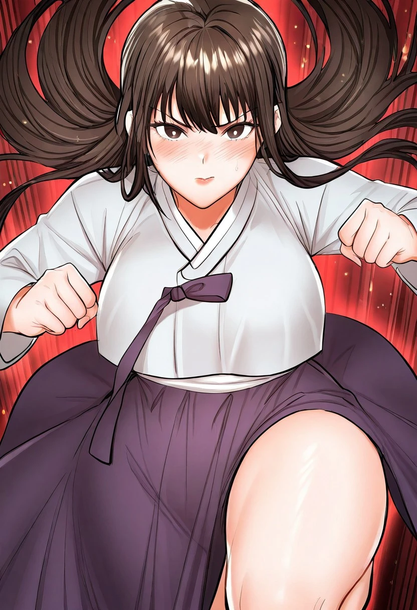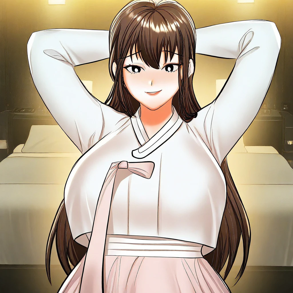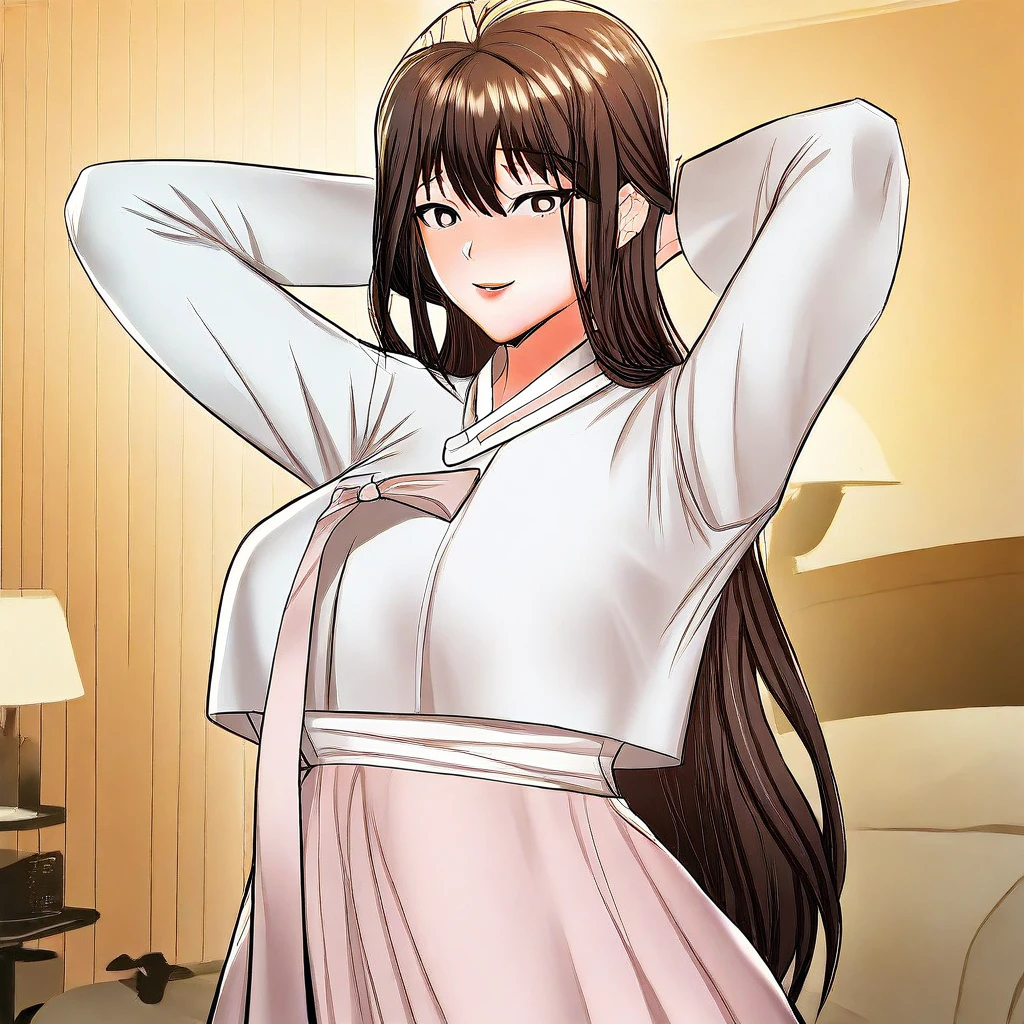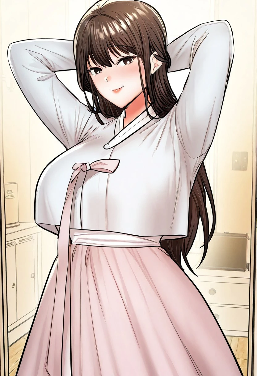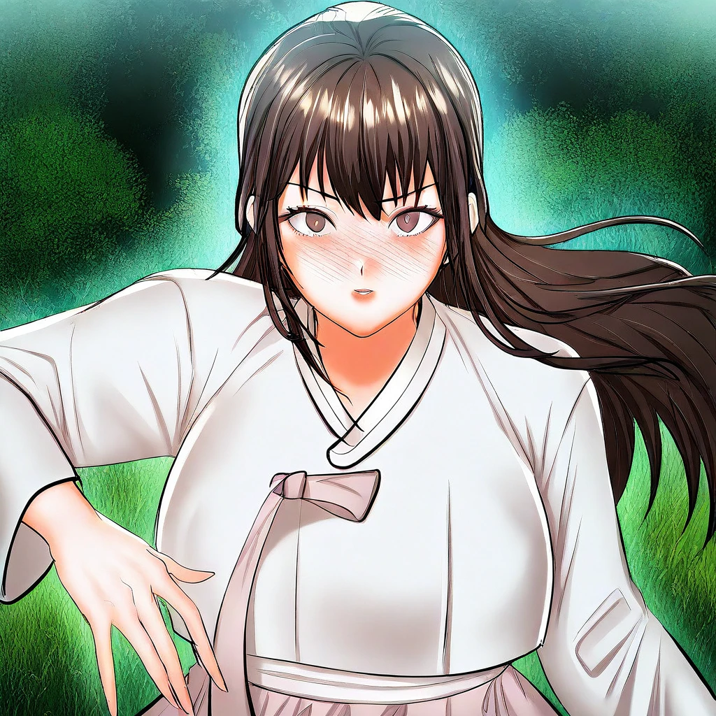 (( <lora:older_sister_(sponsor_me_please):1> , older_sister_(sponsor_me_please), thin waist, wide hips, beautiful skin, piercing dark brown eyes, clear eyes, bright pupils, beautiful eyes, beautiful dark brown hair, beautiful long hair, bangs, huge and shaggy breasts, natural beauty, extraordinary beautiful woman, attractive woman, super sexy woman, lustful body, sexy woman with seductive obscene body, sensual body, voluptuous body, sexy beauty, no piercings, no piercing, )) , ((traditional korean hanbok dress, cute white jeogori top with pink goreum clothing tape, beautiful pink chima skirt, ))