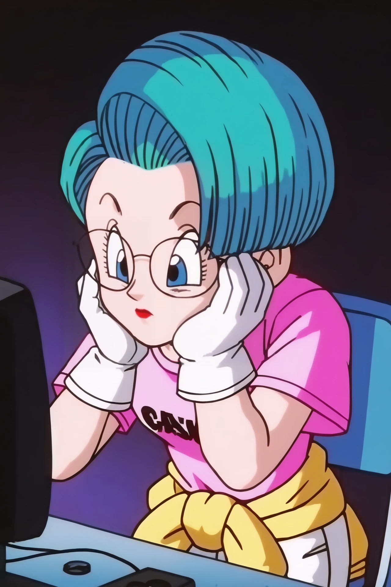 bulma, short hair, blue eyes, aqua hair, glasses, stud earrings, makeup, lipstick,