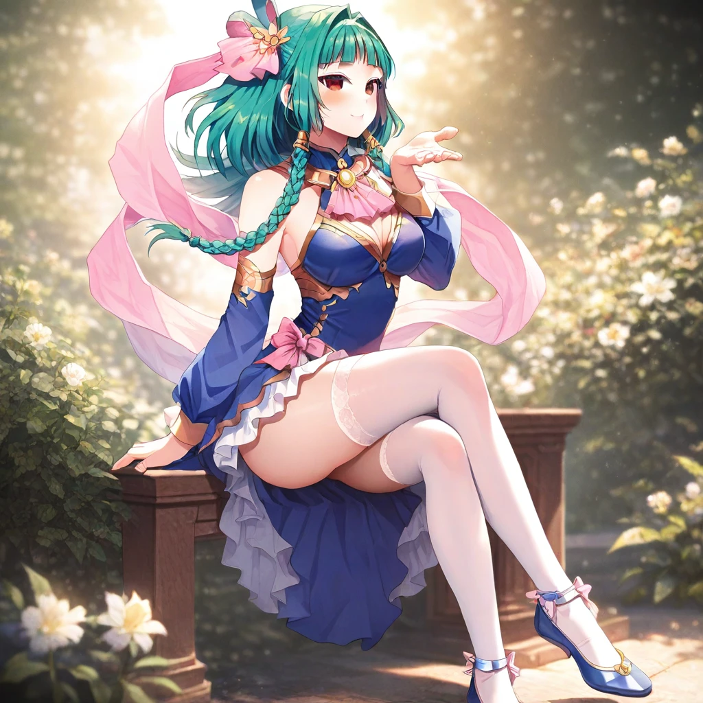 score_9, photorealistic, hyper realistic, ultra detailed, high quality. Lingzi_Ailan, teal green hair, medium hair, slightly wavy hair, straight bangs, golden hairband, braided side strands, hair ornament with flower and ribbon, red eyes, teal green eyebrows, , thin waist, wide , soft mauve scarf, gold brooch, blue dress, oriental fantasy dress, gold accents, shoulders, long sleeves, detached sleeves, flowing mauve sash, white peacock feather layered skirt, mauve ruffle on the skirt, white thigh-high stockings, blue ballet flats. daytime, elegant garden. sitting, legs crossed, pose, sensual expression. cinematic composition, dynamic angle, cinematic lighting, soft natural light.