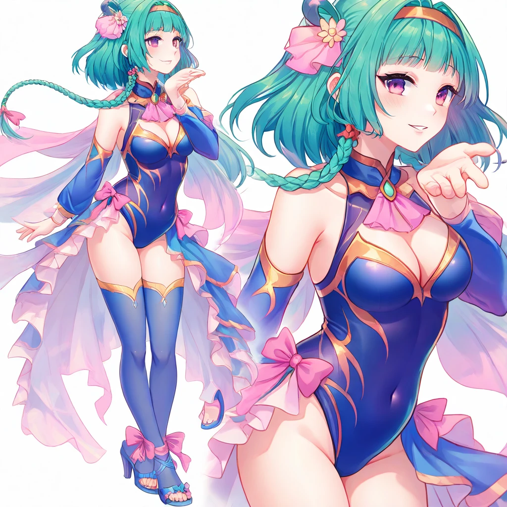 Lingzi_Ailan, teal green hair, medium hair, slightly wavy hair, straight bangs, golden hairband, braided side strands, hair ornament with flower and ribbon, red eyes, teal green eyebrows