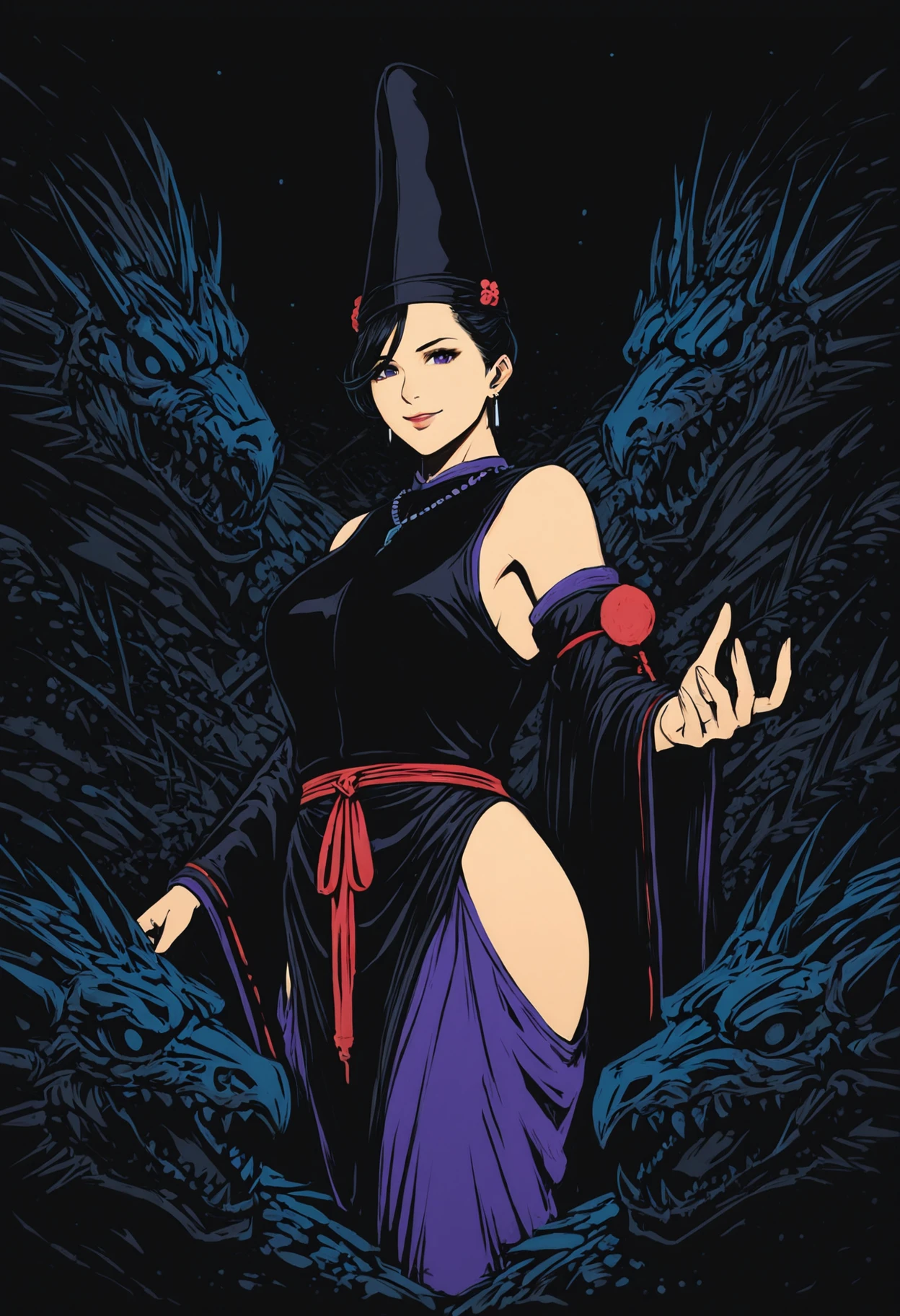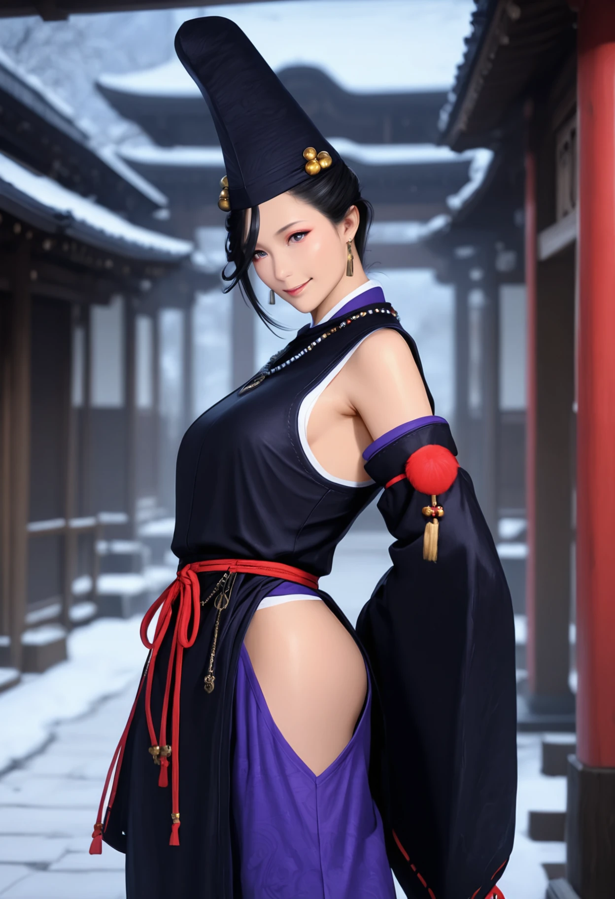 fuku_n10h, unique hat, tate eboshi, black hair, jewelry, earrings, necklace, japanese clothes, detached sleeves, wide sleeves, wide purple pants, pants, hip vent, red platform footwear, black socks,