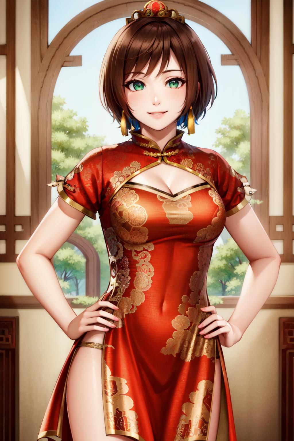red china dress, side slit, red shoesThe length of the dress can be adjusted with prompts, likeshort dress