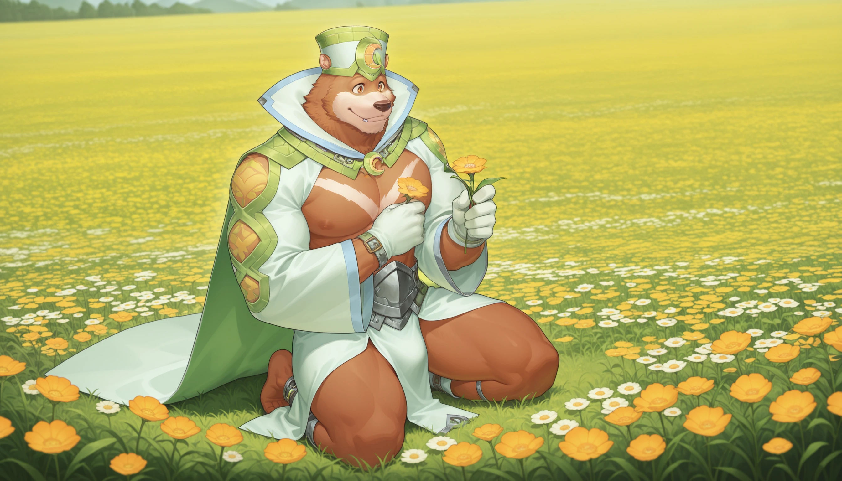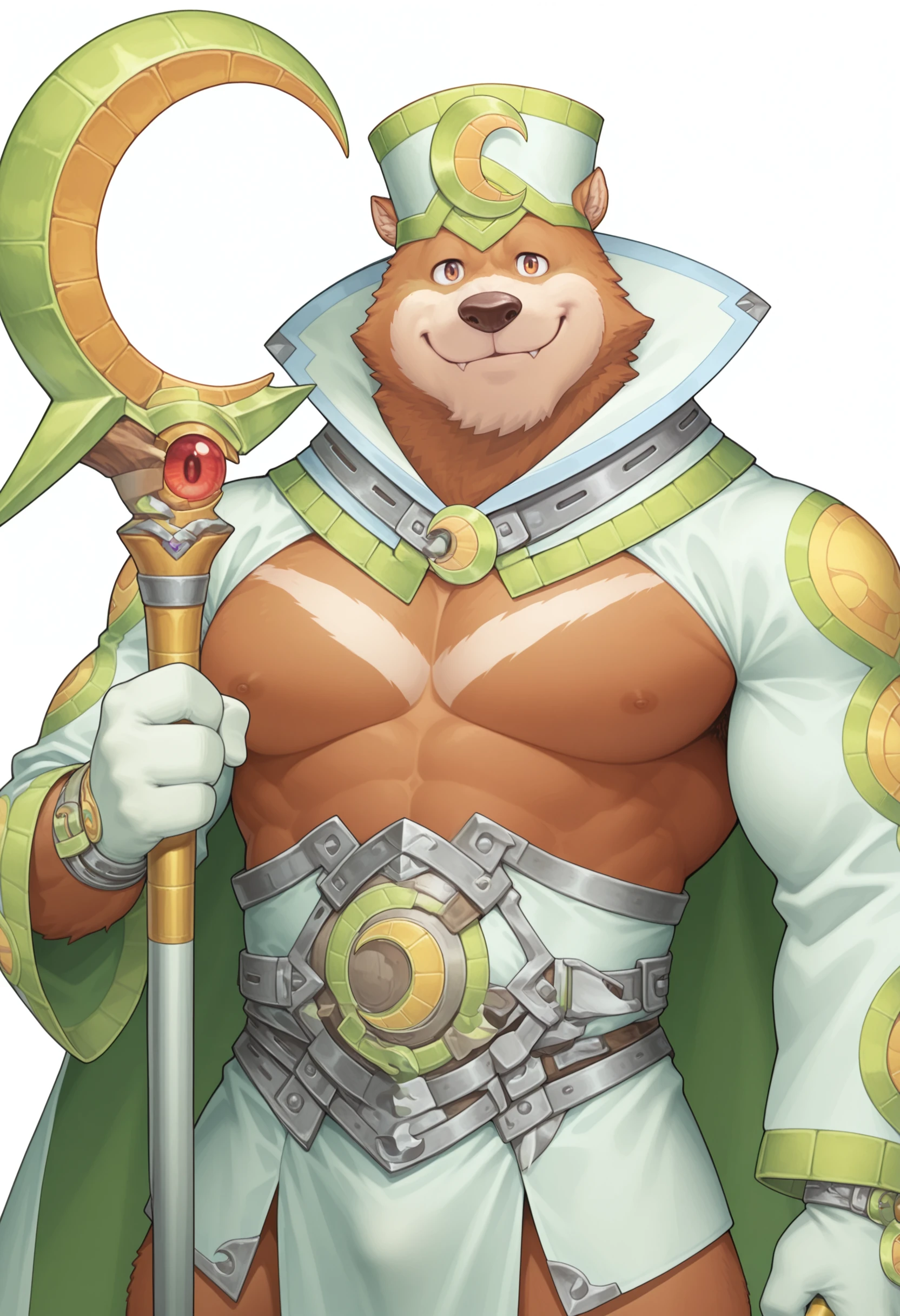 Robes: Main Outfit: green and white robes, green and white hat with crescent emblem, white collar, crescent moon staff, green and white shrug (clothing), blue knee-length pants, anklets, barefoot, white gloves, thick arms, thick legs,