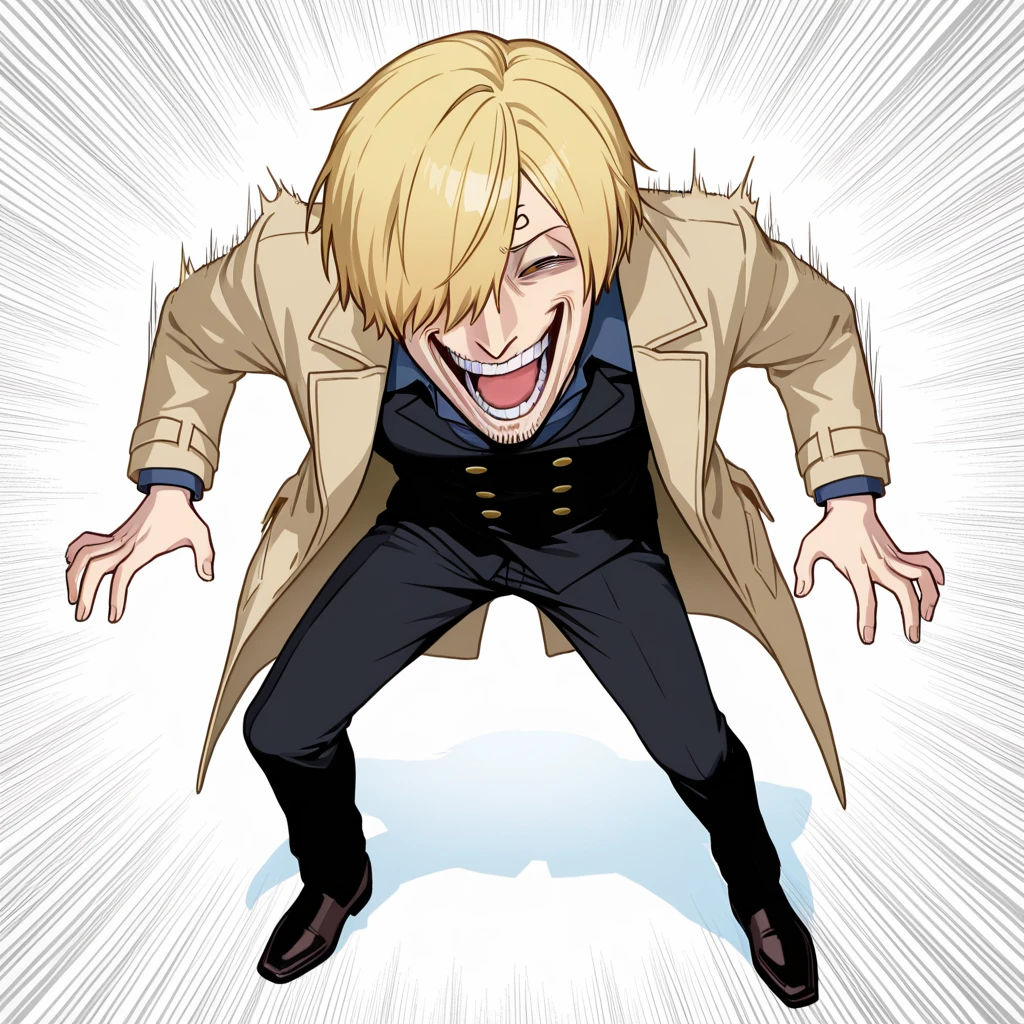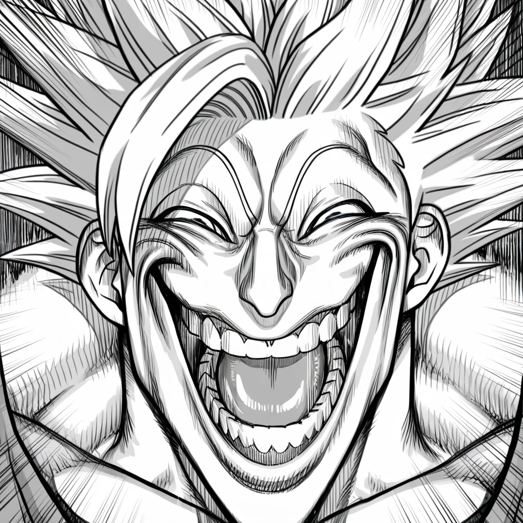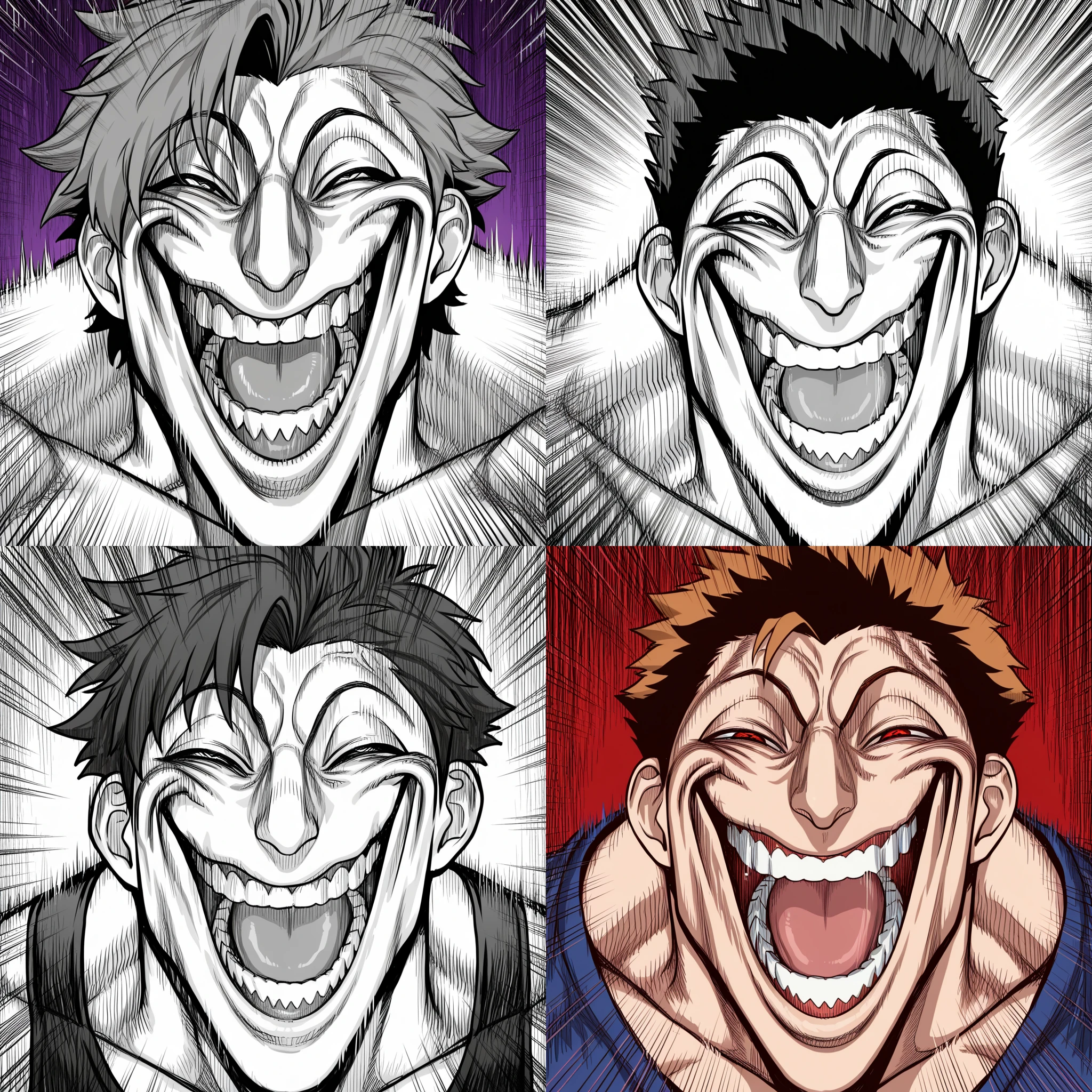 open mouth, emphasis lines, half-closed eyes, laughing, crazy smile