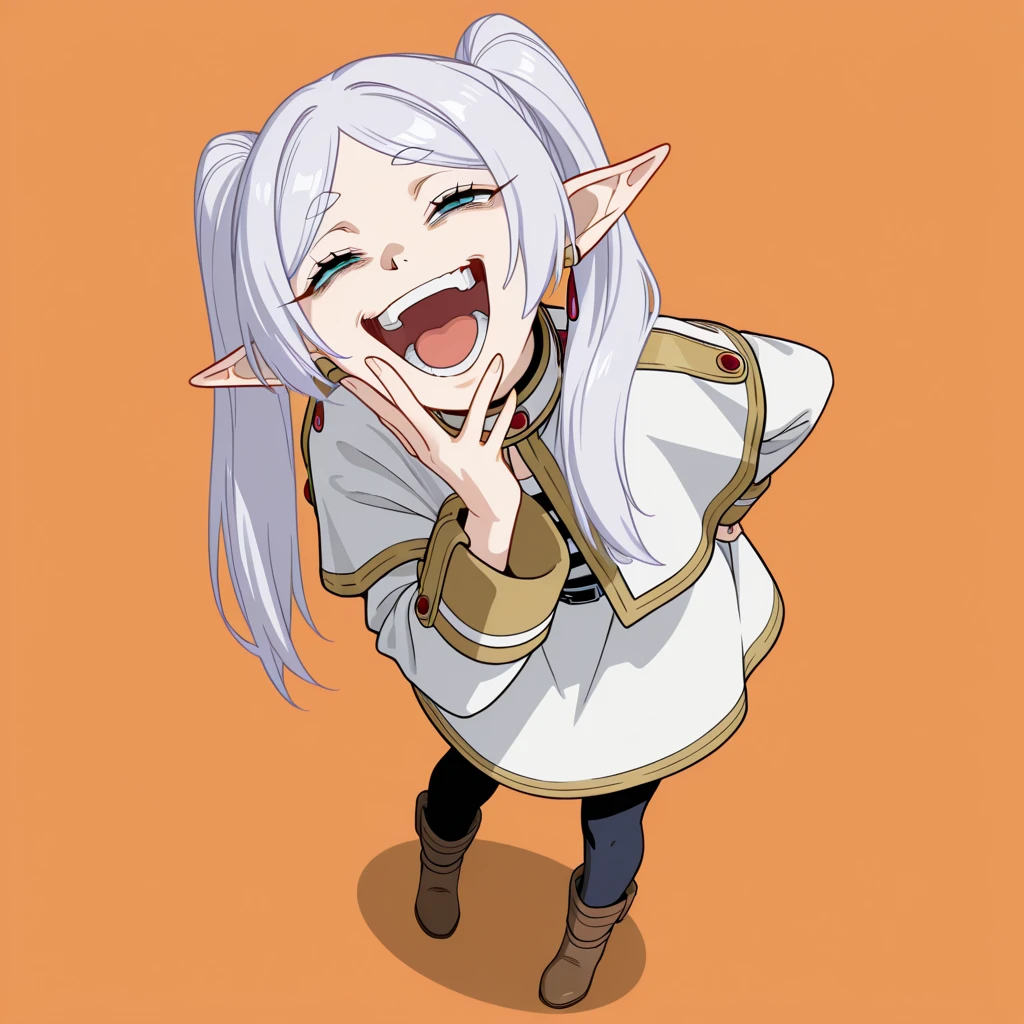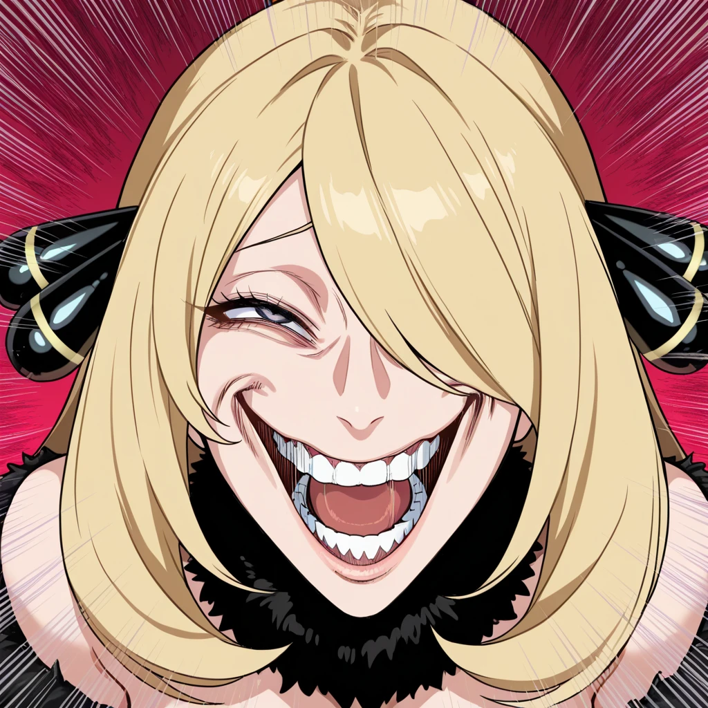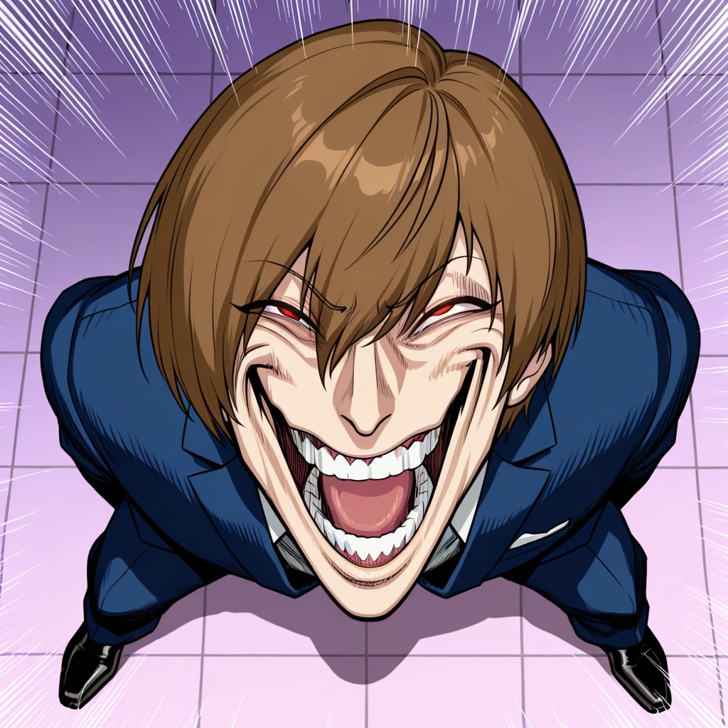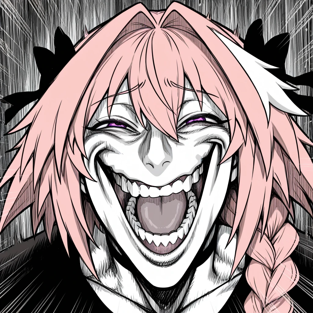 open mouth, emphasis lines, half-closed eyes, laughing, crazy smile