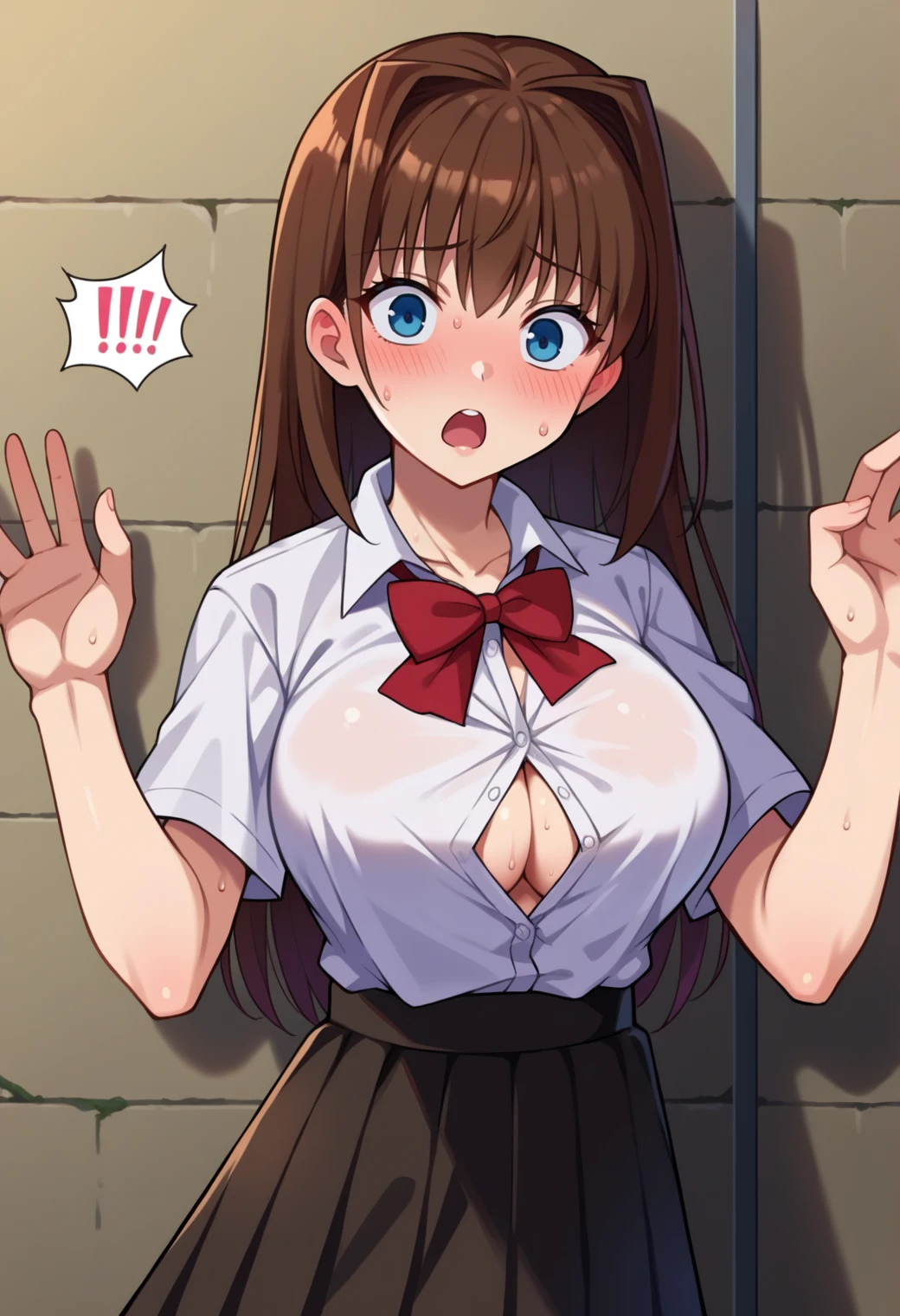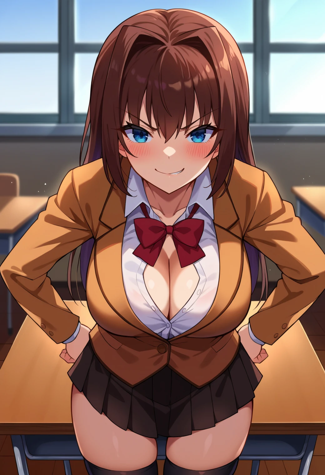 School Outfit: ["aozakischool, blue eyes, brown hair, hair intakes, school uniform, blazer, bow, pleated skirt, brown jacket, red bowtie, white shirt, kneehighs, black skirt"]