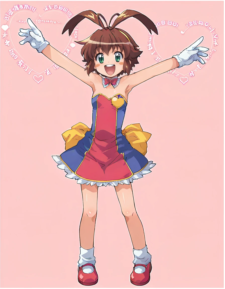 To emphasize hair/face: short hair, brown hair, cowlick, antennae hair, green eyes, headband