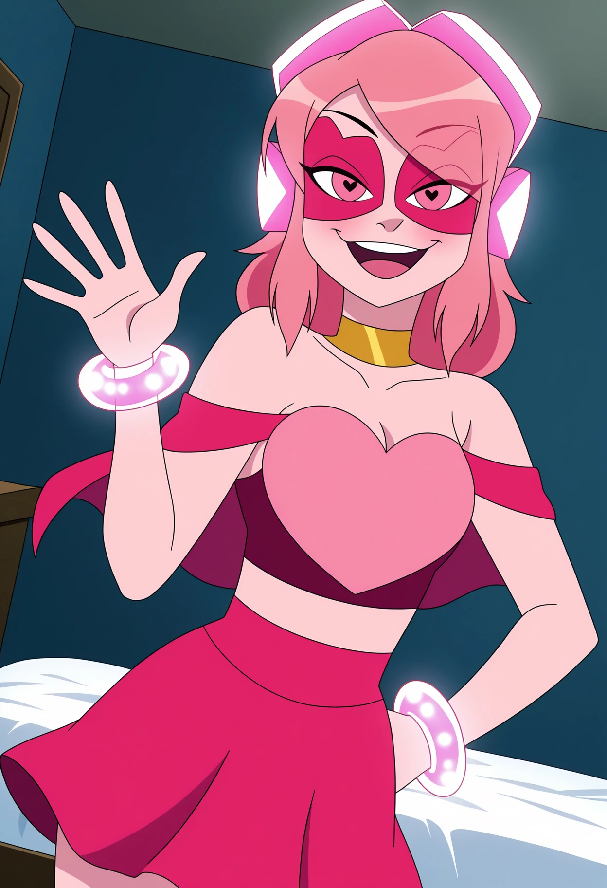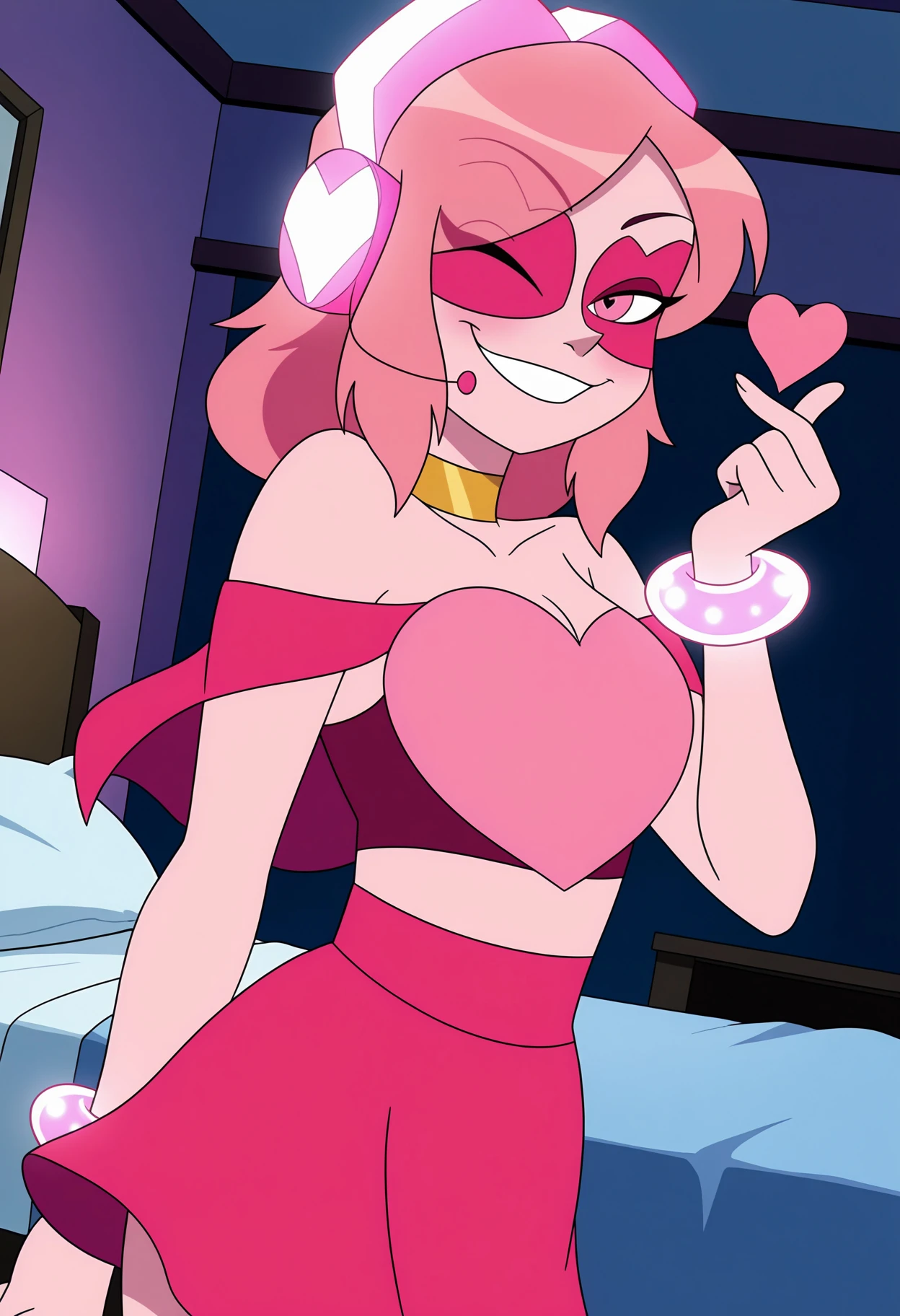 miss heed, pink skin, colored skin, pink hair, pink eyes, heart-shaped pupils, golden choker, pink mask, pink headset, pink crop top, off shoulder, pink capelet, short sleeves, cape, pink skirt, bracelet