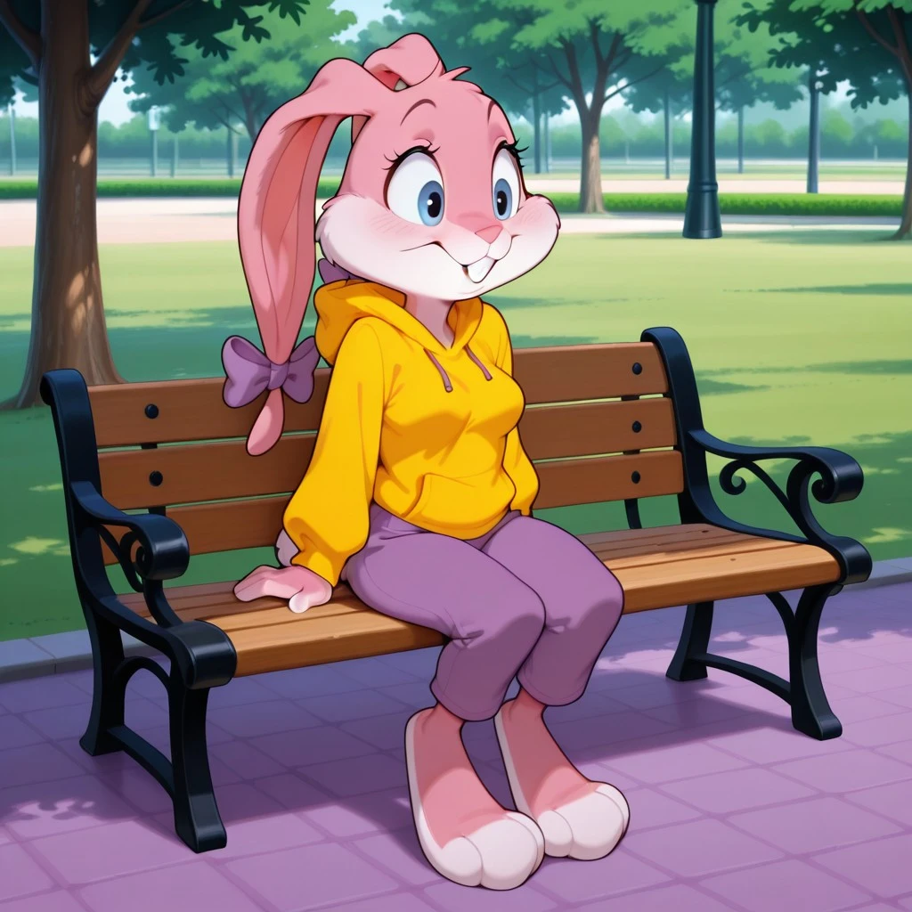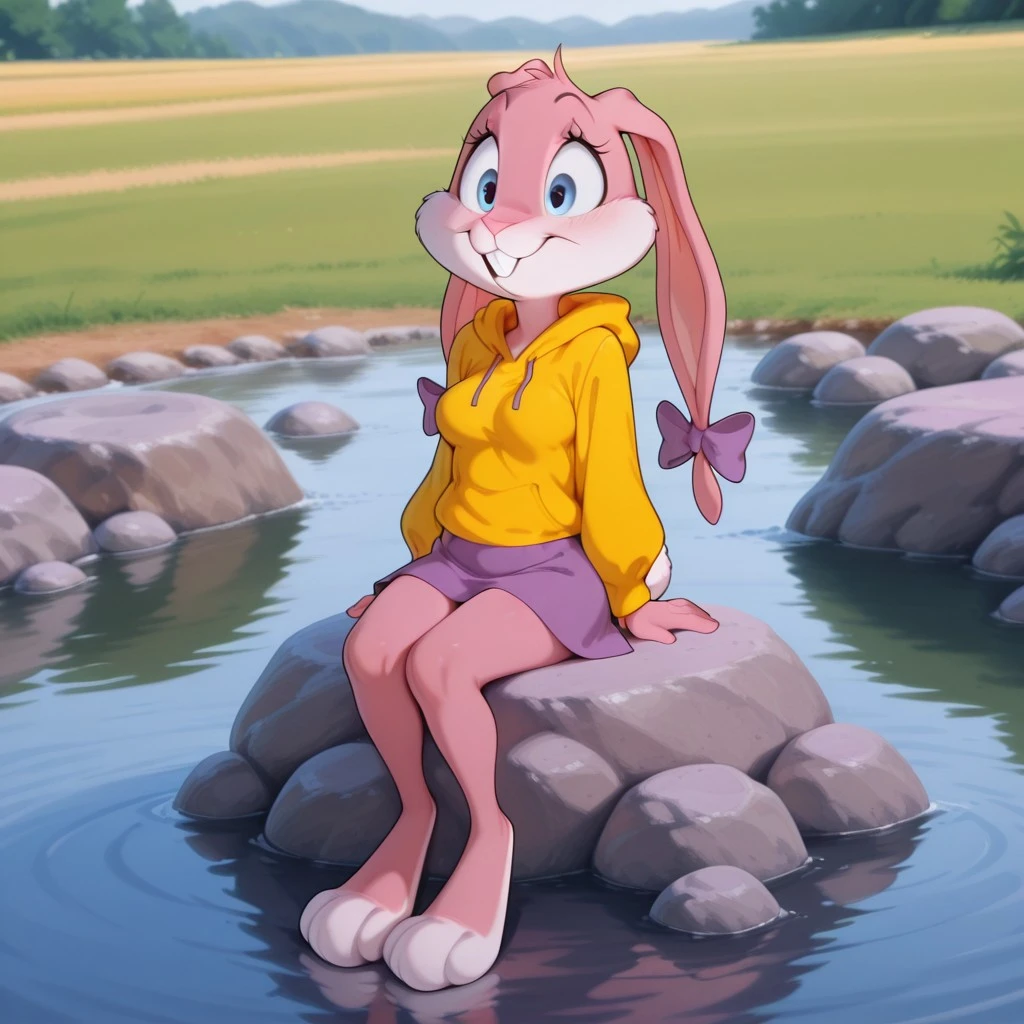 TTbabsbnny, anthro rabbit, female, pink fur, blue eyes, buck teeth, yellow hoodie, purple skirt, , purple earbows