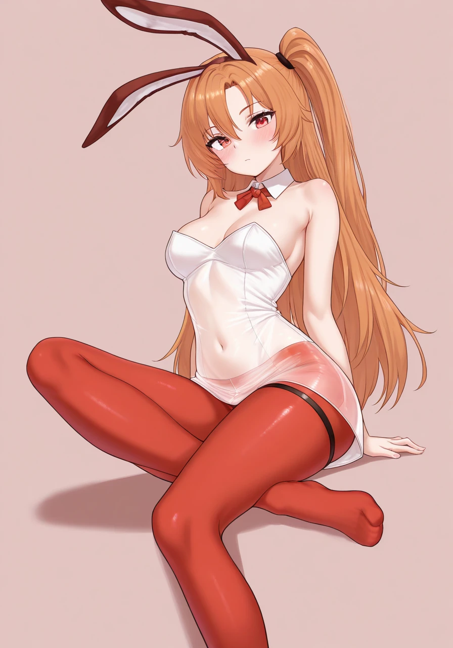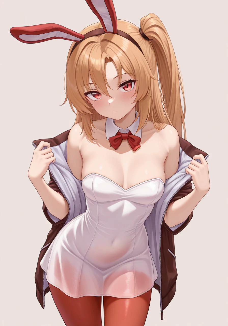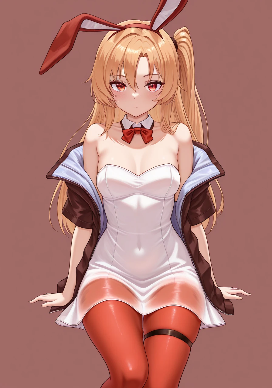 clevelandbunny, red pantyhose, open jacket, strapless dress, short sleeves, fake animal ears, one side up, bowtie, thigh strap________
