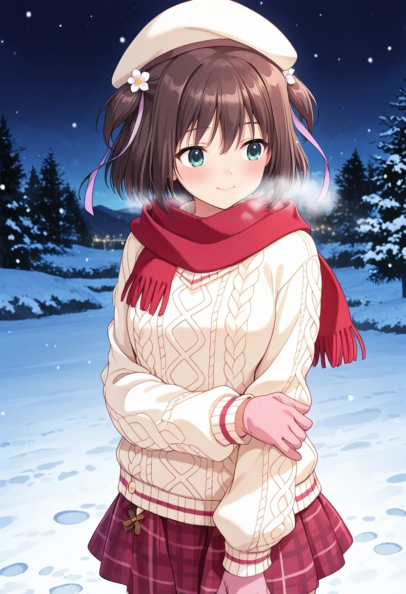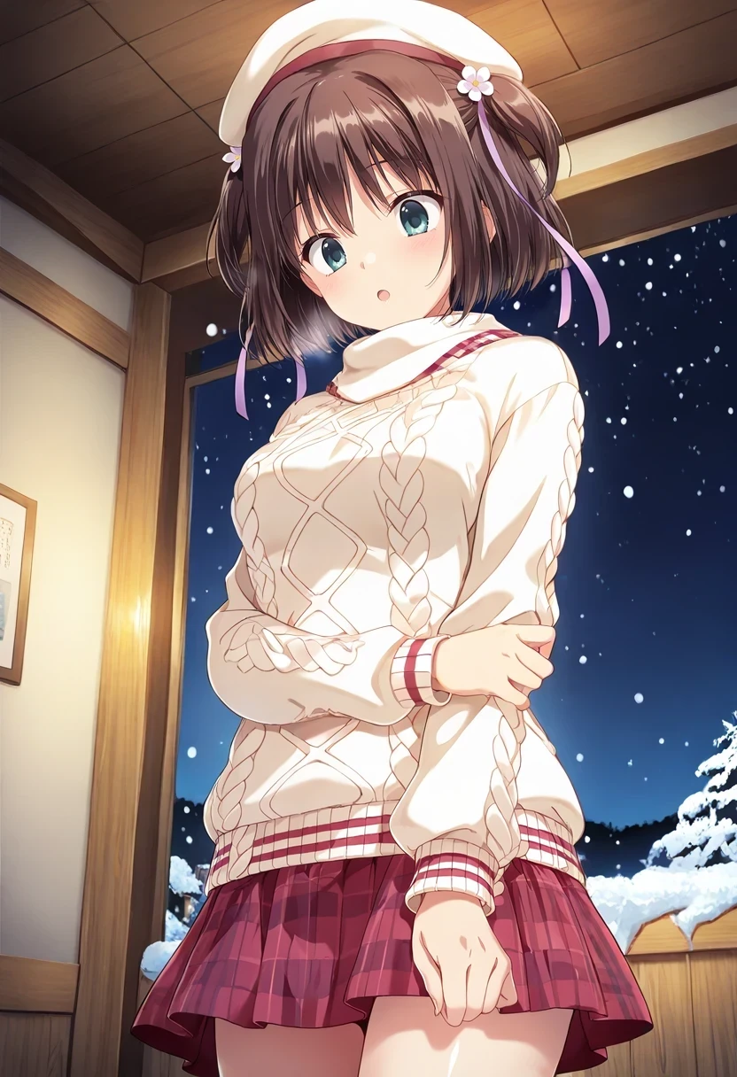 beret,aran sweater,white sweater,plaid skirt,miniskirt,red skirt,Winter (with scarf):