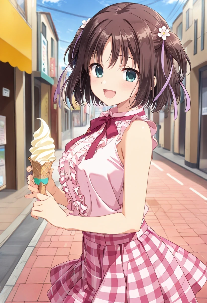 pink shirt,sleeveless,red neck ribbon,center frills,pink skirt,miniskirt,plaid skirt,