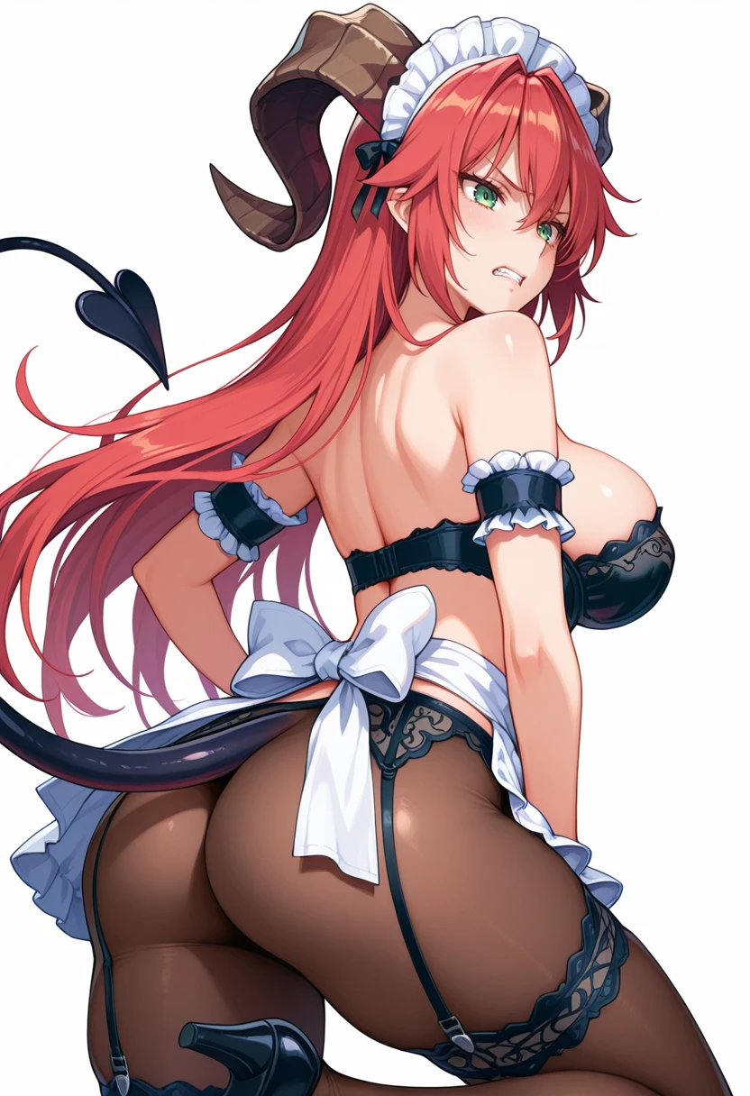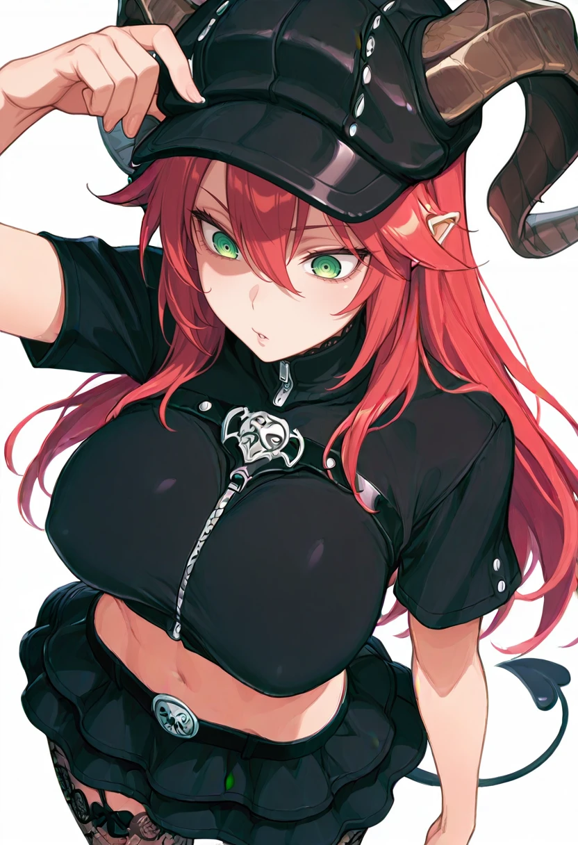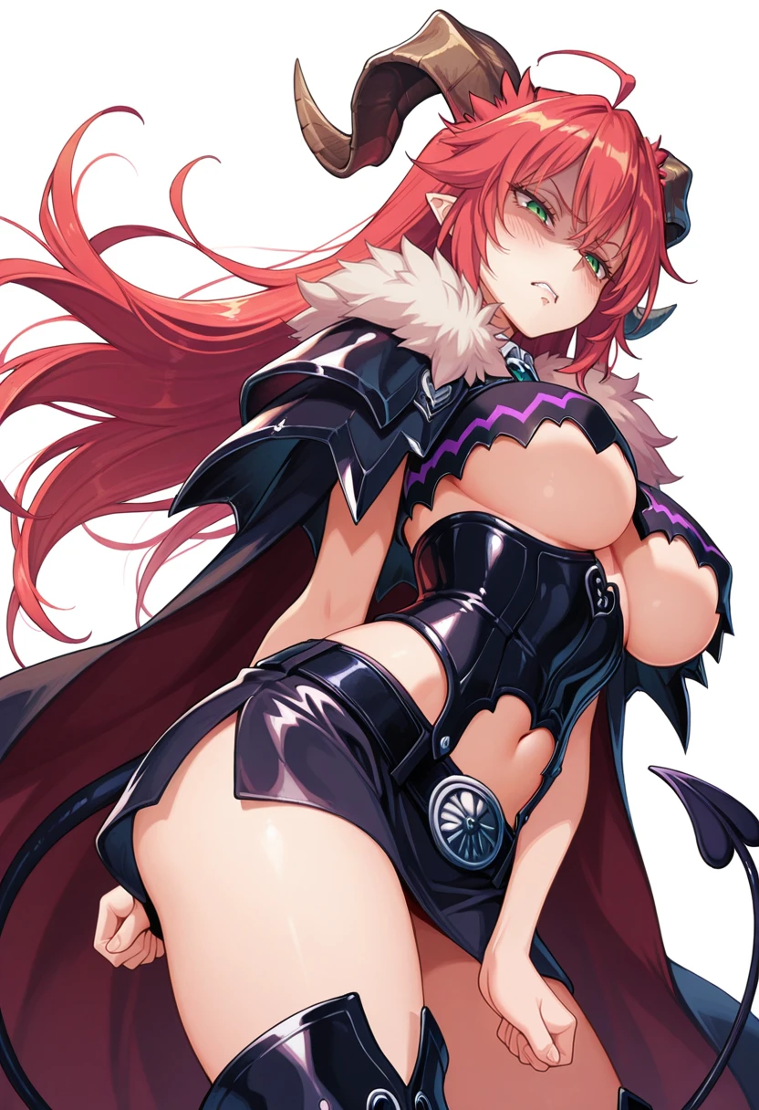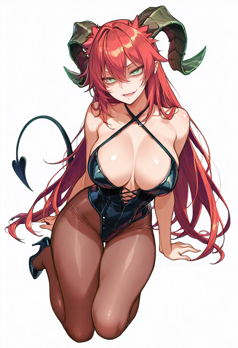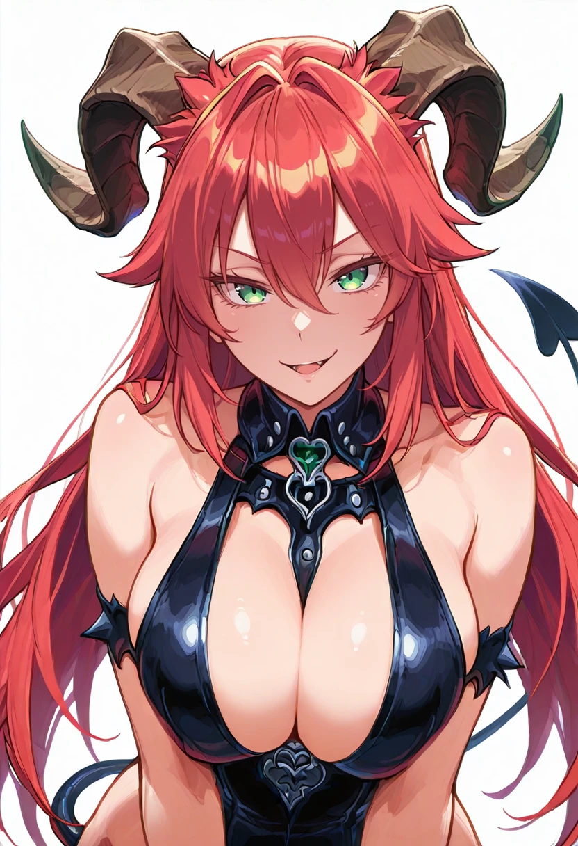 asmodeus_cnr, 1girl,red hair, large breasts, demon girl, green eyes, long hair, demon horns, demon tail,