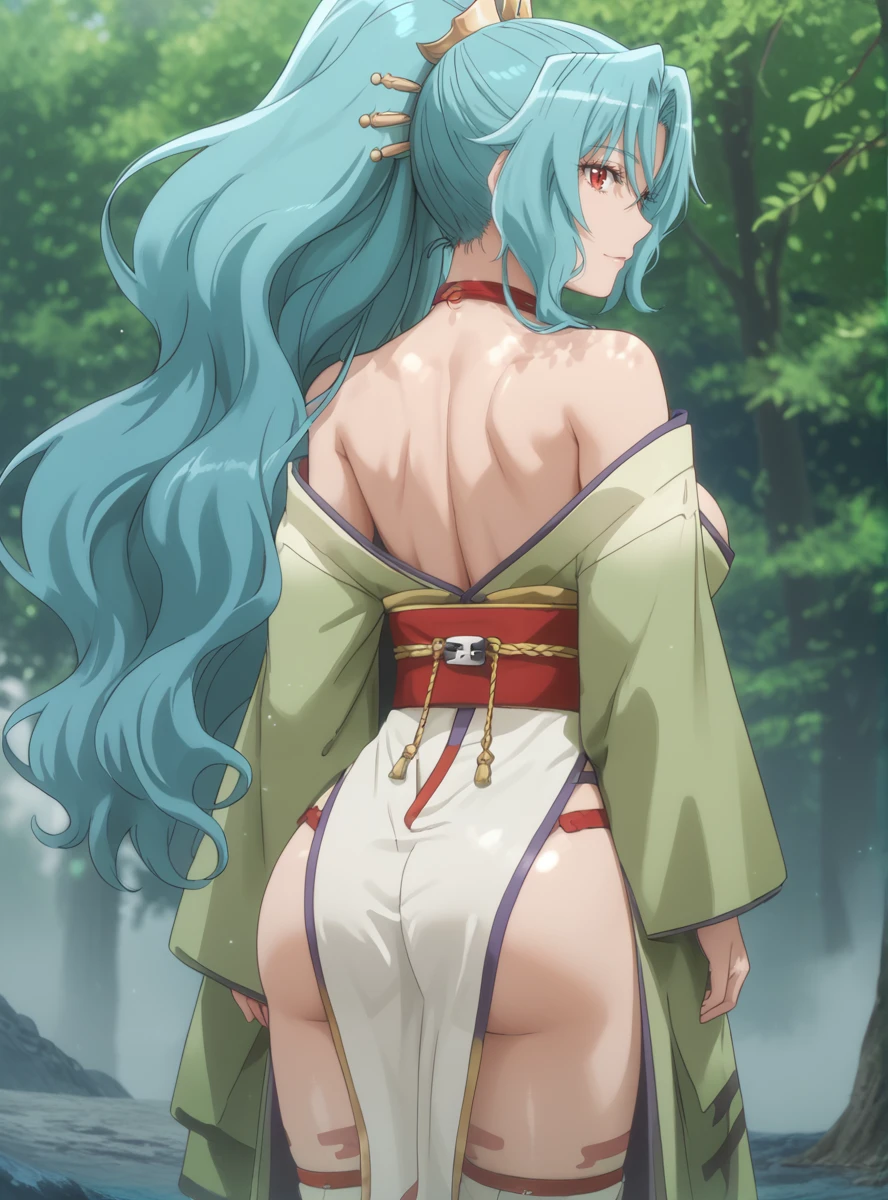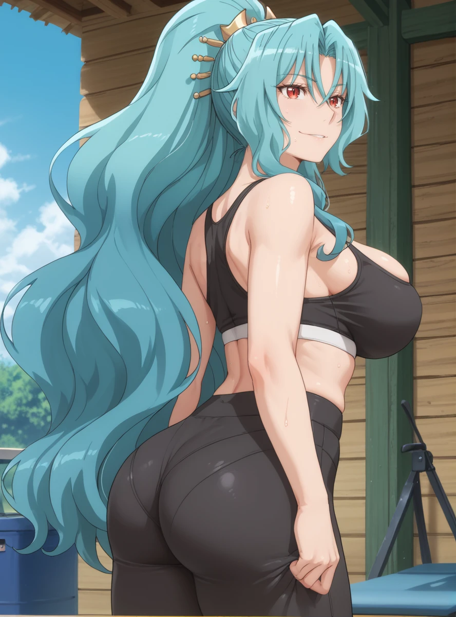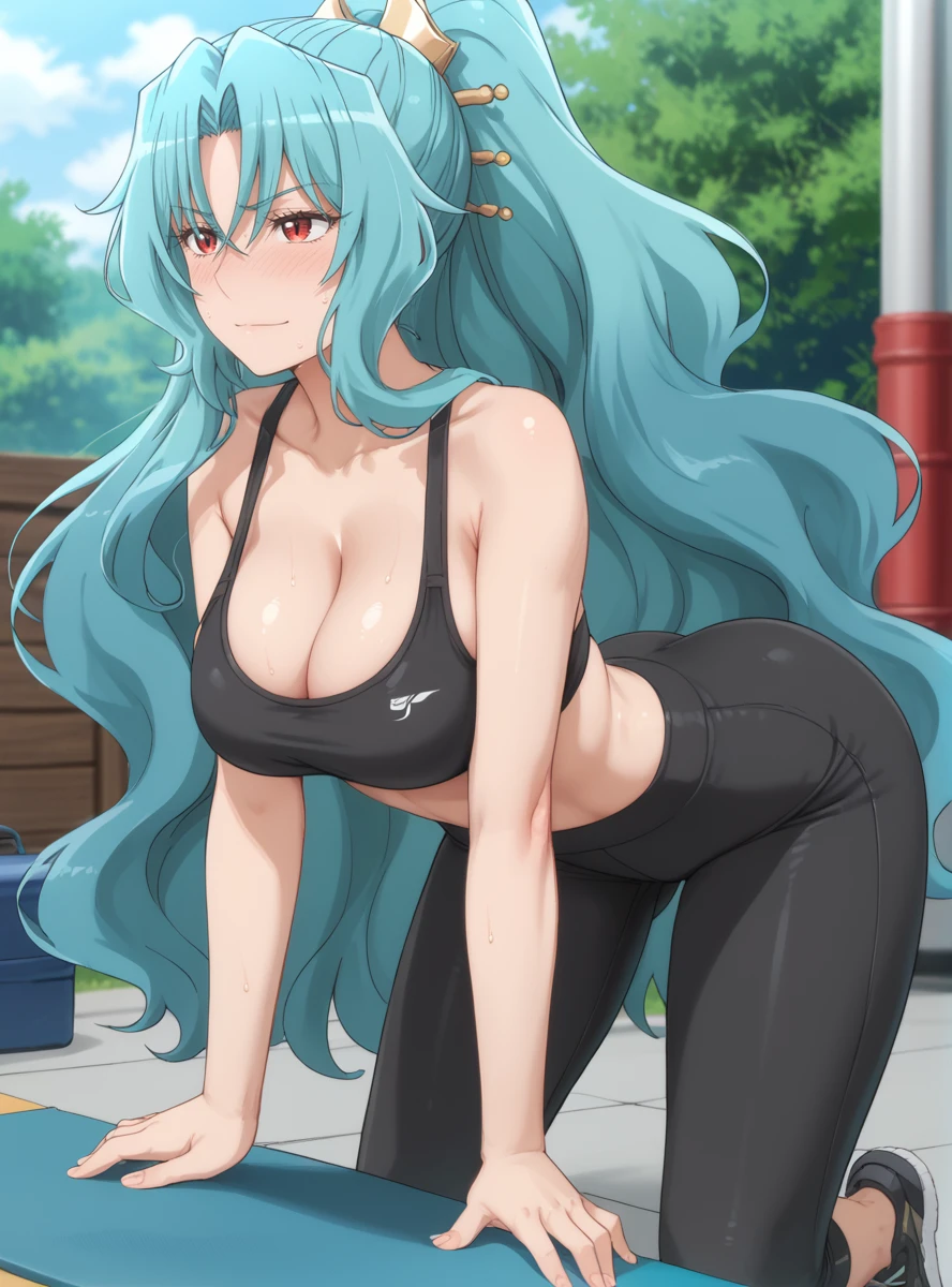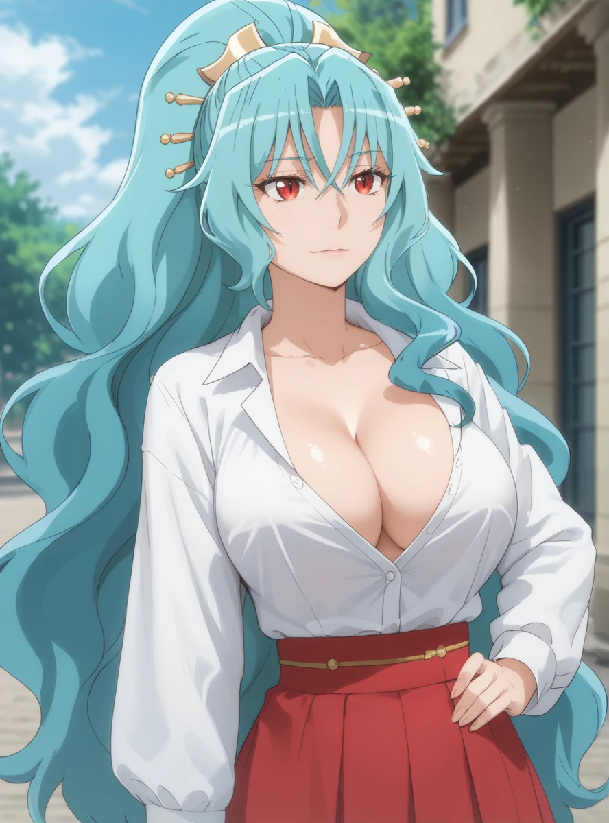 Prompt: tomoe, long hair, blue hair, red eyes, slit pupils, ponytail