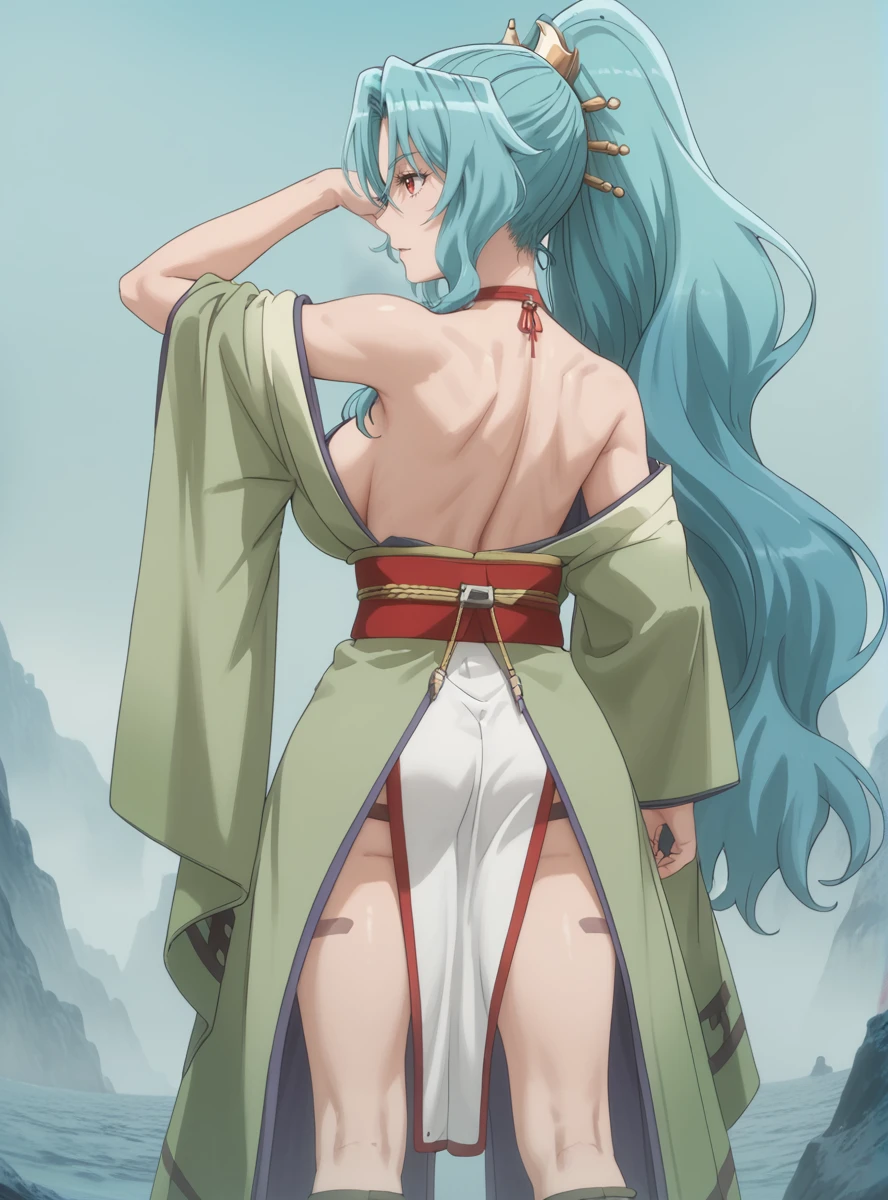 tomoe, long hair, blue hair, red eyes, slit pupils, ponytail
