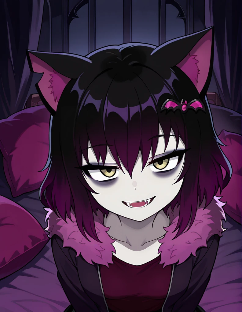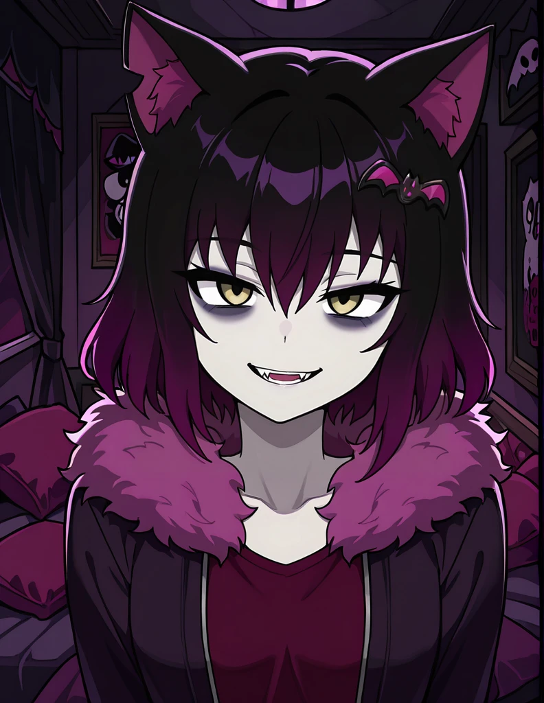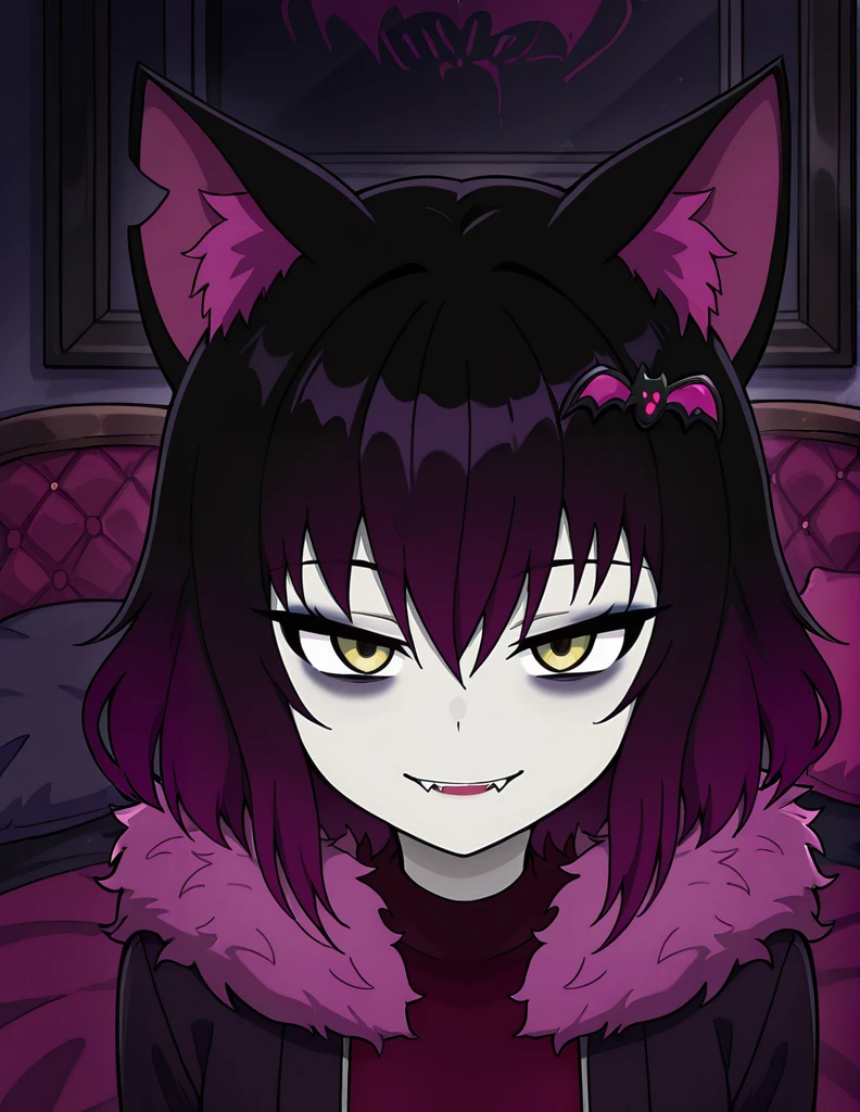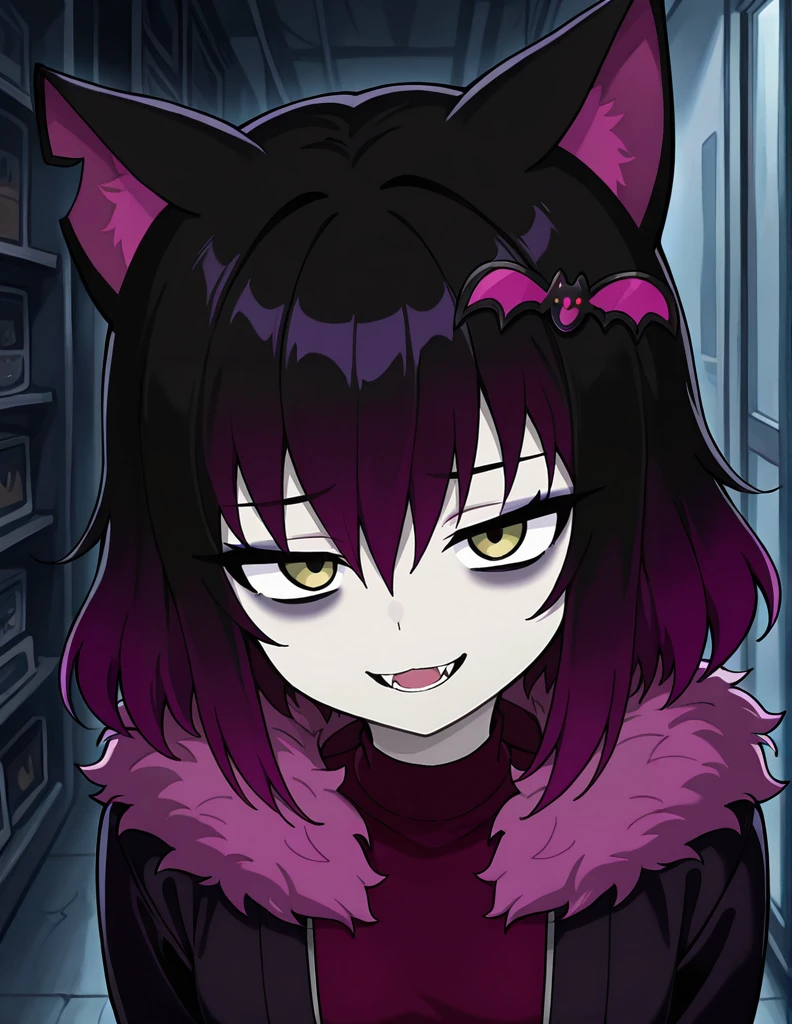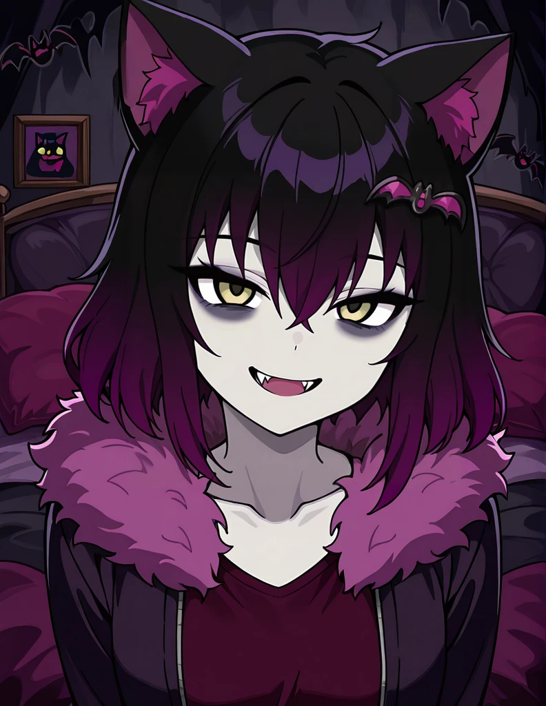 VomoriHiko, 1girl, solo, short hair, black hair, hair ornament, animal ears, yellow eyes, purple hair, multicolored hair, medium hair, cat ears, two-tone hair, gradient hair, makeup, fangs, cat girl, pale skin, eyeshadow, bags under eyes, vampire, bat (animal), jaggy lines,, bat hair ornament, bat ears,small breasts