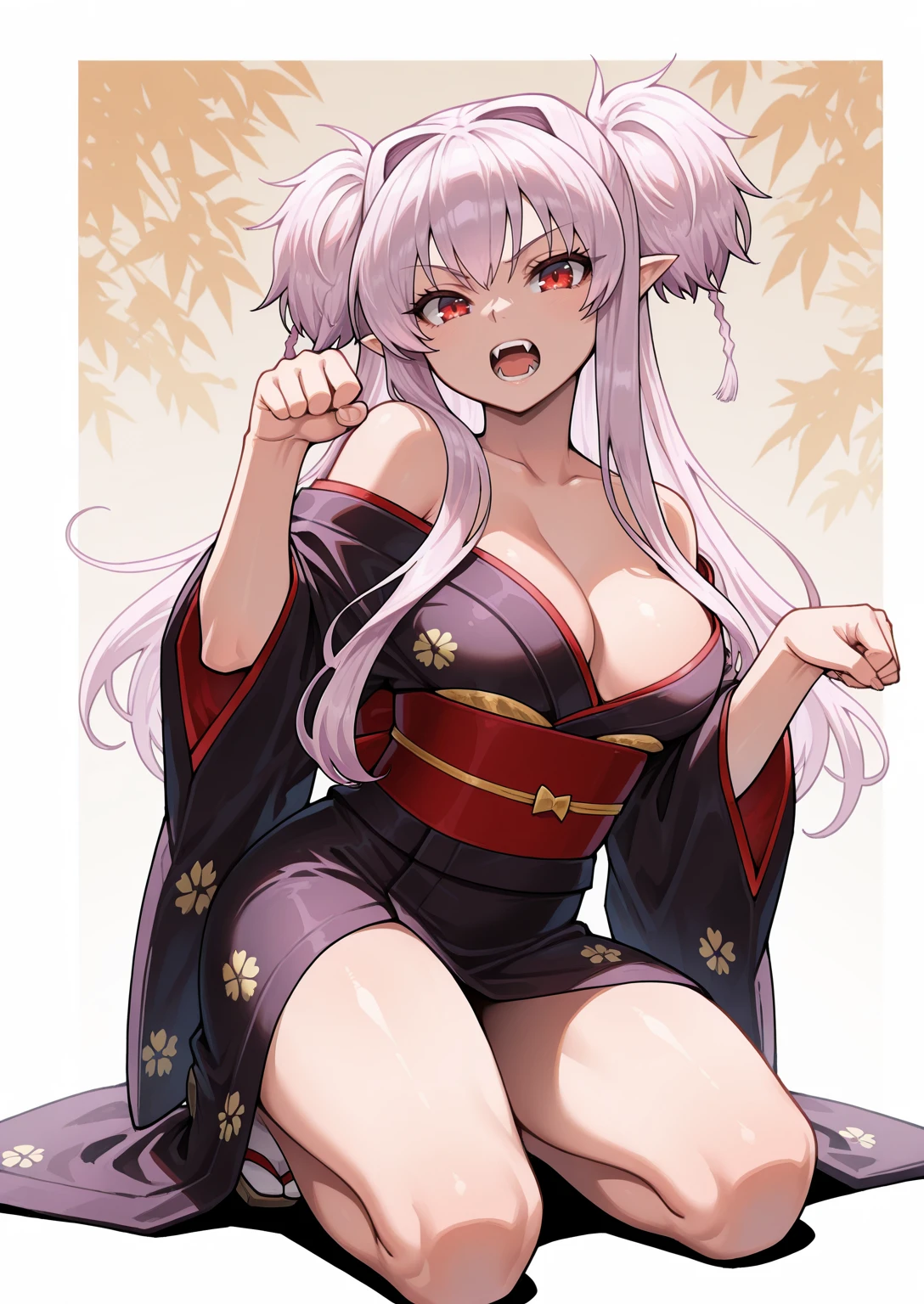 Apperance: iltwiska, long hair, purple hair, red eyes, two side up, sidelocks, pointy ears, medium breasts