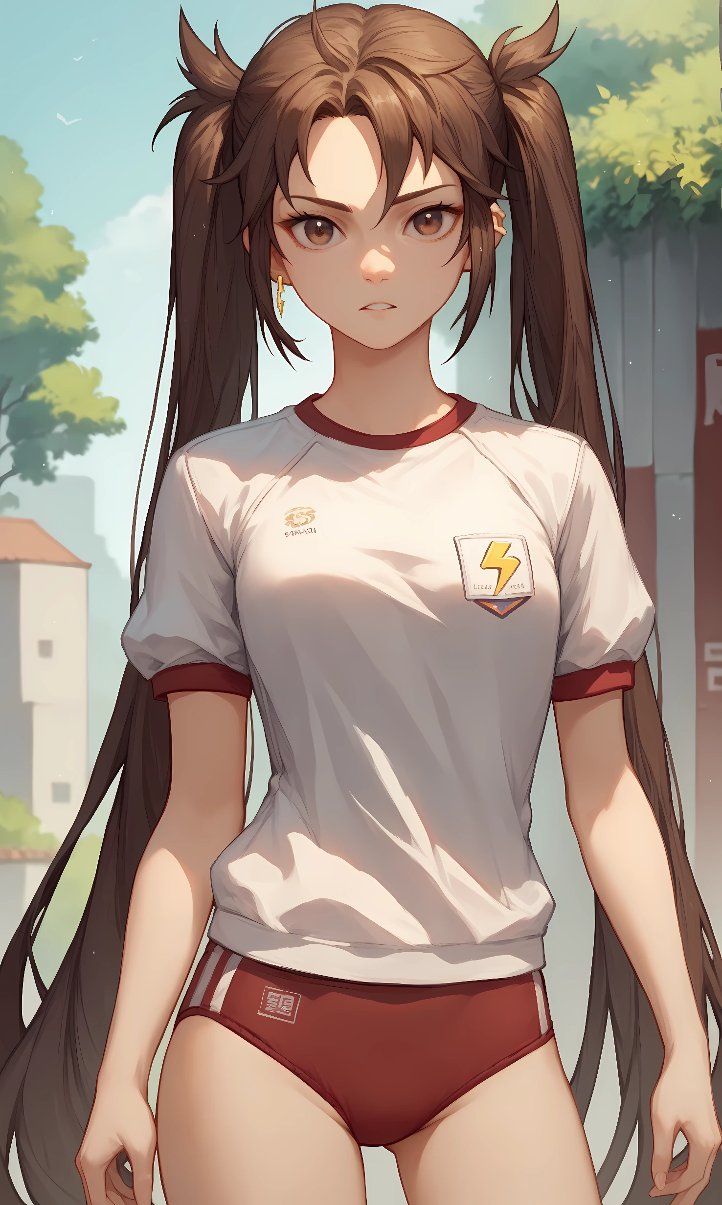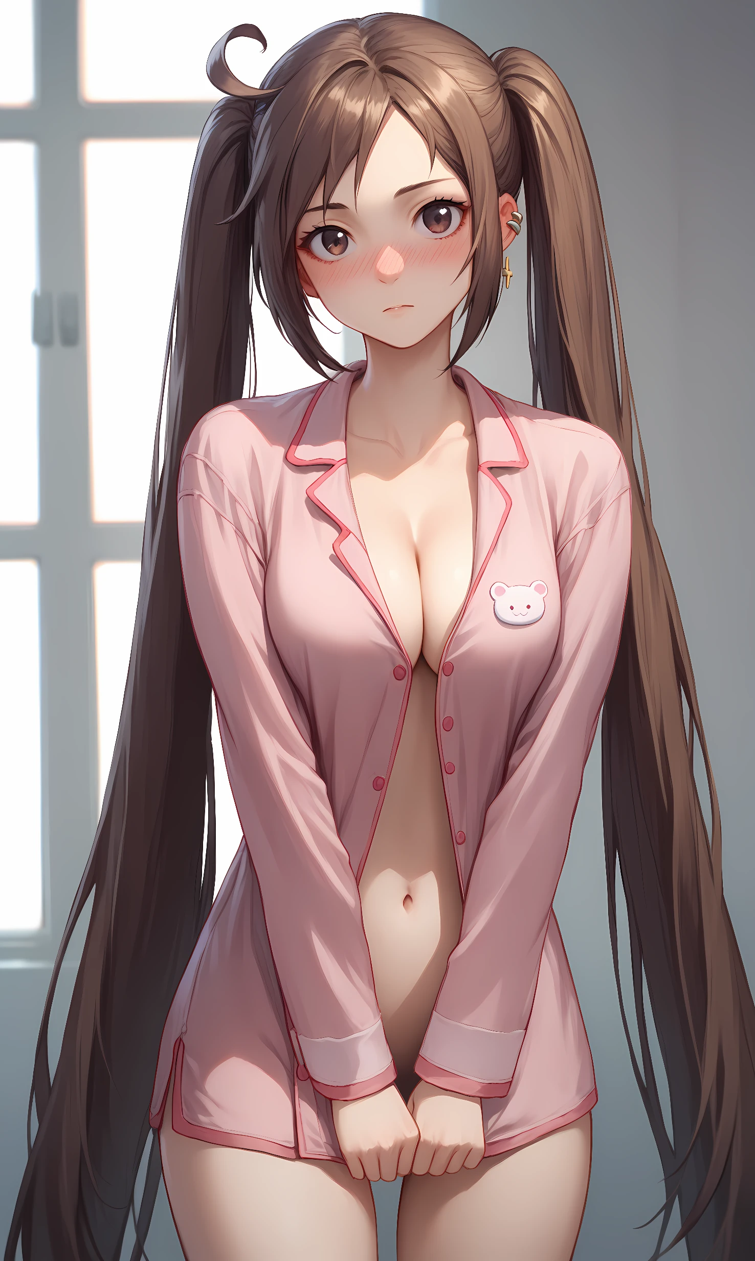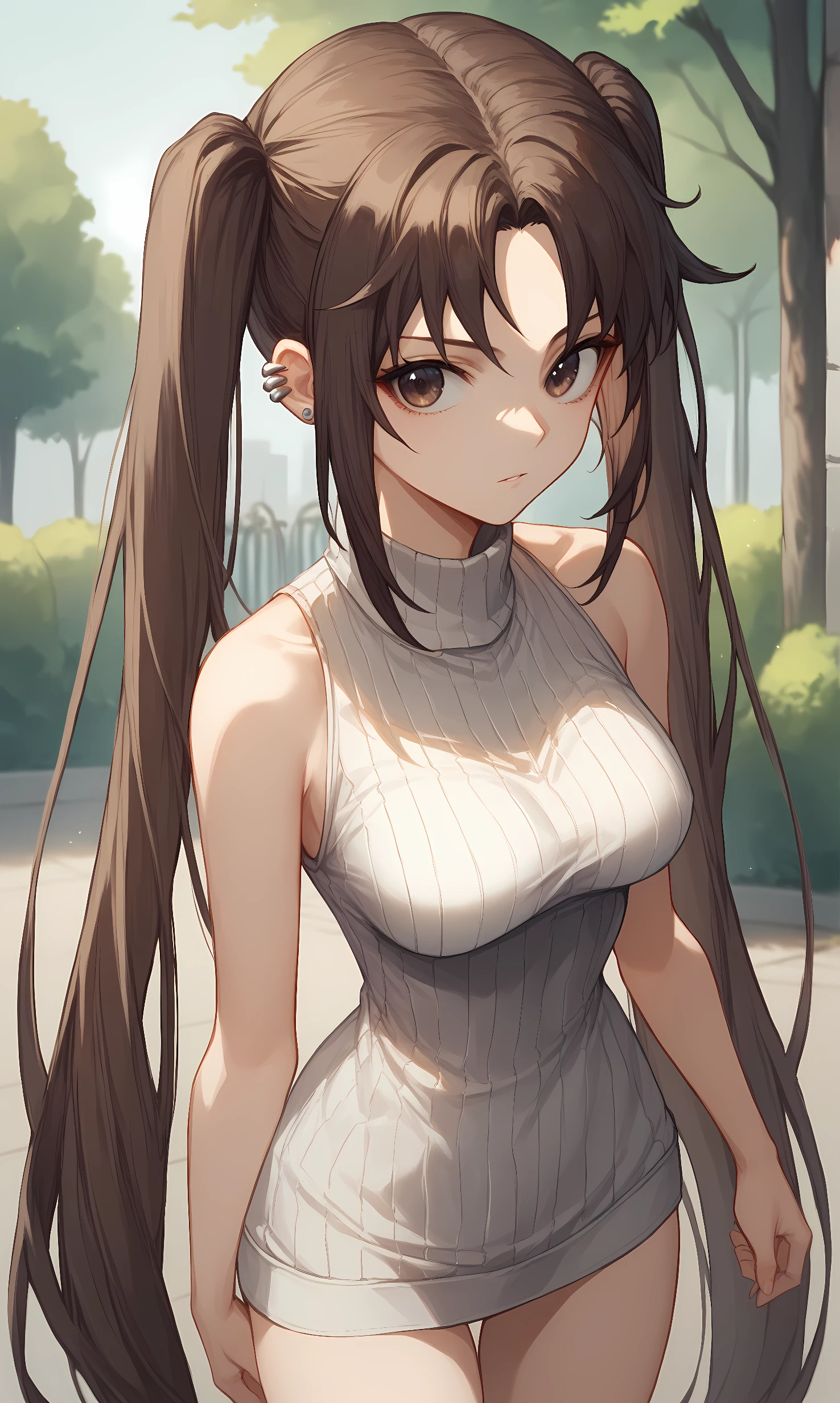 yu mei-ren, brown eyes, brown hair, very long hair, twintails, sidelocks, hair ornament, earclip