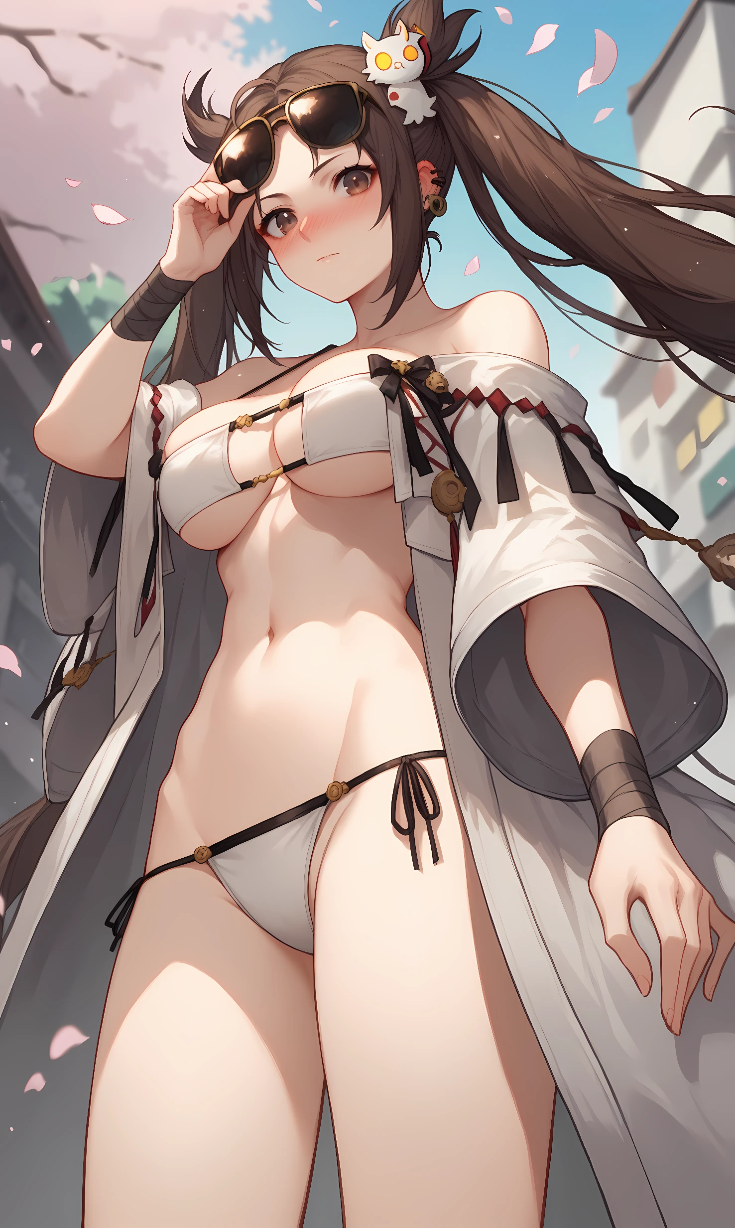 eyewear on head, sunglasses, white bikini, white robe, coat, off shoulder bikini, wide sleeves, side-tie bikini bottom, underboob, bare shoulders, wrist wrap, ribbon