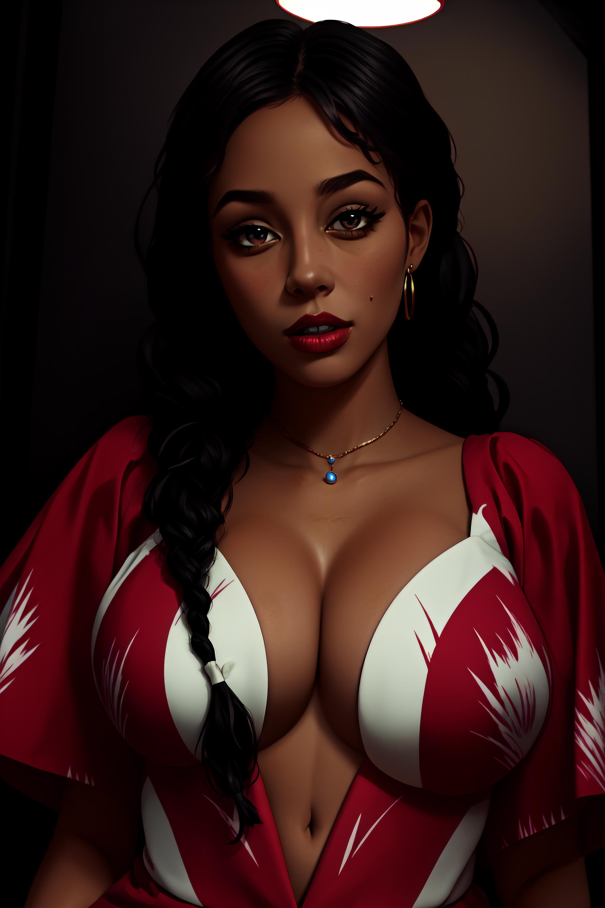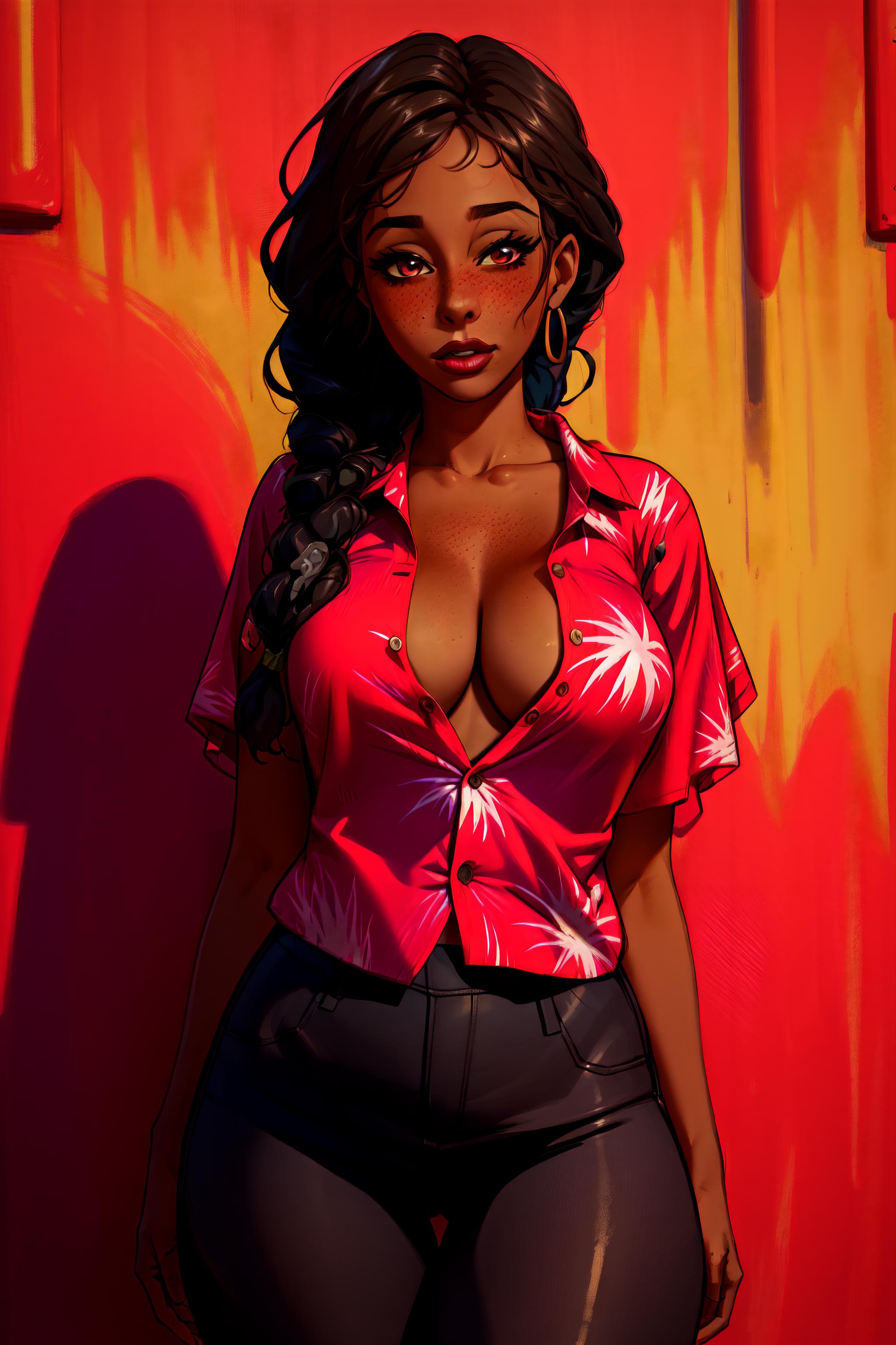 Basic prompts: 1girl,solo,red Hawaiian shirt, single braid, freckles