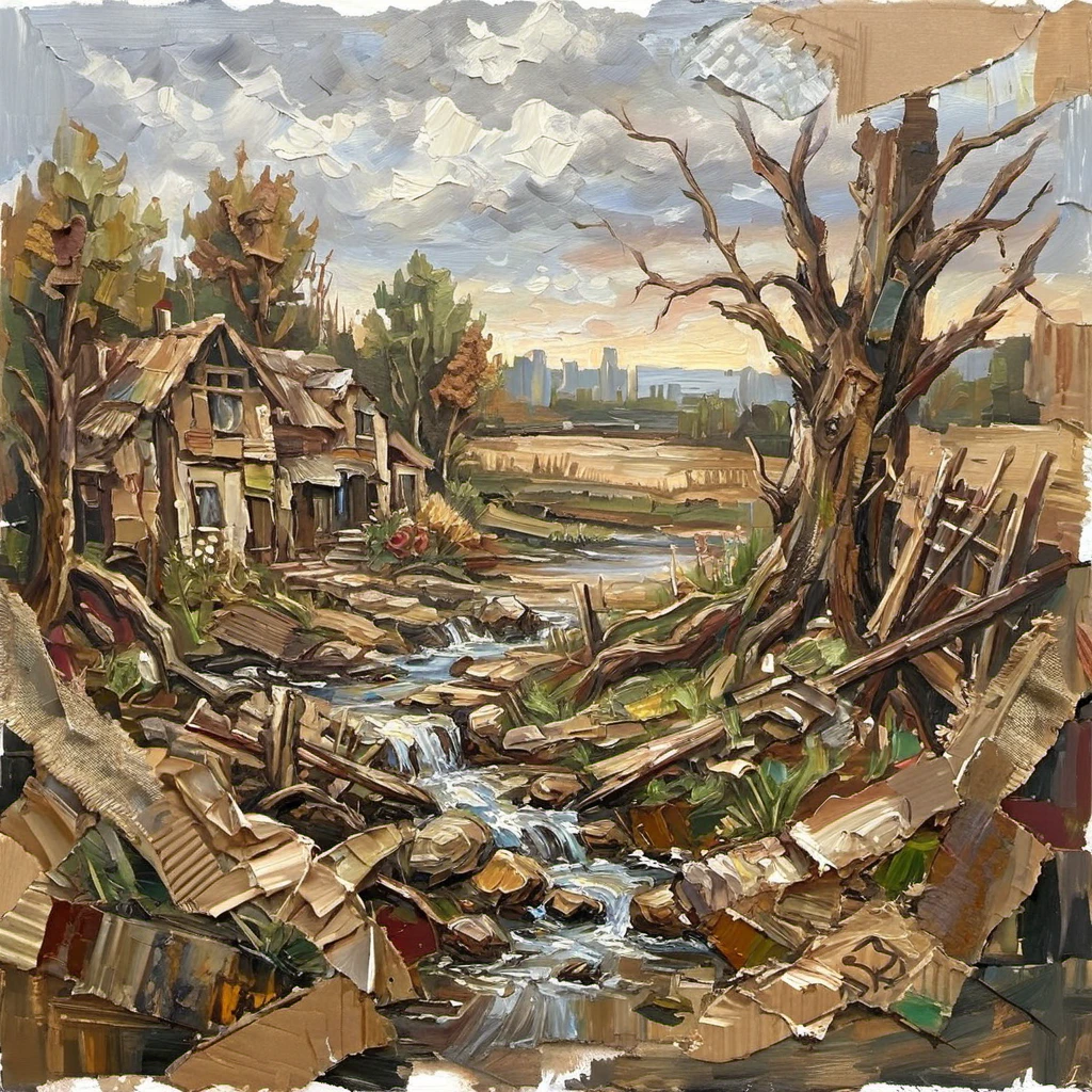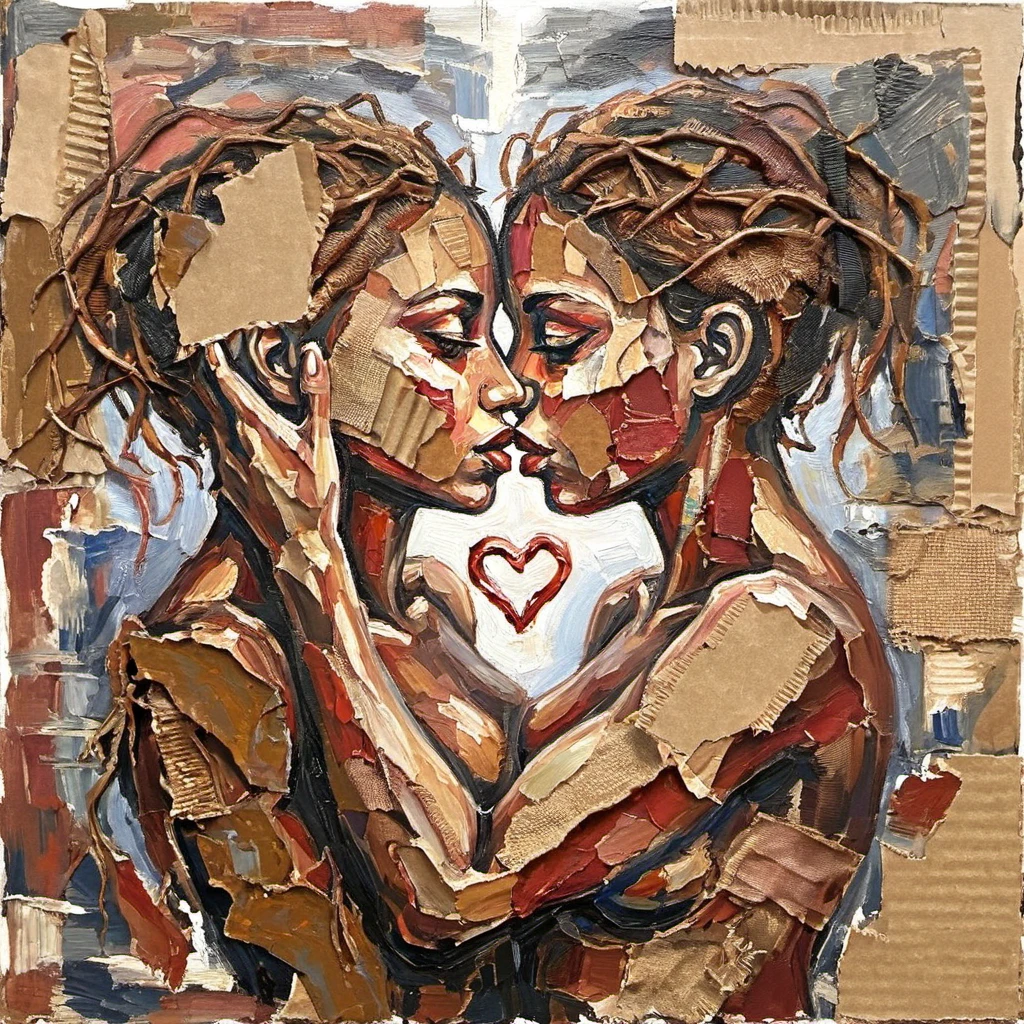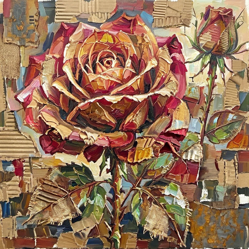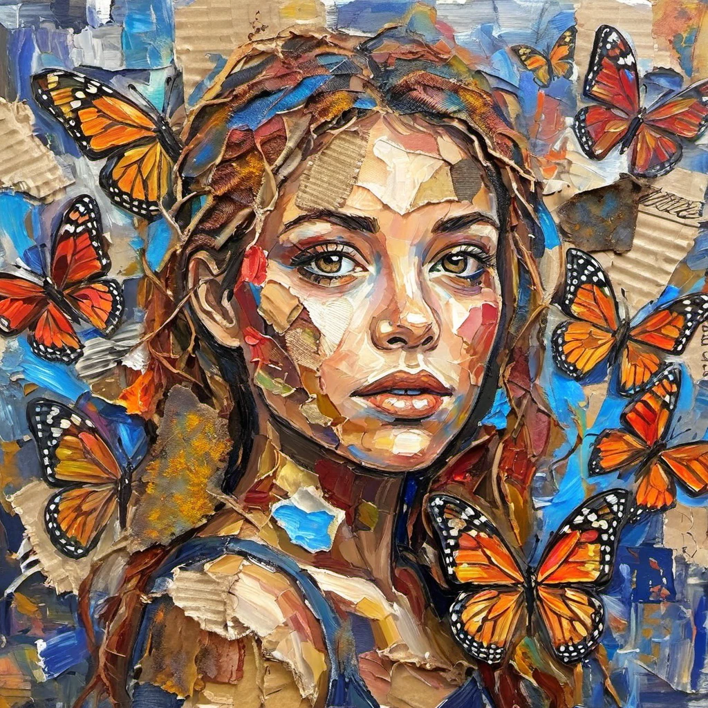 This model combines an impasto style with collage elements made from fragments of cardboard, fabric, and metal plates.