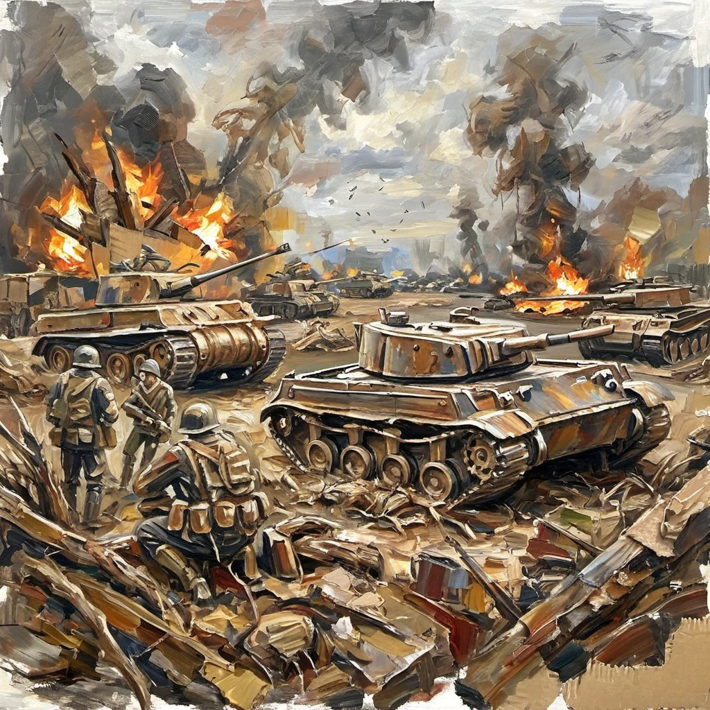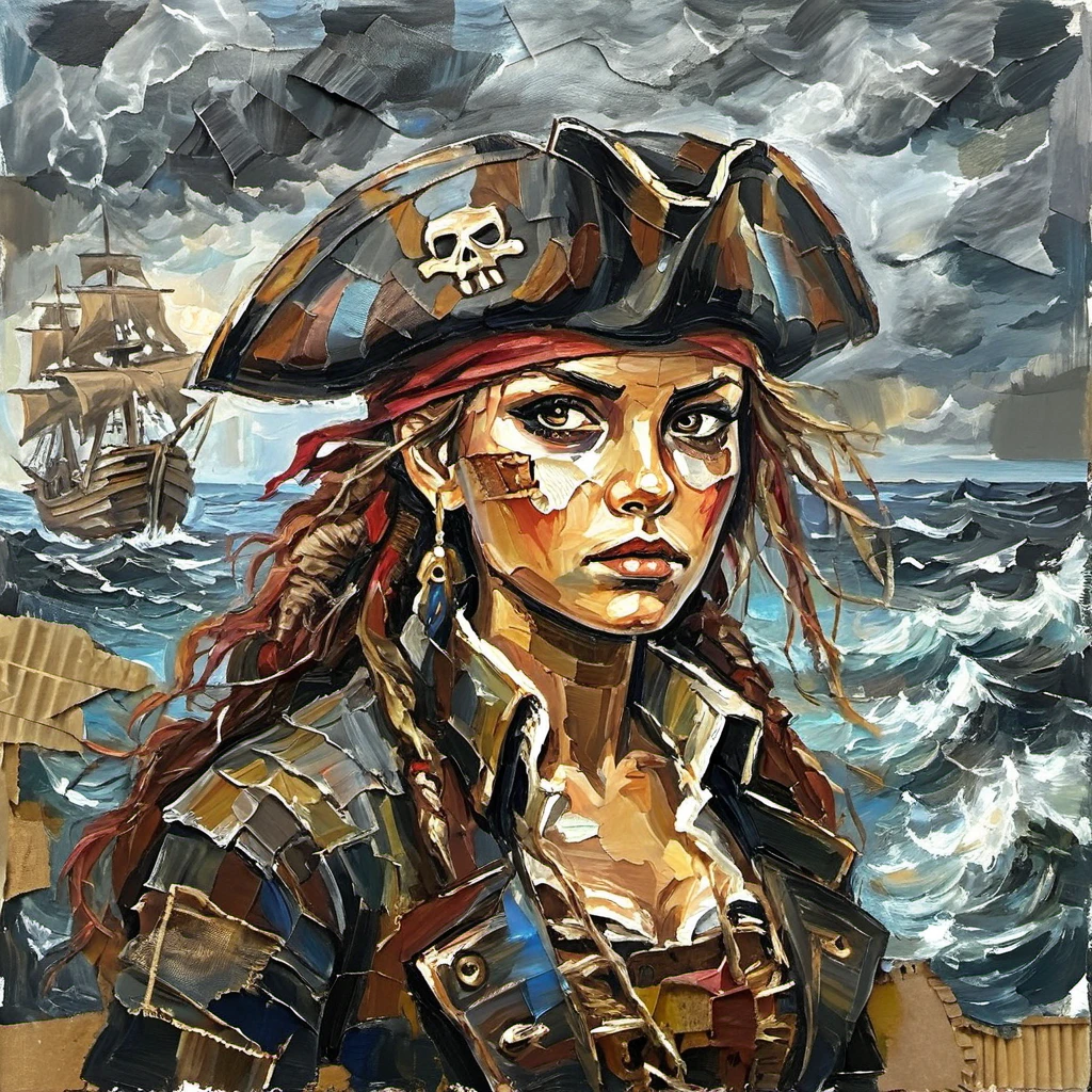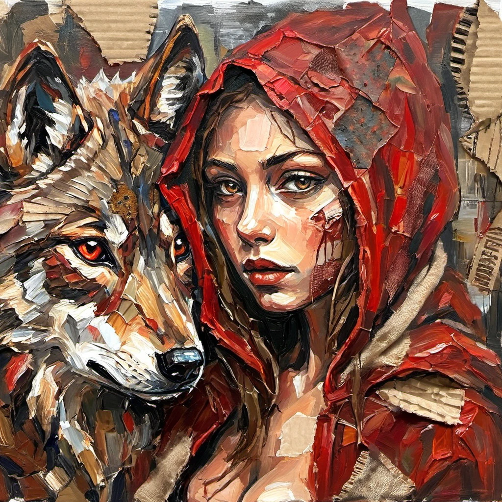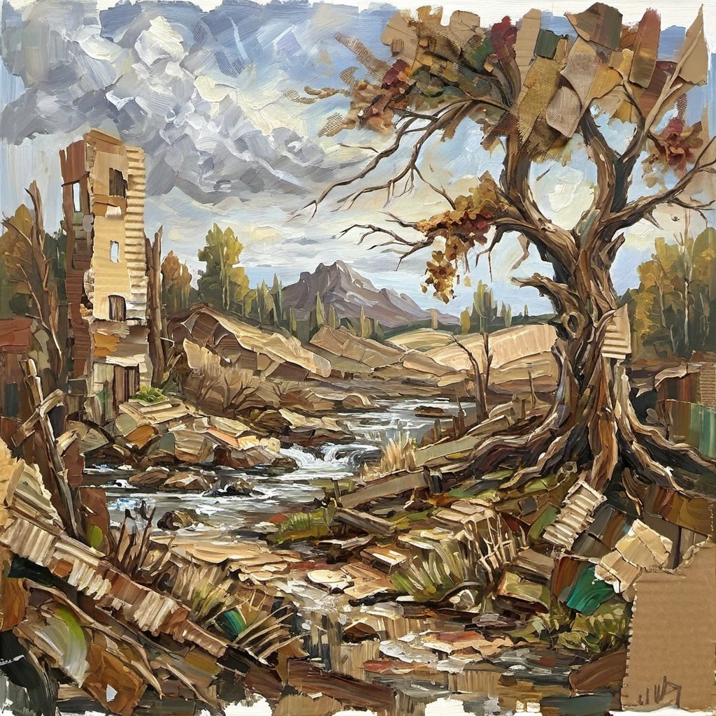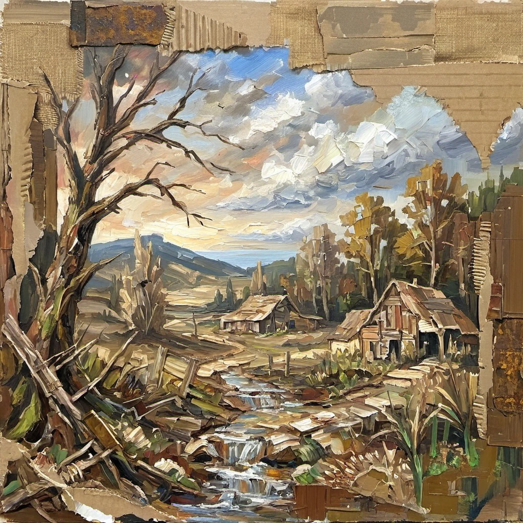 This model combines an impasto style with collage elements made from fragments of cardboard, fabric, and metal plates.