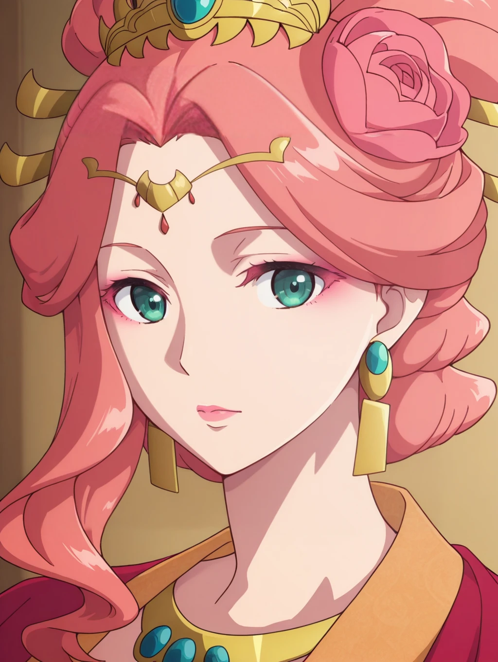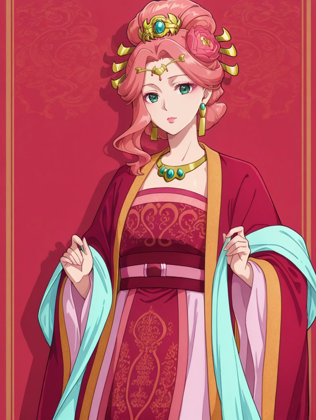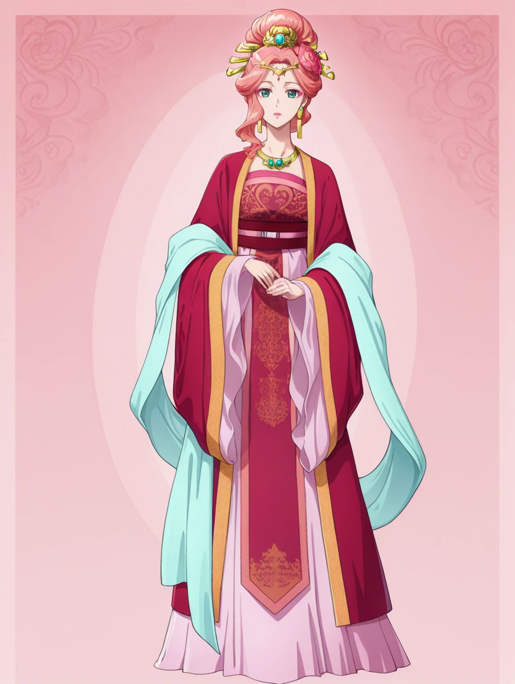 ymyy,pink hair,single sidelock,hair ornament,hair stick,hair flower,hair bun,updo,forehead jewel,green eyes,pink eyeshadow,pink lips,earrings,necklace,red robe,red hanfu,blue shawl,red sash,wide sleeves,pink skirt,