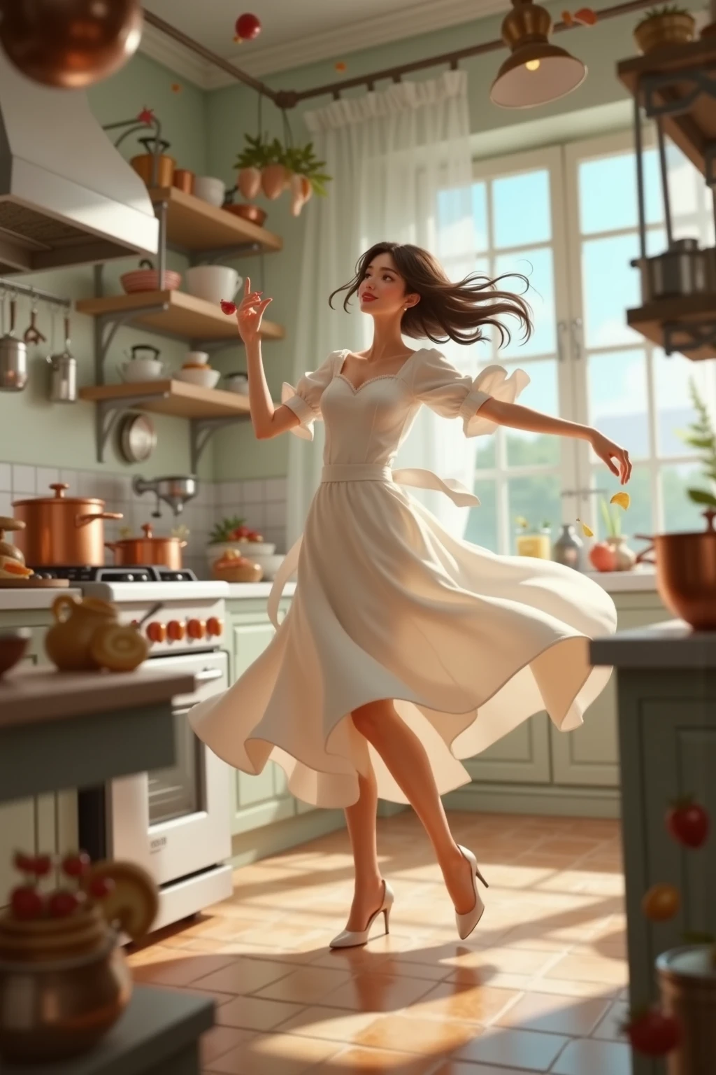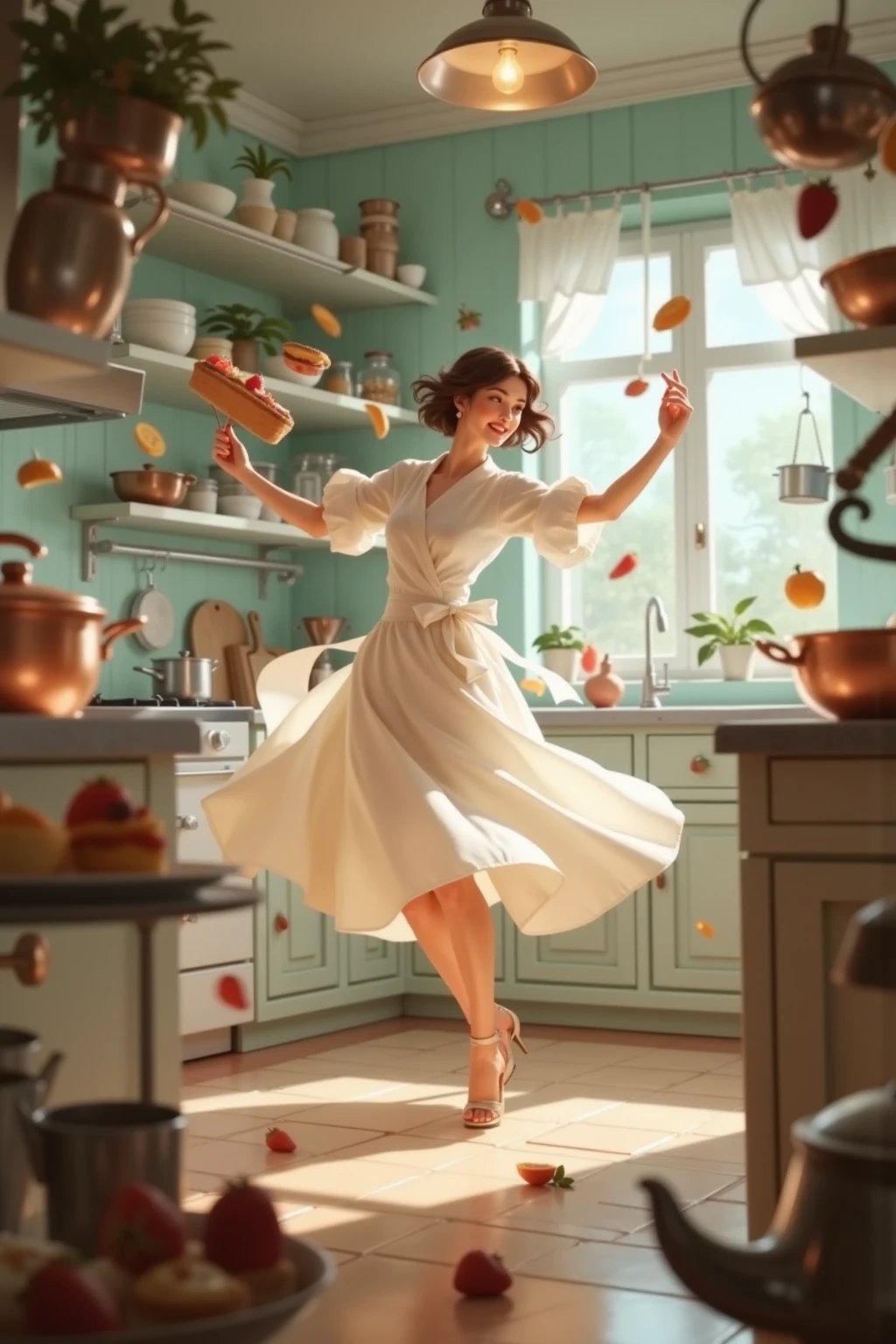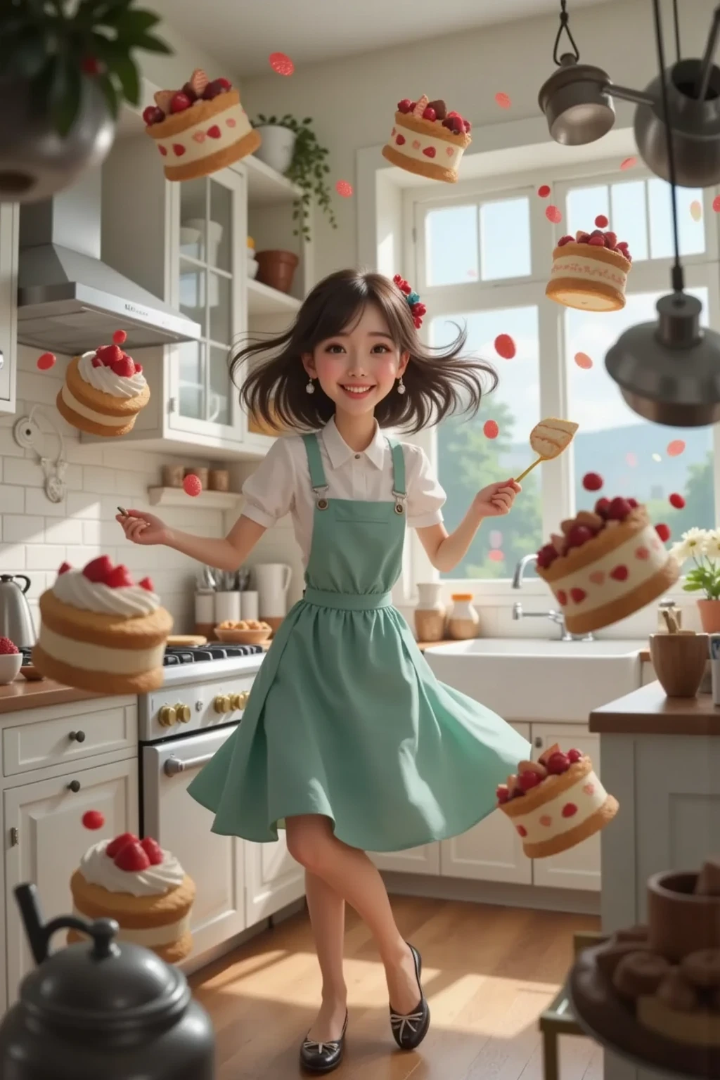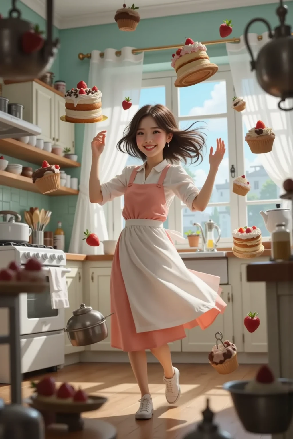 ダンシングキッチン。明るい光の差し込む広い厨房キッチンの中央に立つ若く美しい女性のコックが、白い調理服とコック帽をかぶり、右手にケーキのついたステッキ、左手に食材の入った鍋を持って軽やかな笑顔を振りまいています。背景は、彼女の周りに沢山の色とりどりの美味しそうなミニケーキやパイが宙を舞い、鍋やフライパンも踊るように浮いています。白いシェフの帽子とエプロンをつけた女性がキッチンに立っており、おたまを持ってペストリーを載せています。彼女は、ドーナツ、イチゴ、ピンクのフロスティングとチェリーをトッピングしたカップケーキなど、さまざまなペストリーに囲まれています。キッチンにはさまざまな調理器具が備え付けられ、明るい照明がシーンに温かみのある光を投げかけています。画像のスタイルは気まぐれで、女性とペストリーに焦点を当てています。