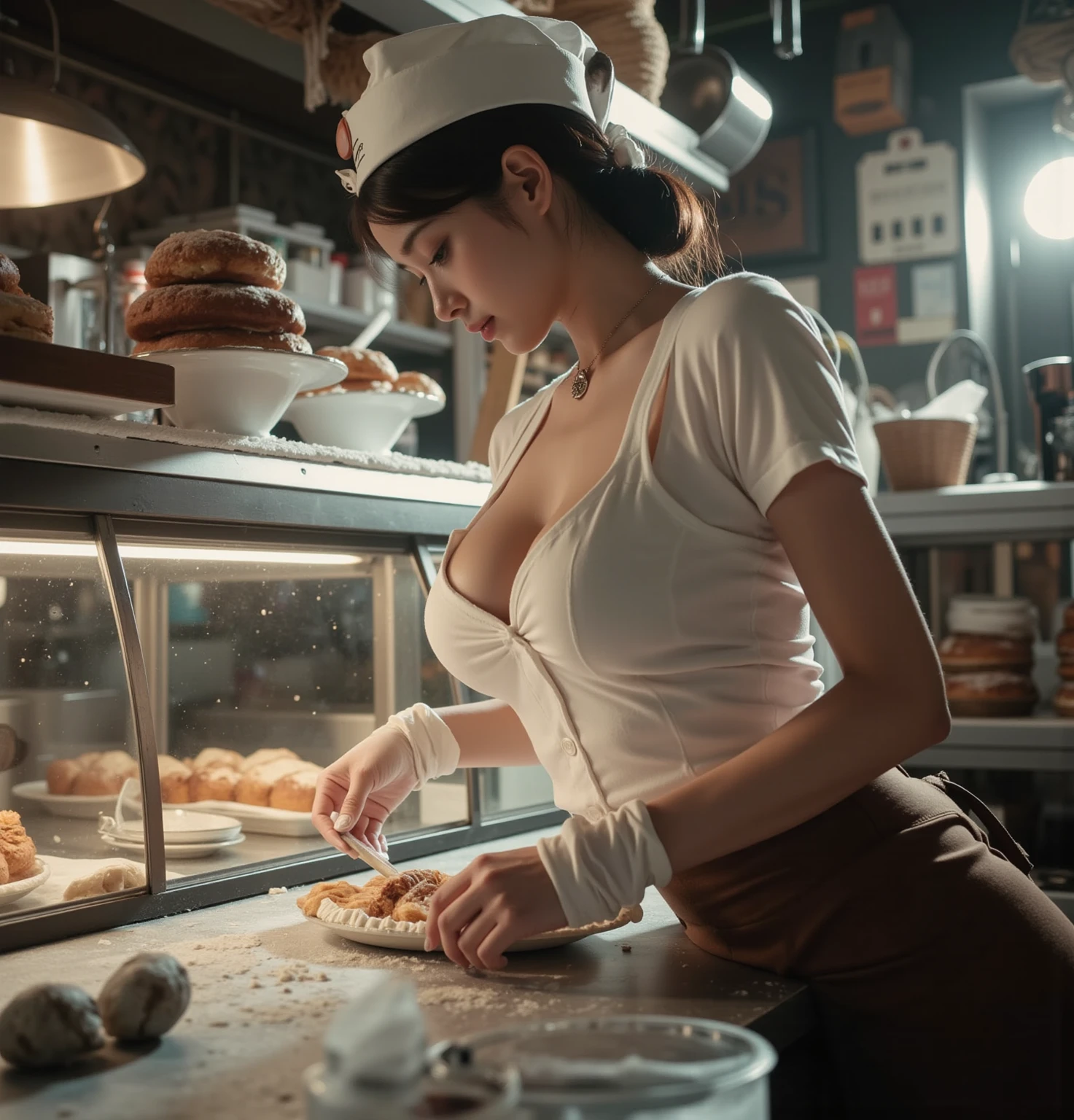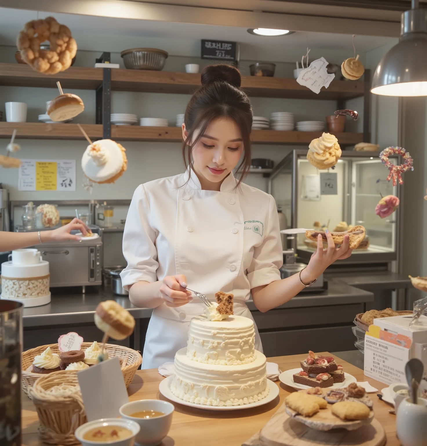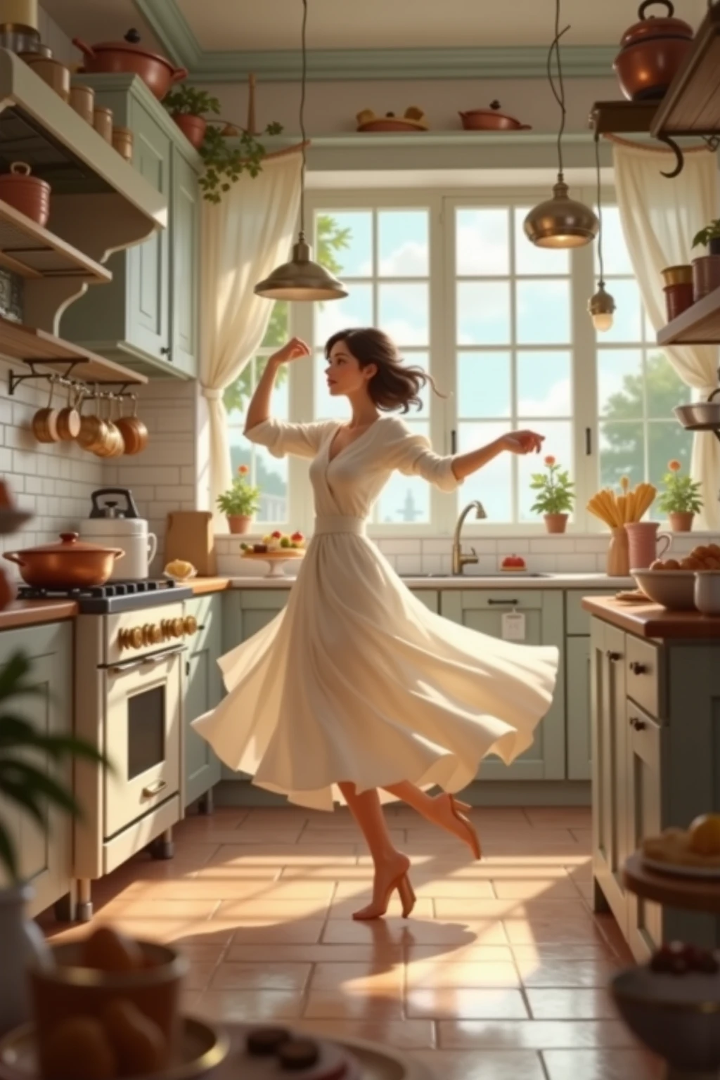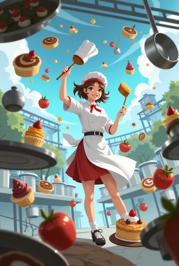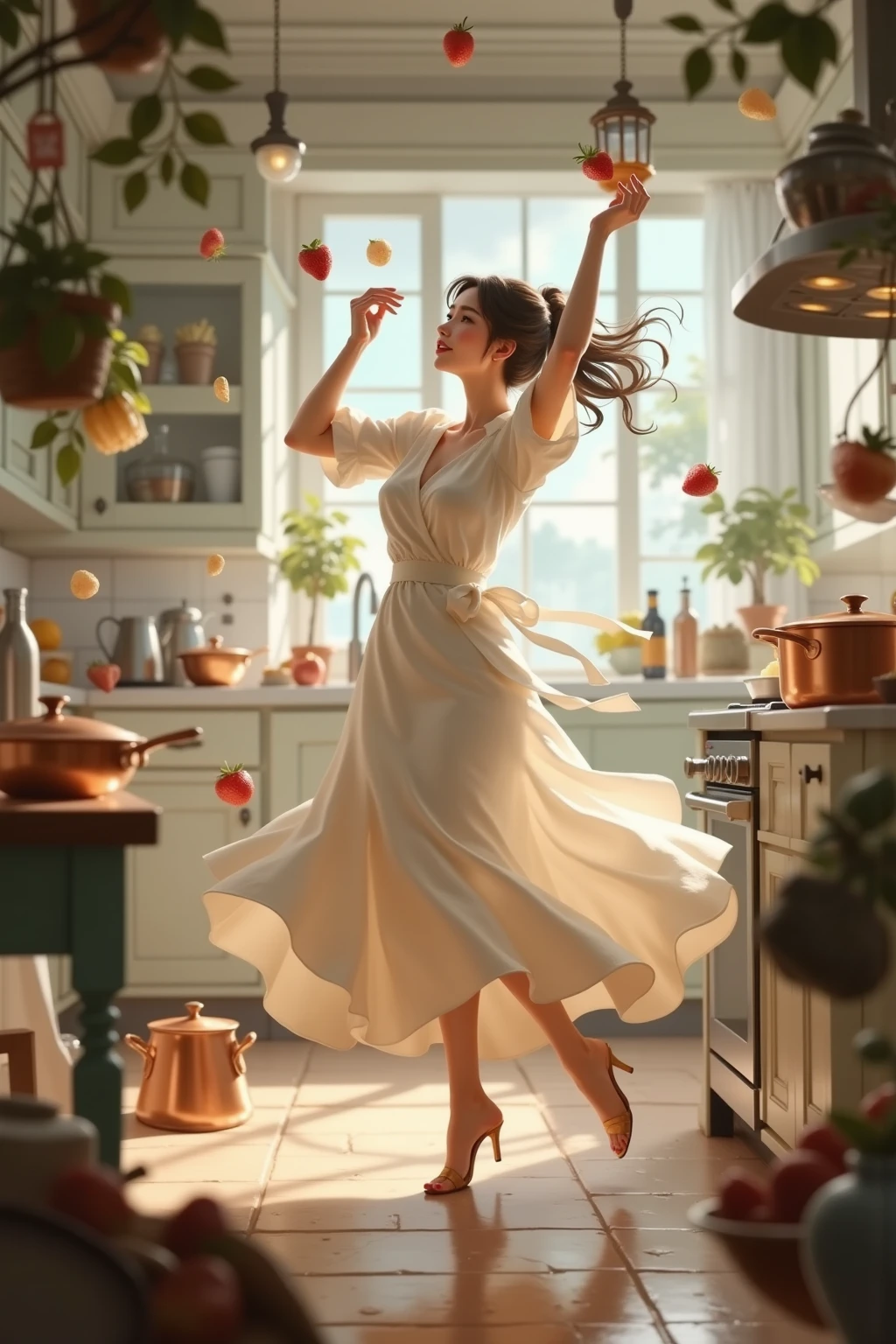 ダンシングキッチン。明るい光の差し込む広い厨房キッチンの中央に立つ若く美しい女性のコックが、白い調理服とコック帽をかぶり、右手にケーキのついたステッキ、左手に食材の入った鍋を持って軽やかな笑顔を振りまいています。背景は、彼女の周りに沢山の色とりどりの美味しそうなミニケーキやパイが宙を舞い、鍋やフライパンも踊るように浮いています。白いシェフの帽子とエプロンをつけた女性がキッチンに立っており、おたまを持ってペストリーを載せています。彼女は、ドーナツ、イチゴ、ピンクのフロスティングとチェリーをトッピングしたカップケーキなど、さまざまなペストリーに囲まれています。キッチンにはさまざまな調理器具が備え付けられ、明るい照明がシーンに温かみのある光を投げかけています。画像のスタイルは気まぐれで、女性とペストリーに焦点を当てています。