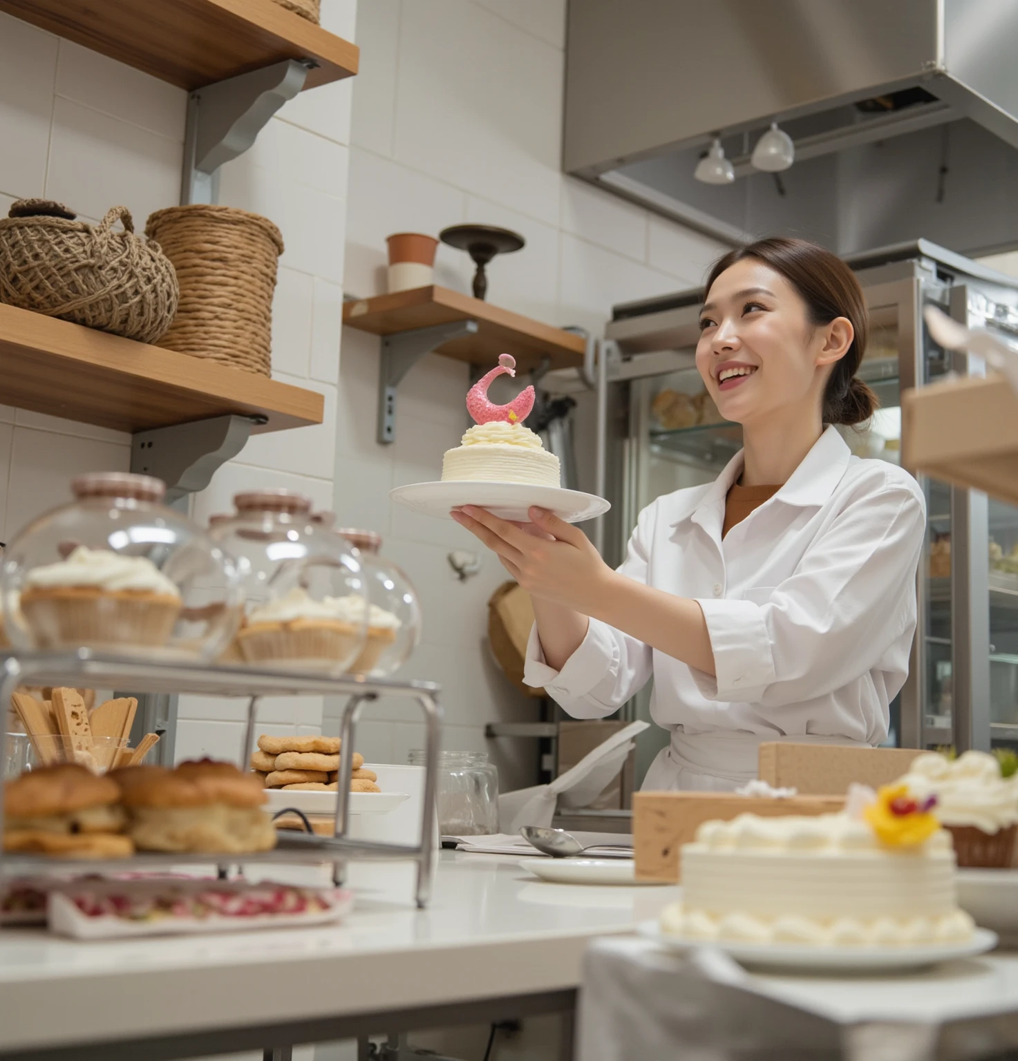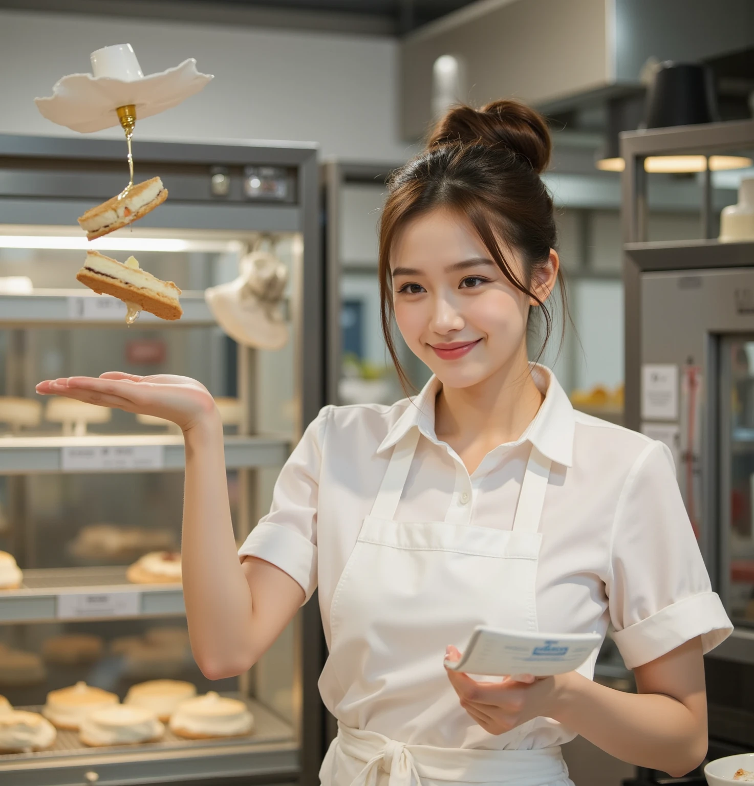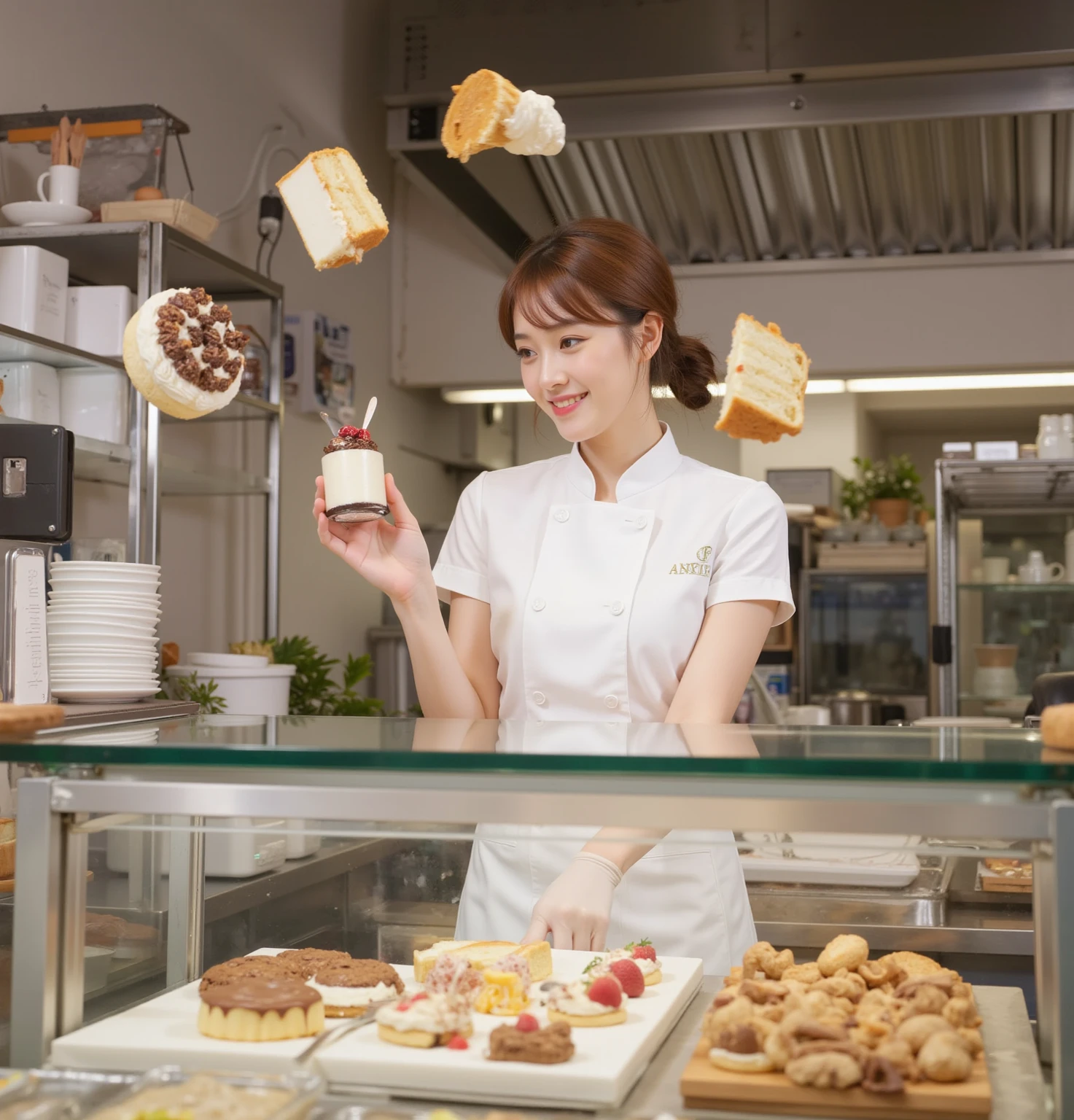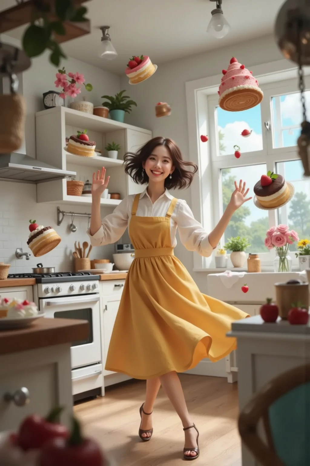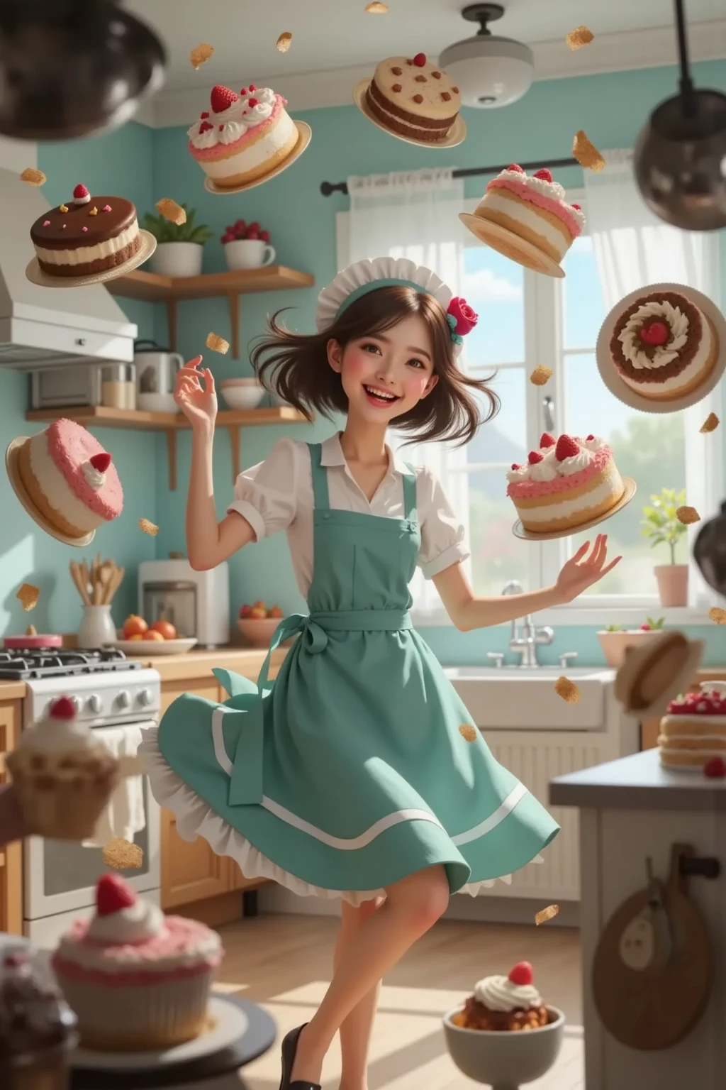 女性の笑顔,厨房で踊る女性の周りを宙に舞うケーキ