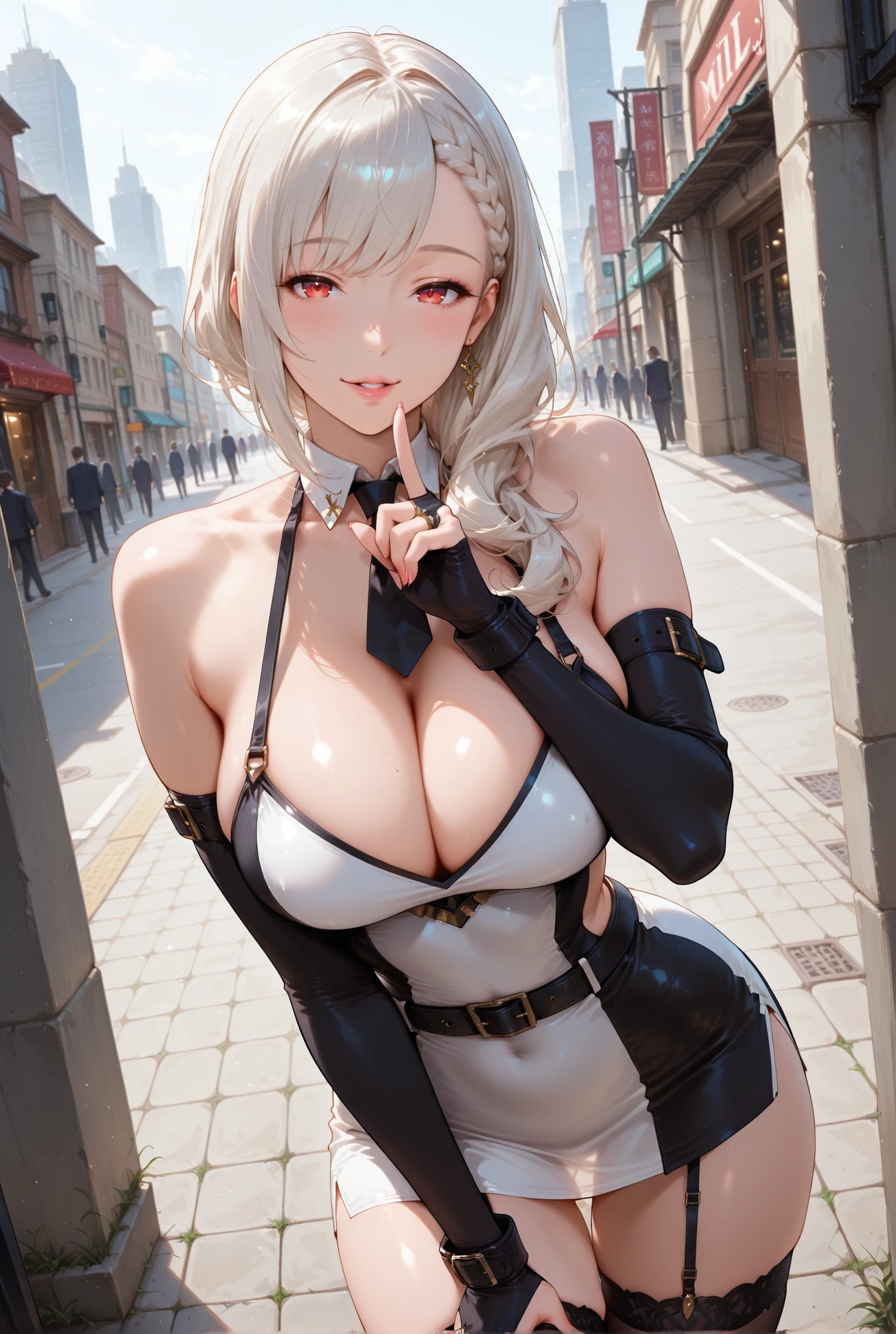 Zeliska (red eyes, white hair, long hair, hair on one side, swept bangs, asymmetrical hair,braided bangs, milf,mature female)
