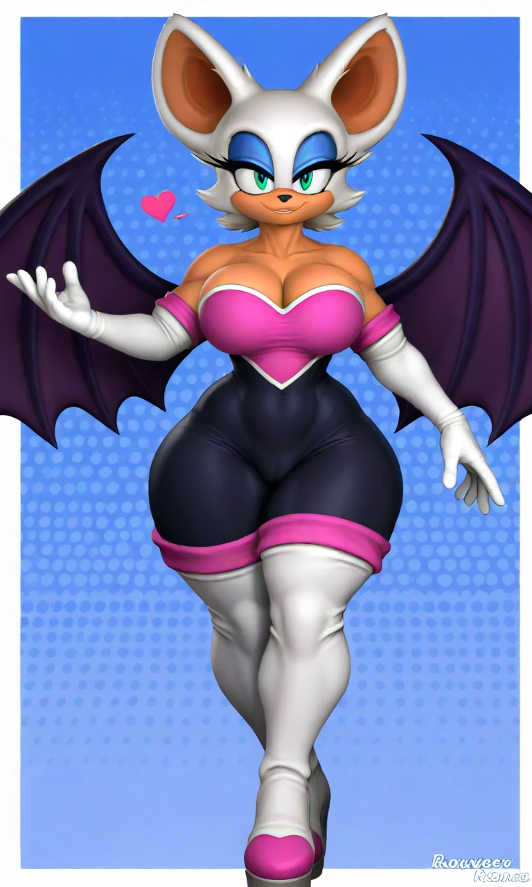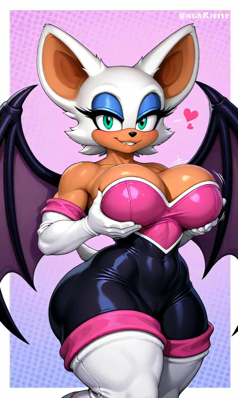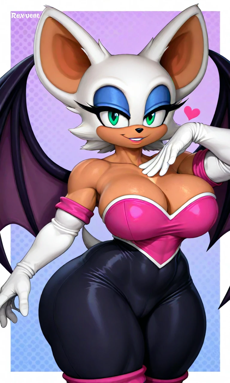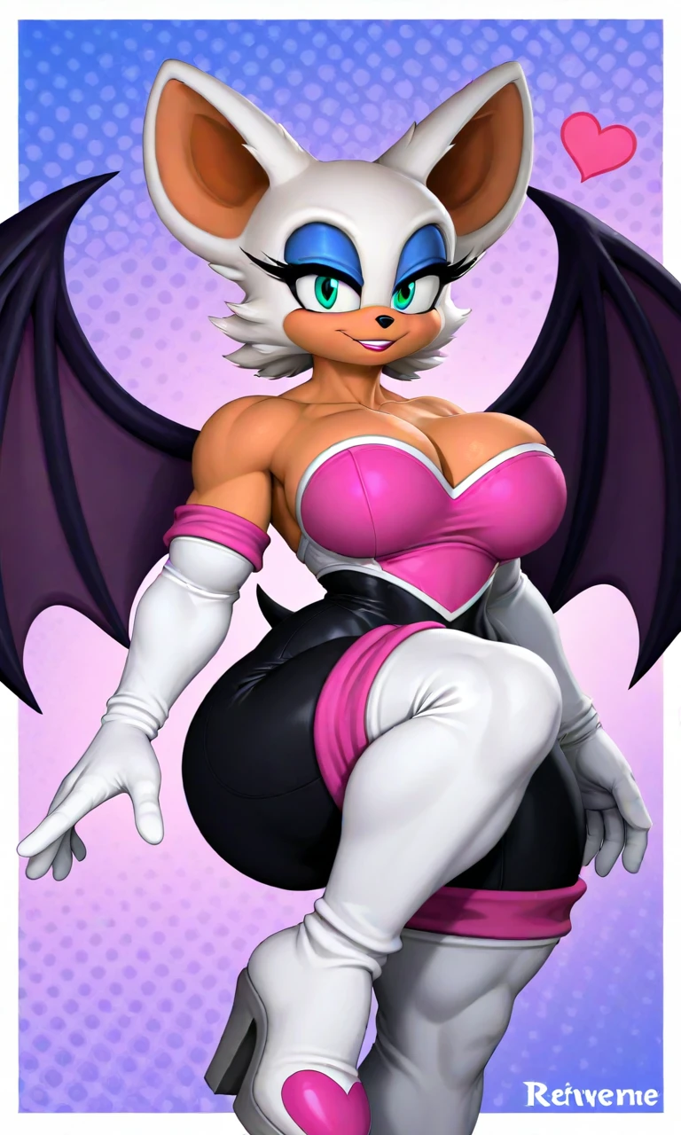 tags: rouge_Reivene, white fur, tan skin, teal-green eyes, bat ears, blue eyeshadow, bat wings, black bodysuit, bare shoulders, pink heart-shaped chestplate, white gloves, white heels with pink cuffs,
