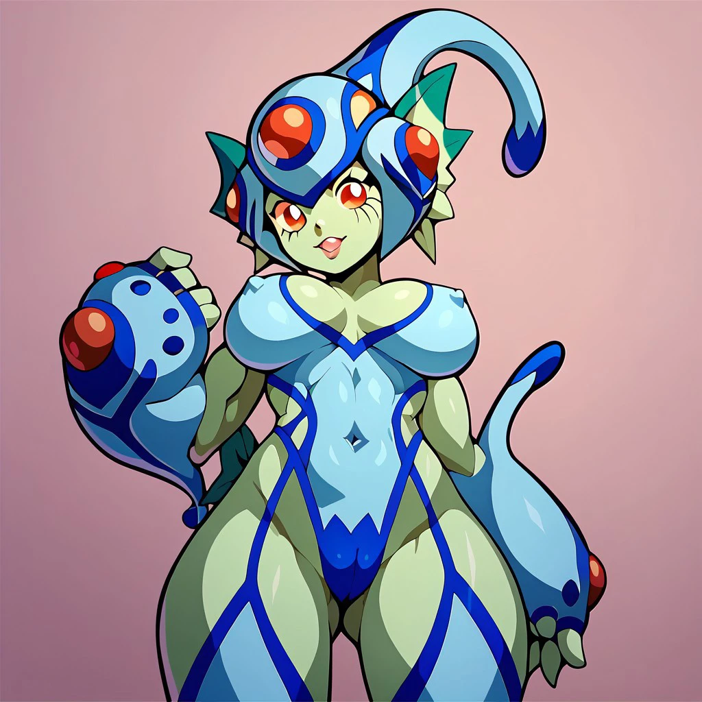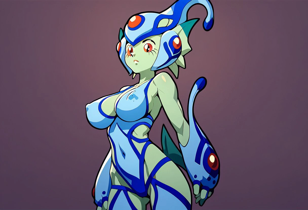 Ranamon, digimon, green skin, red eyes, monster girl, large breasts, colored skin, gloves, fingerless gloves, helmet, cleavage, head fins