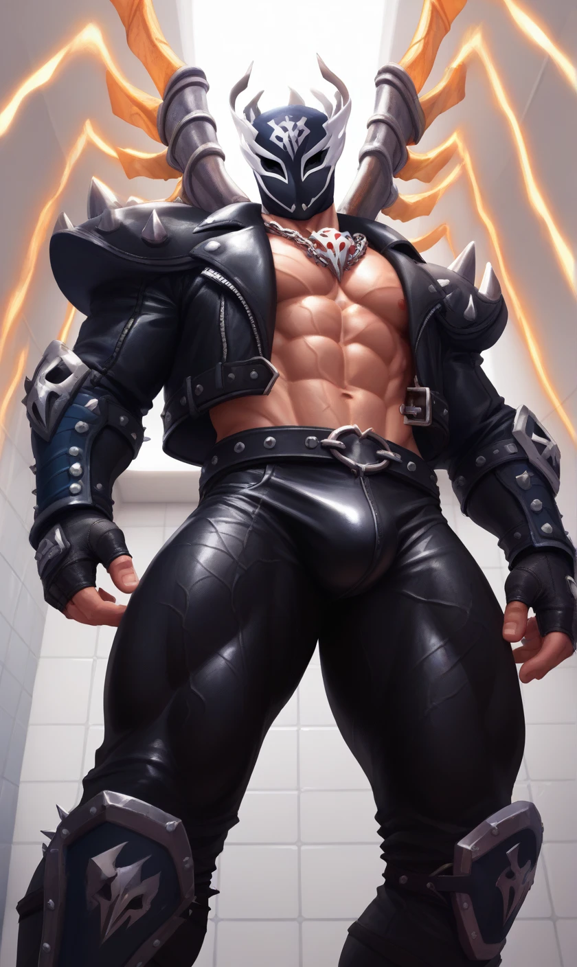 Trigger words : El bandido Imperious, muscly, open jacket, armored pants, necklace chain, shoulder pads, bright wings, Masked, black clothes, masked, leather mask, abs, 1boy