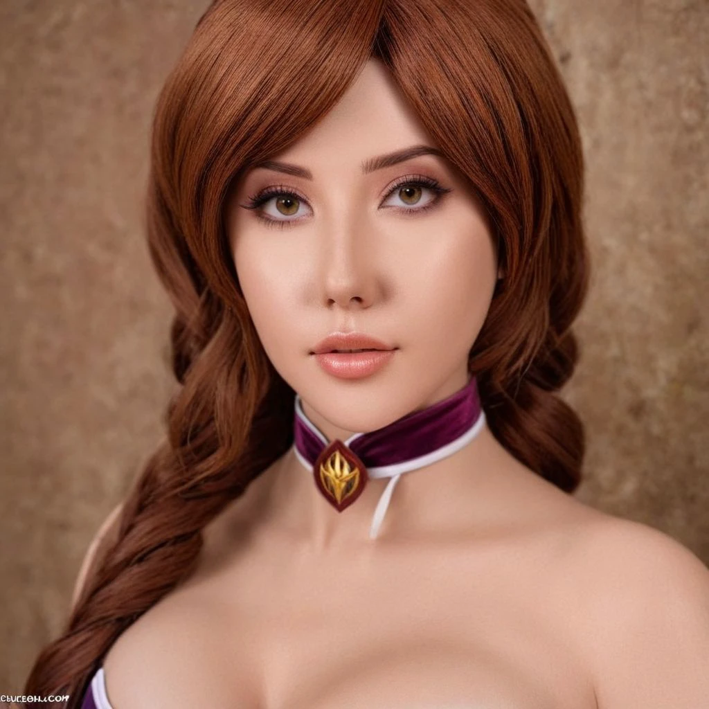 annaifert, cosplayeranna, cosplayerannaifert, 1girl, solo, long hair, looking at viewer, large breasts, brown hair, brown eyes, jewelry, upper body, parted lips, choker, hood, necklace, lips, realisticEnjoy!