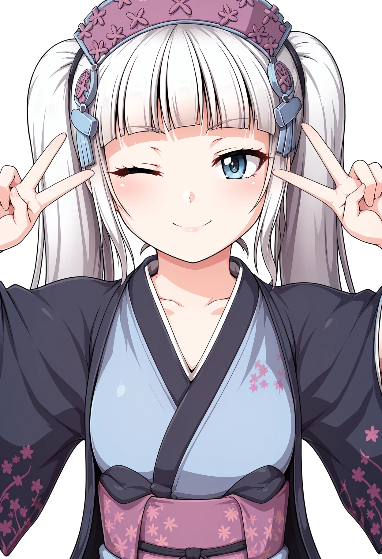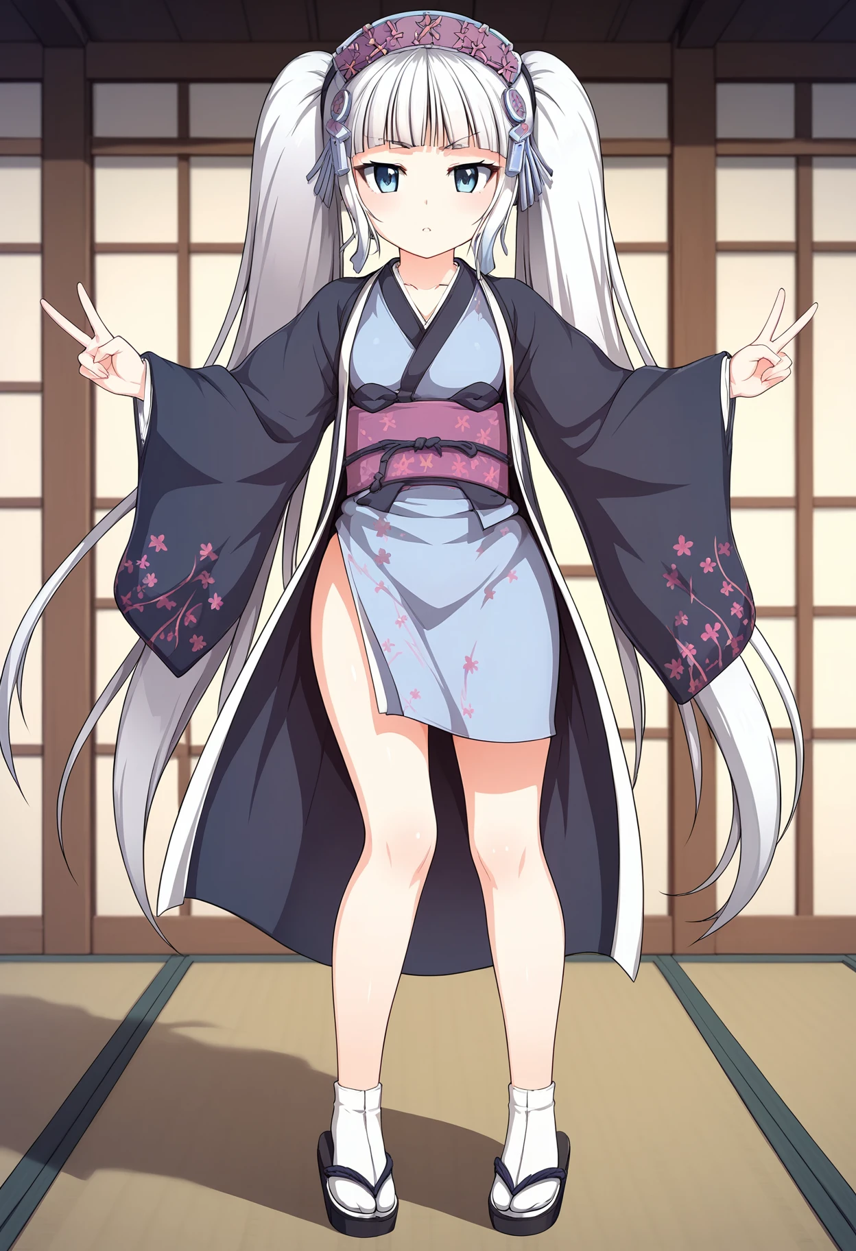 2) long hair, white hair, twintails, bangs, blunt bangs, (for appearance)